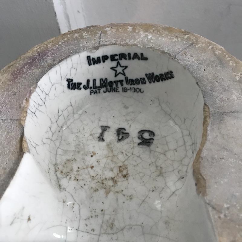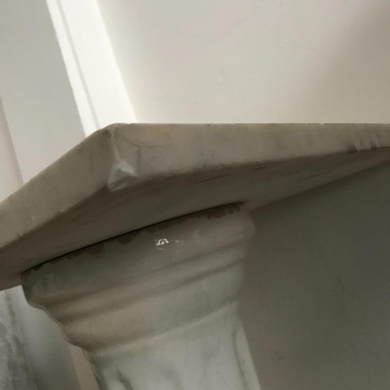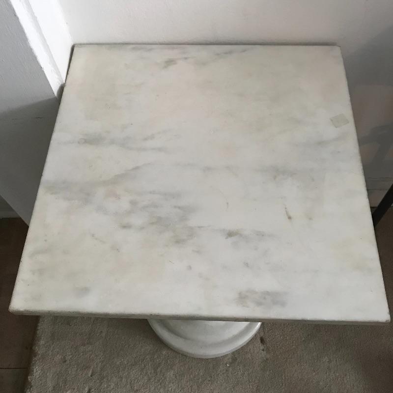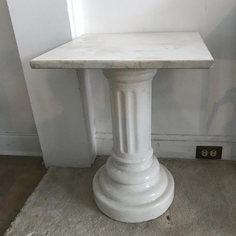 Gorgeous two piece table measuring approximately 18” x 18.5” x 23.5”. The top is a beautiful white and gray marble top with a tiny, hardly noticeable chip in one corner, see photos. The Imperial base is bright with a crackle pourcelain finish overclay mold by JL Mott Iron Works. No shipping.
