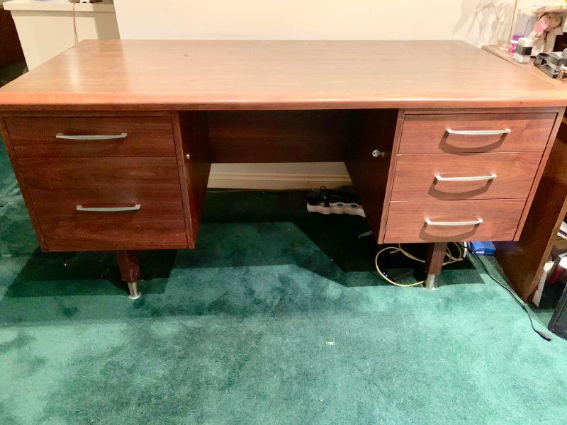 MCM double pedestal desk. 2 tone laminate and wood top, center drawer and on the left side a drawer and a double file drawer. Right side has 3 drawers. Metal drawer pulls and metal column legs. Tierman's of Pomona 5' long x 30" wide 29" deep. Solidly built.