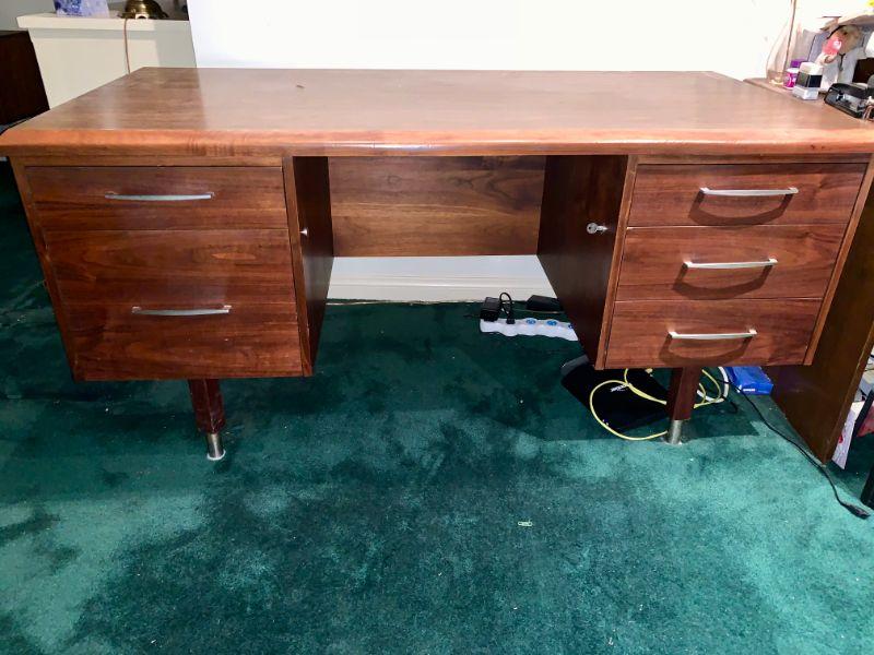 MCM double pedestal desk. 2 tone laminate and wood top, center drawer and on the left side a drawer and a double file drawer. Right side has 3 drawers. Metal drawer pulls and metal column legs. Tierman's of Pomona 5' long x 30" wide 29" deep. Solidly built.