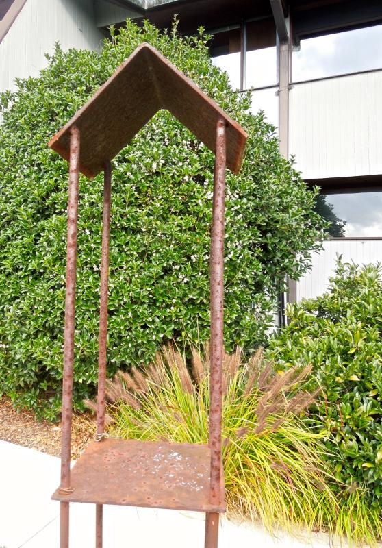 68" Tall Iron Yard Sculpture. Has rusted patina from exposure to weather. Textured metal.