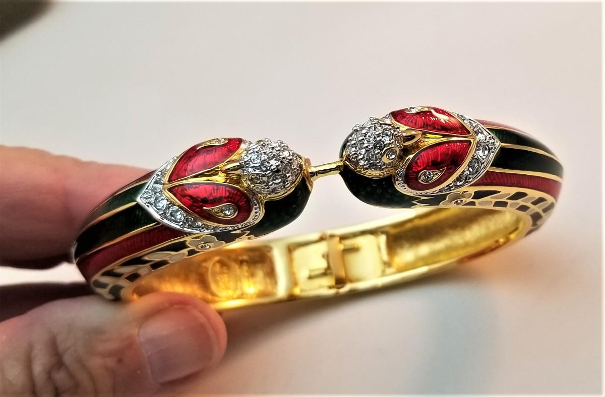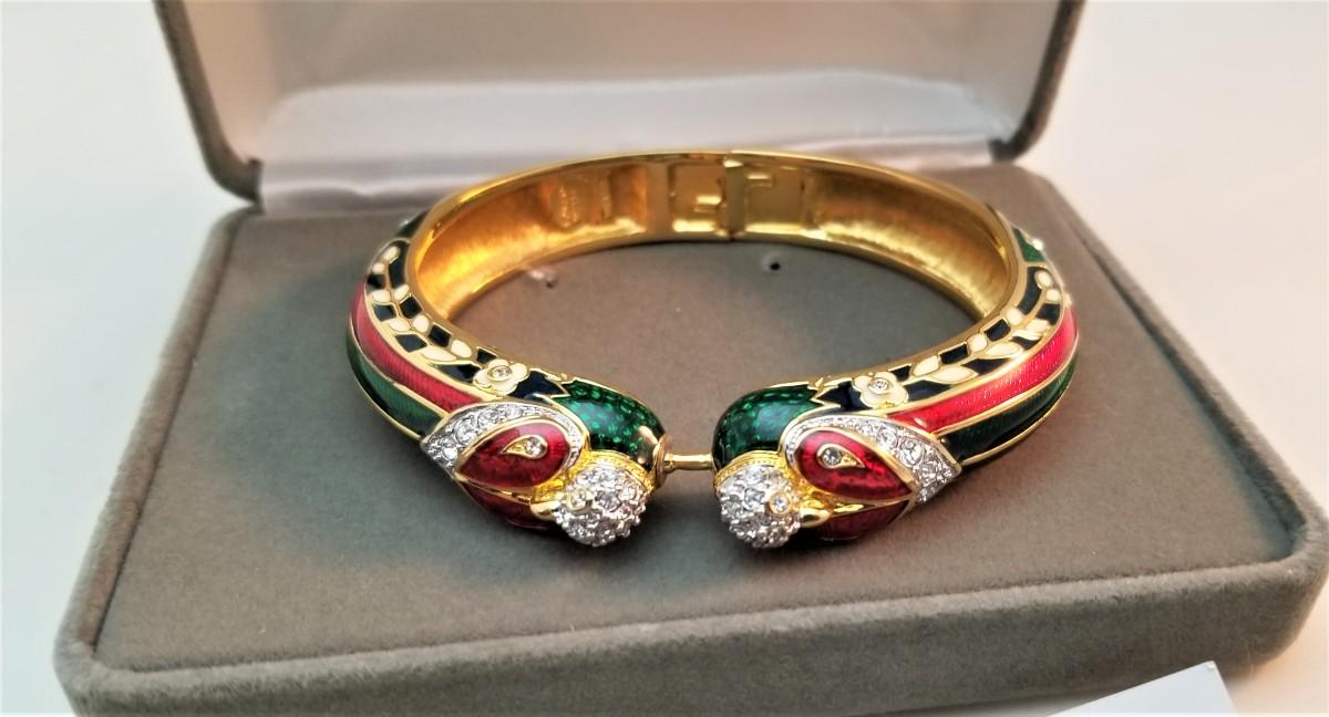 Lots of bling here - enameled bangle - magnetic closure, red/green/white, hinged. Would fit up to about an 8" wrist, excellent condition, original box.