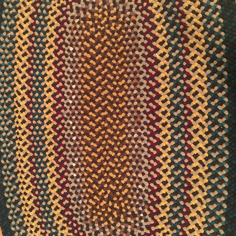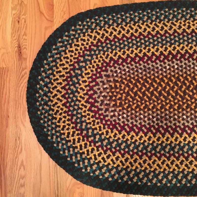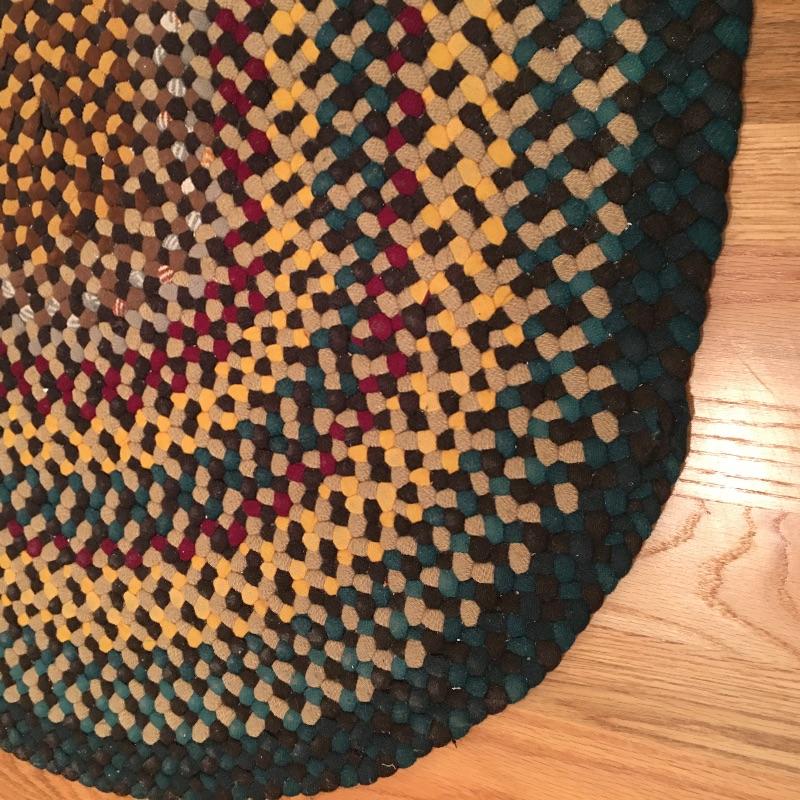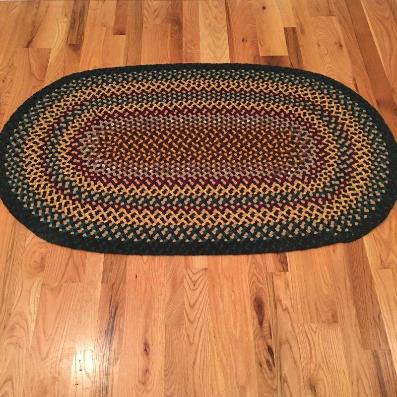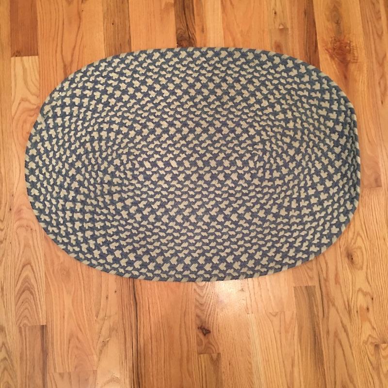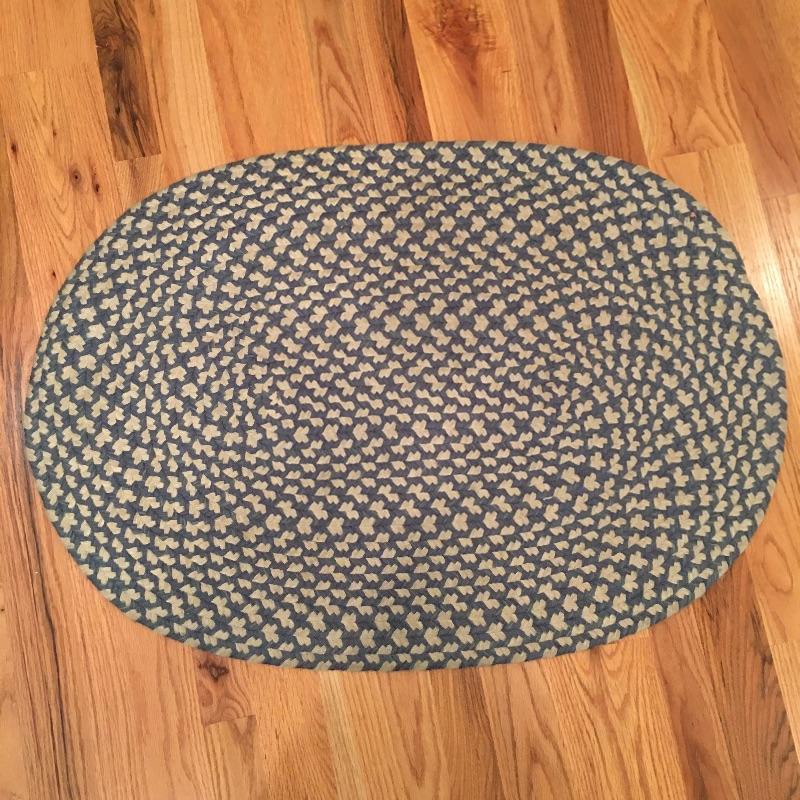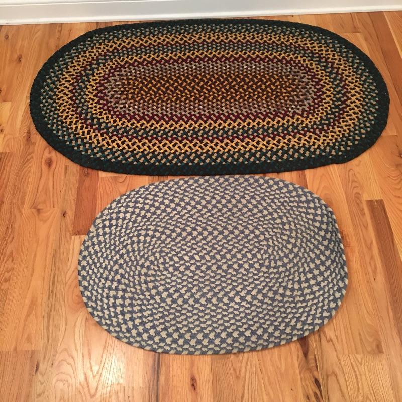 Pair of braided rugs includes one smaller blue and white rug and a larger rug in an array of bold colors. Largest rug measures 35.5” x 59.5”. Protect your floor and keep your feet warm this winter.