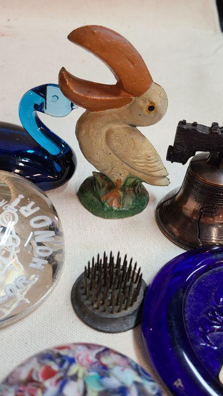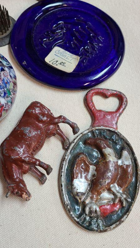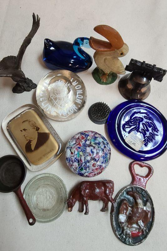 Fun lot of antique smalls. Paperweights, metal cow, bottle openers and more. Please see all pictures for condition of the items listed and what is included in the lot. Pictures will also show any measurements if taken and is the best representation of the items. Thank you for looking and have fun bidding! We appreciate Treasure Hunters!