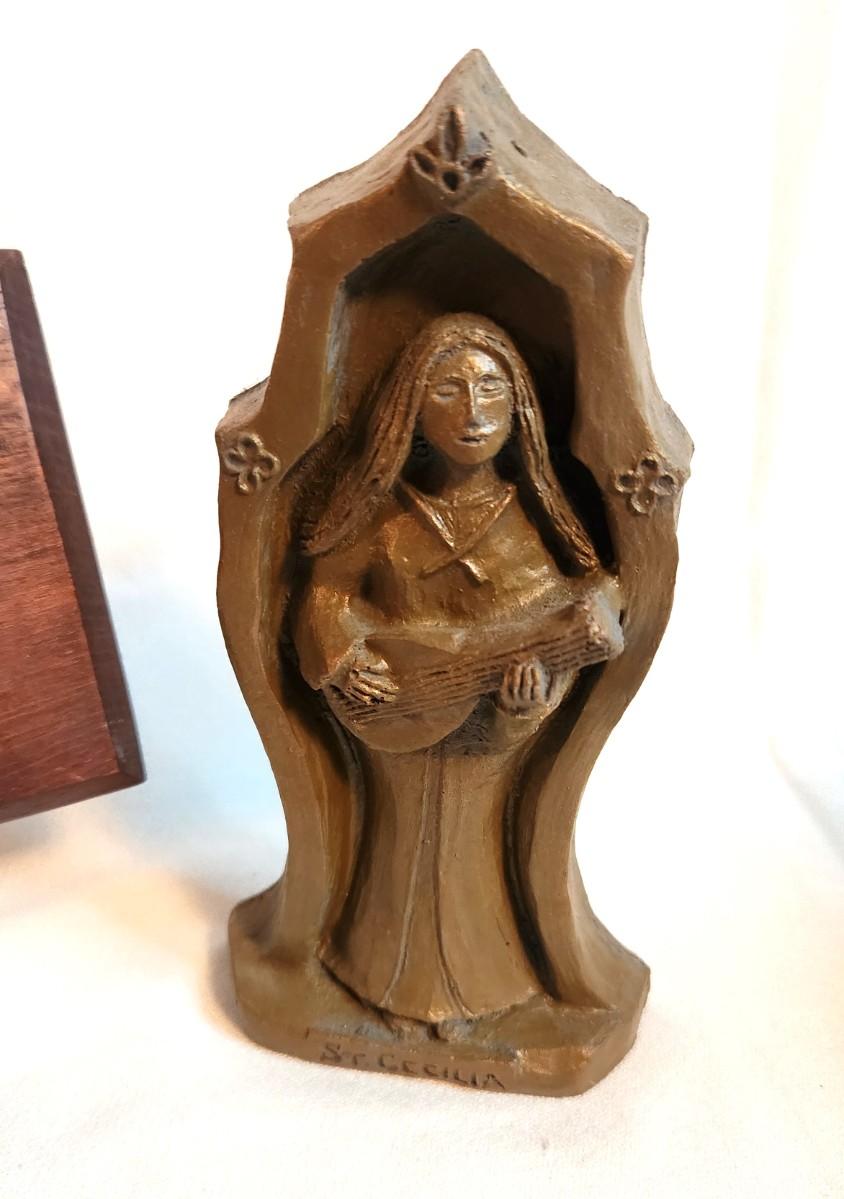 Last Supper done in pewter, mounted on wooden plaque with metal stand - 8.25" across, along with a ceramic St. Cecilia (patron saint of musicians) figure - 6.5" tall. Both in good condition.