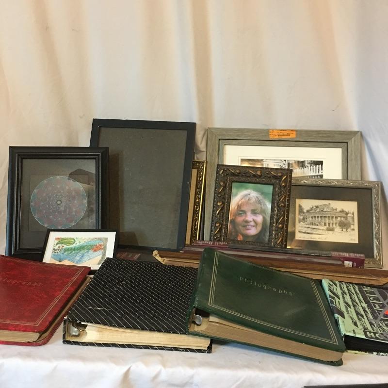 Picture frames and photo albums. Lot more includes four photo albums and a assortment of picture frames in a variety of sizes and styles. Catalog and display your precious memories with this lot. Largest frame measures 23.5” x 31.5”.