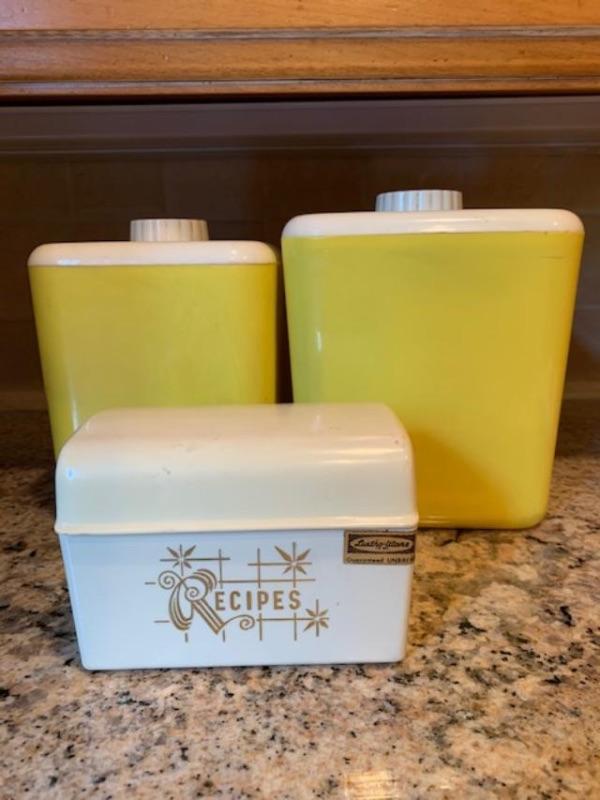 Vintage Plastic Canister Set and Plastic Recipe Box. Lustro Ware