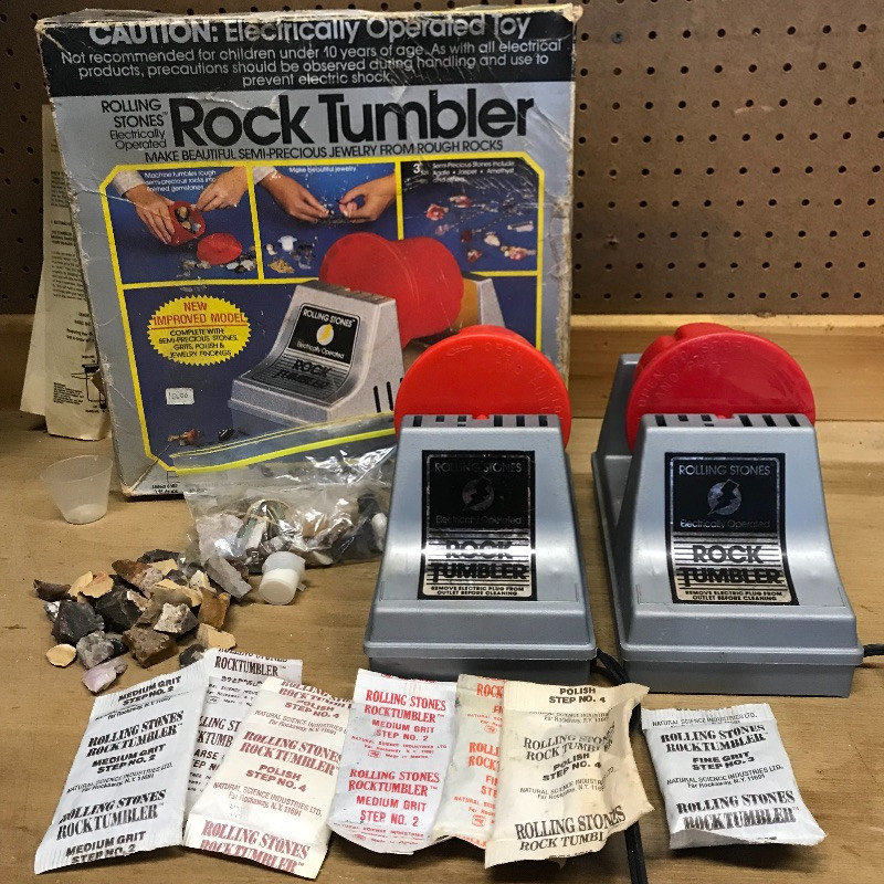 Shine up your treasures with these two Rolling Stones electronically operated Rock Tumblers. Both turn on and spin tumblers when plugged in. Rocks and grit are included, see images.