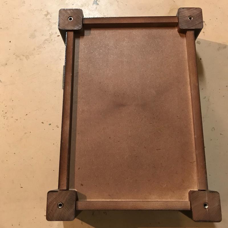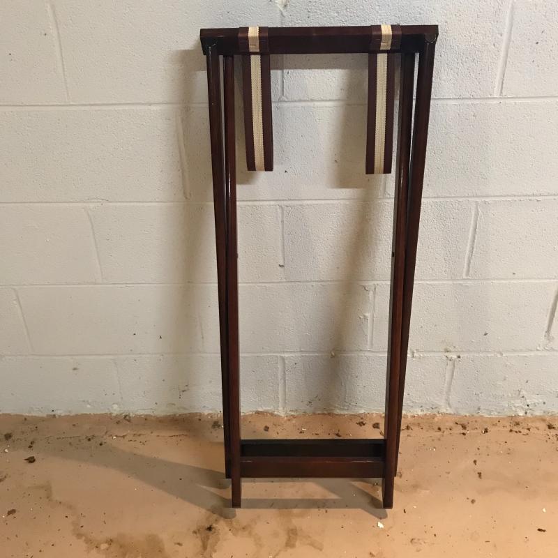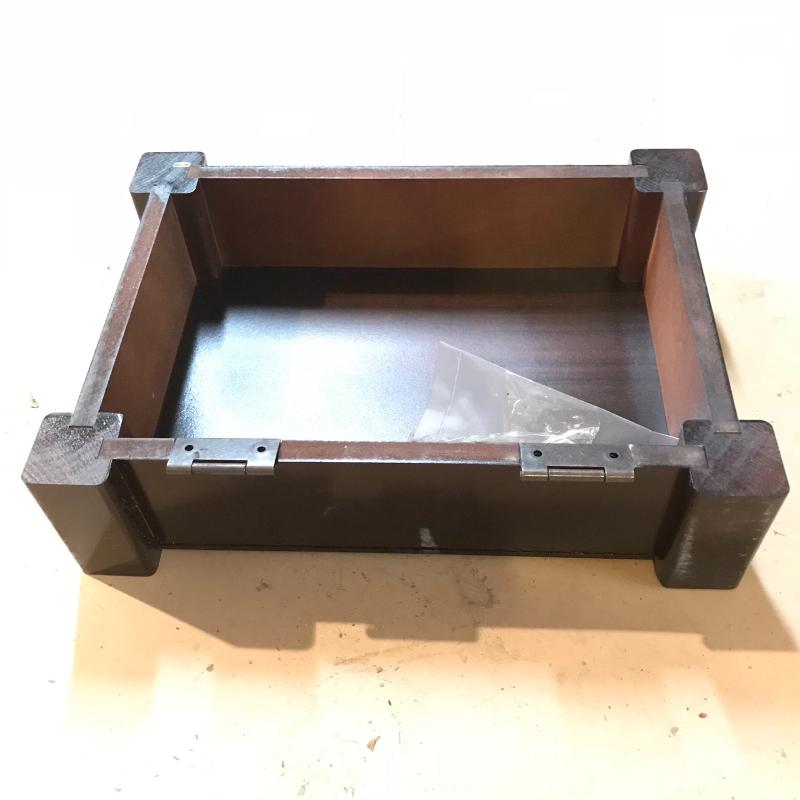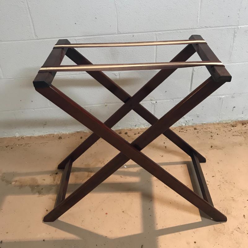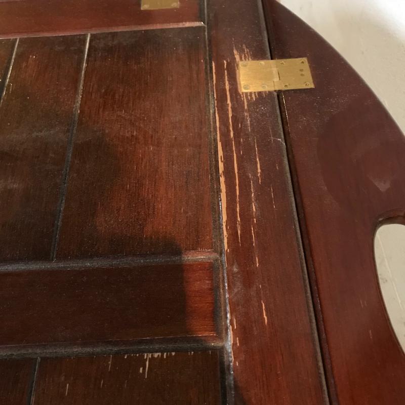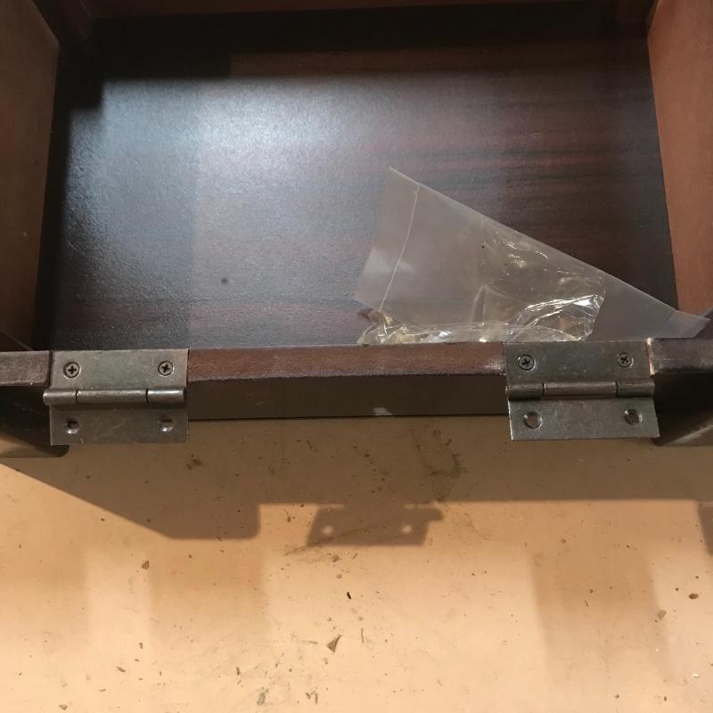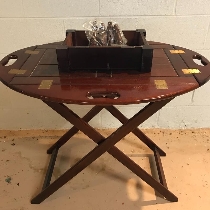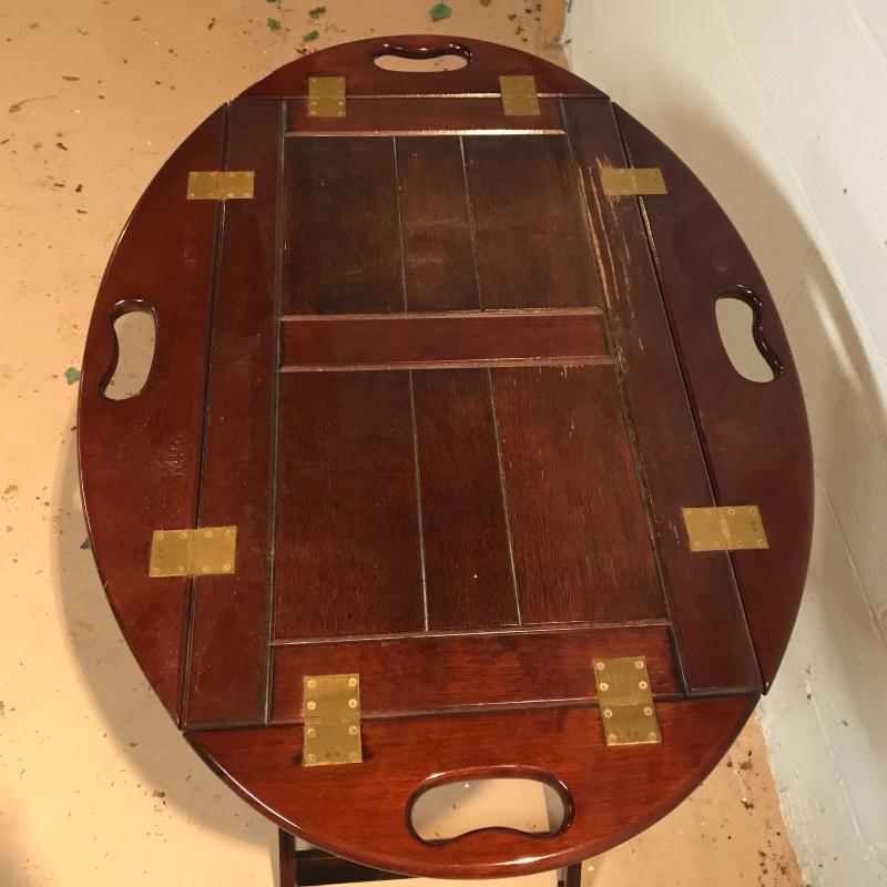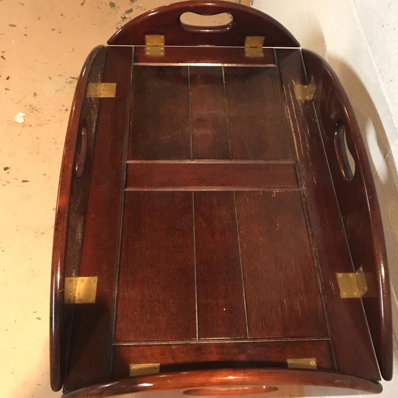 Beautiful cherry colored wood tray with collapsing handled sides that glide smoothly into a right angle. Tray comes with matching tray jack. Tray extended fully measures 35” x 25”. Tray jack with tray sits 28.5” high, but would sit slightly lower without the tray holding it at this height. Along with those gems is a partial cherry colored wooden box with legs and hardware still in packaging. Piece has hinges to attach a top, although the top is not included. No shipping.