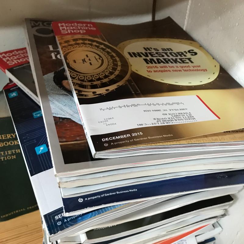 A large number of reference books for machining, engineering, catalogs for tools, Machine Shop Magazines, and More. Lot available for local pick up in Asheville, NC only.