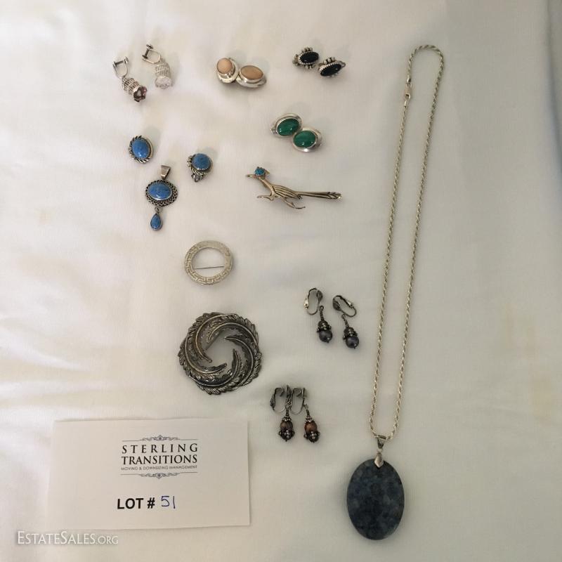 Includes 7 sets of clip on earrings, three Pins, two pendants, one Silver chain. Some sterling silver pieces.