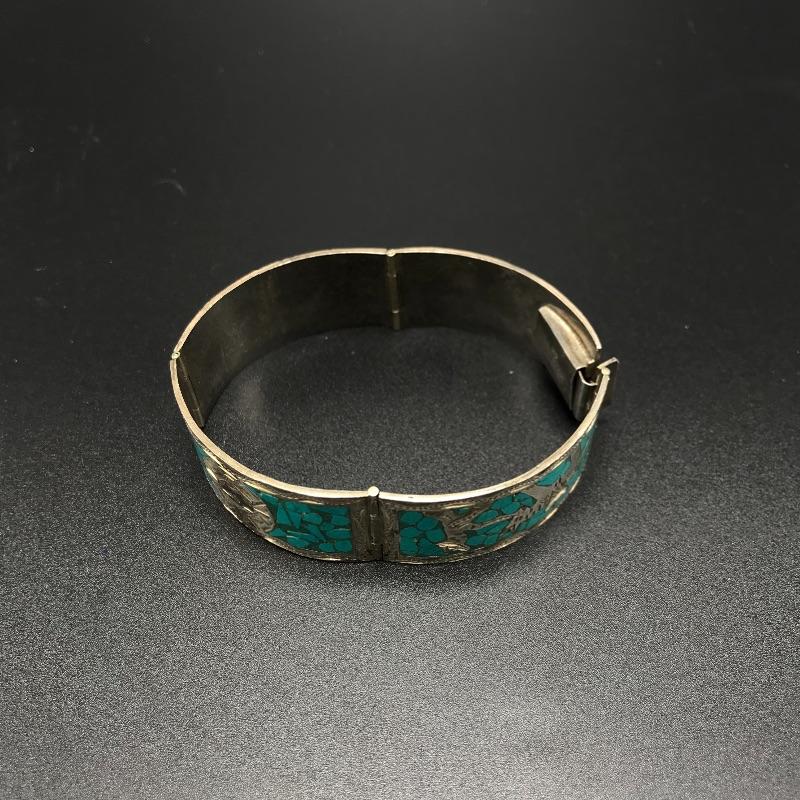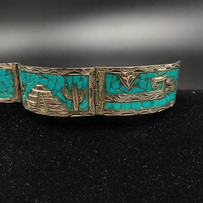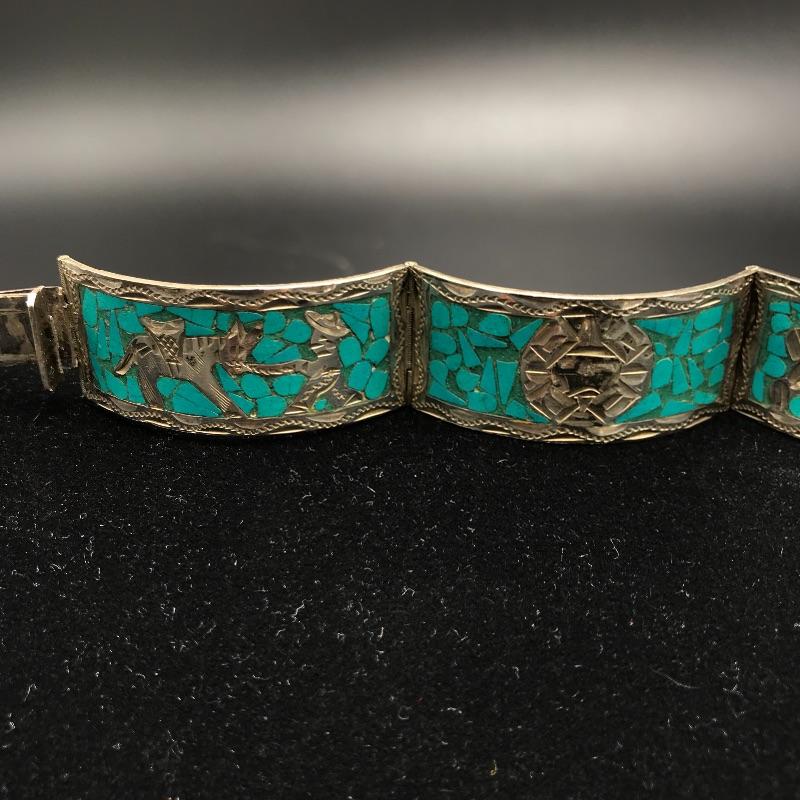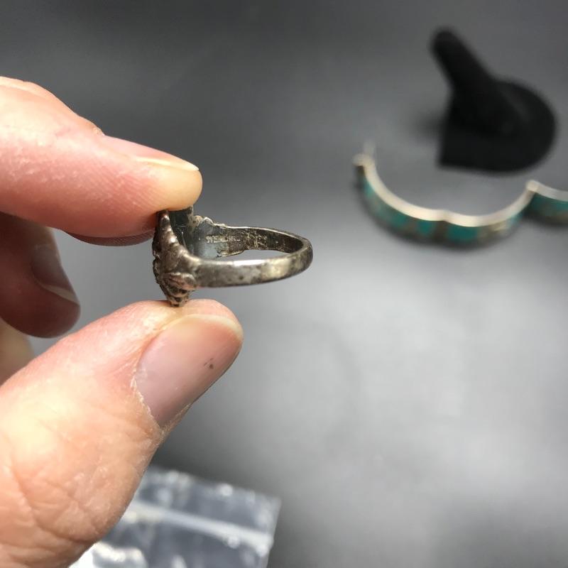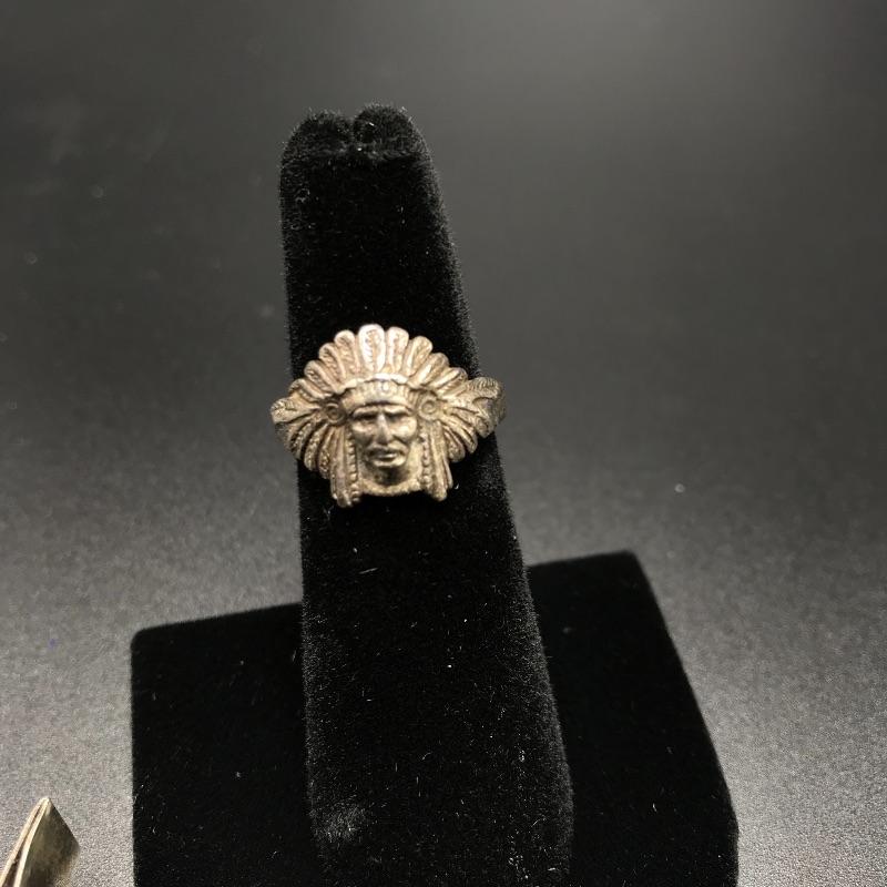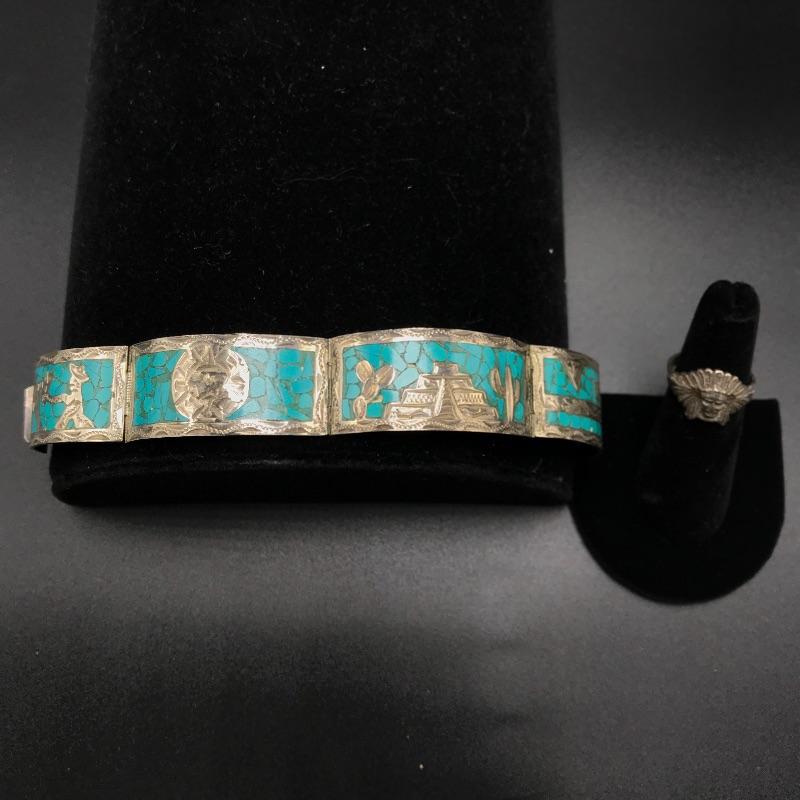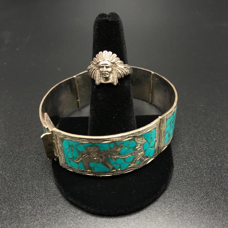 Marked Sterling, this Native American head ring is a size 6. Bracelet is marked 925 with turquoise inlay.