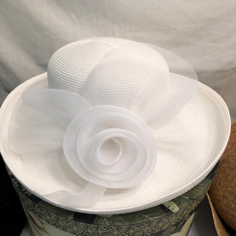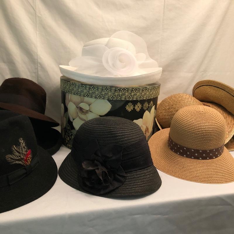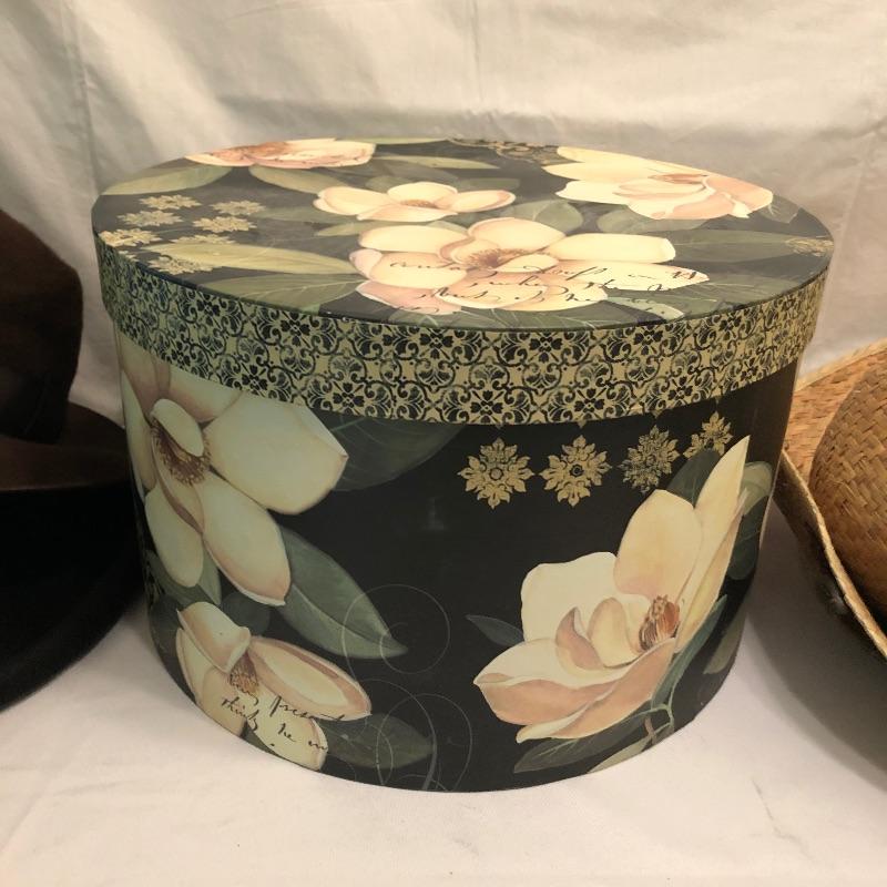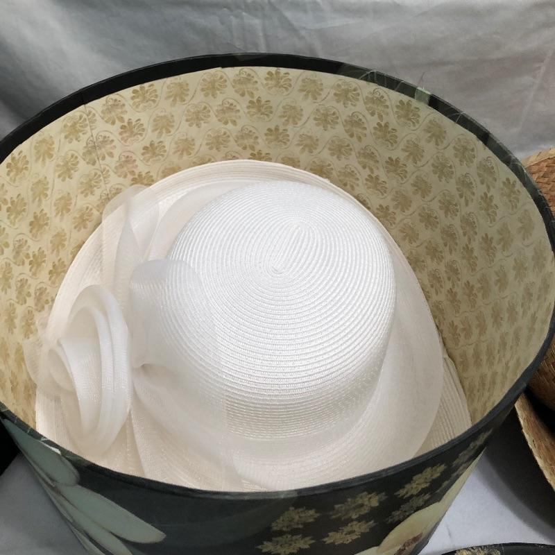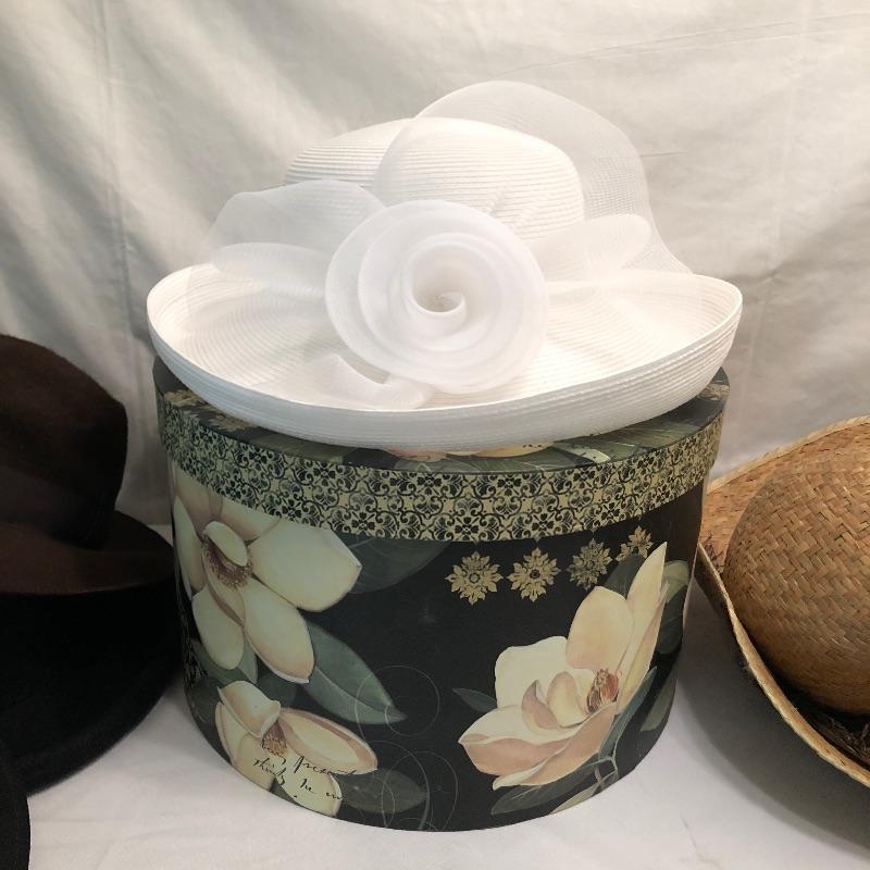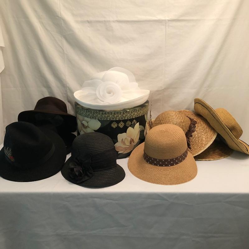 Nine hats in total in this assortment that also includes a hat box. The two black hats are both 100% wool. The brown felt hat is a Stetson. The white hat is very pretty with a white rose flower adorning it’s brim. The rest are all summer hats. Some hats are marked large and some medium, see images; many don’t have sizes so they appear to be one size fits all.