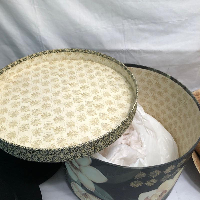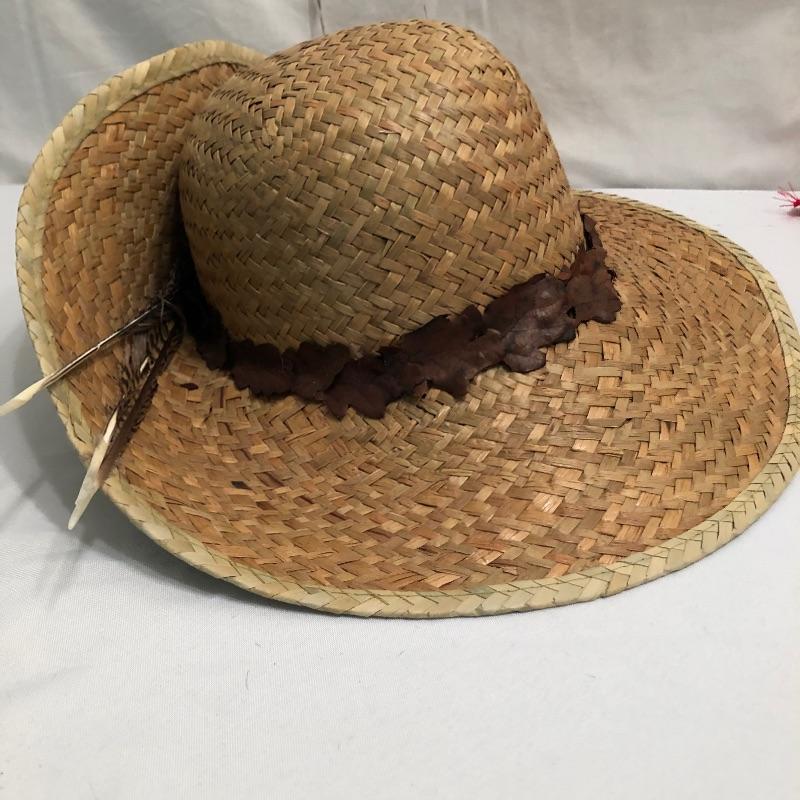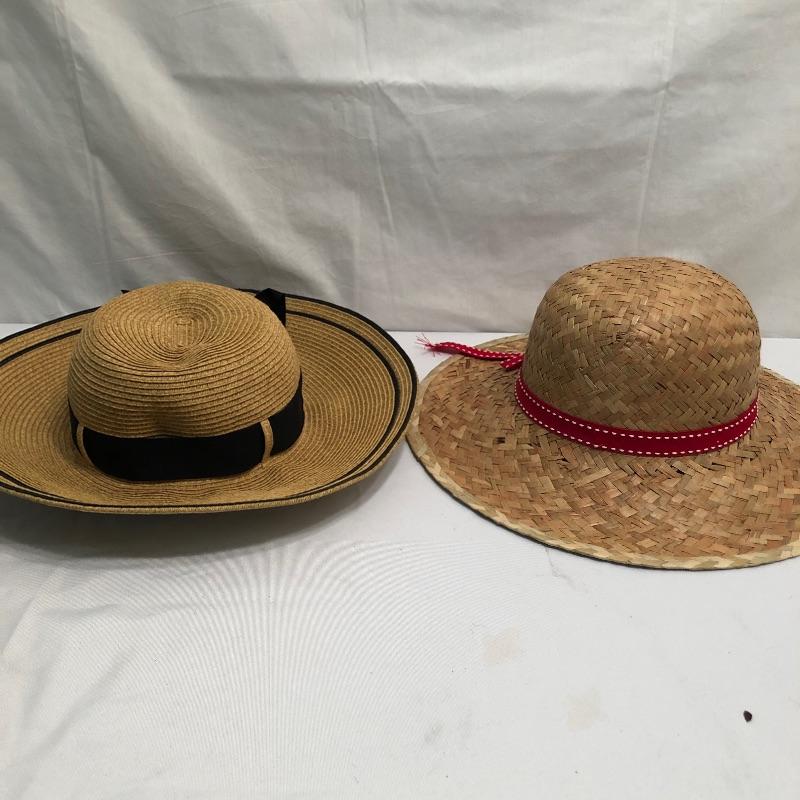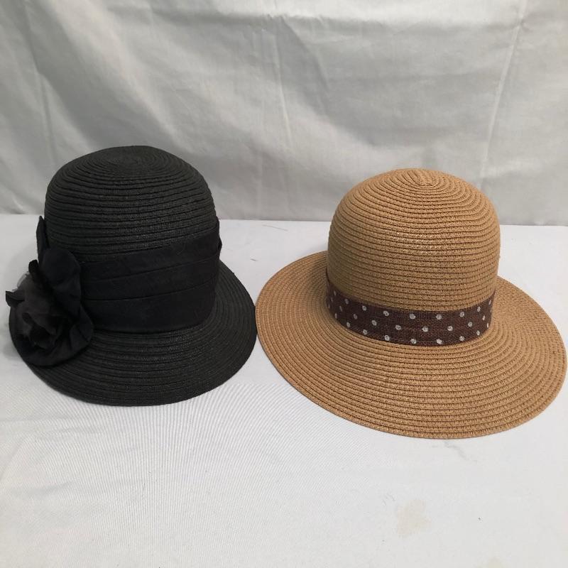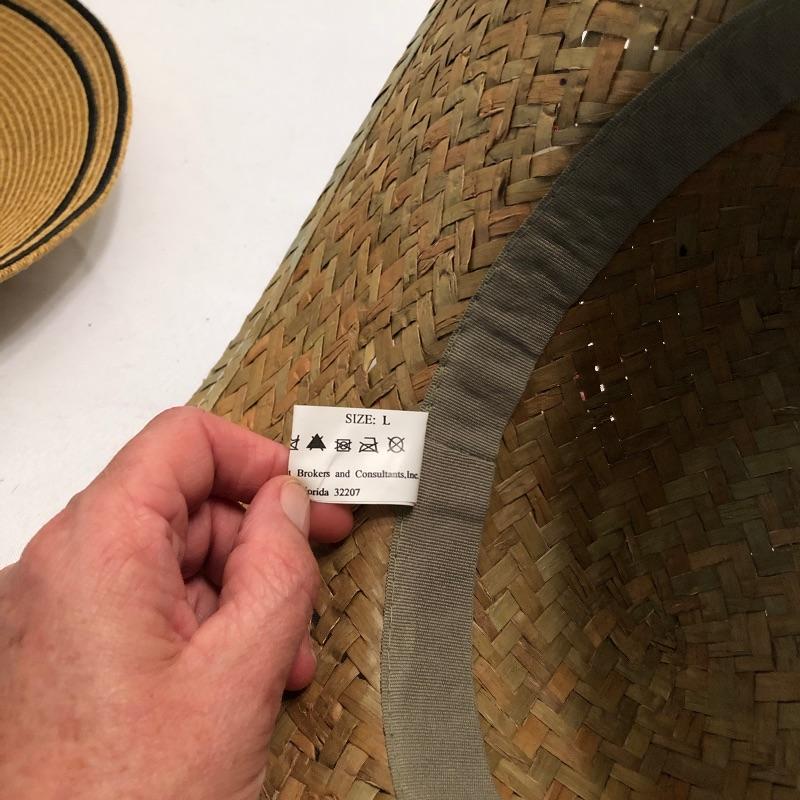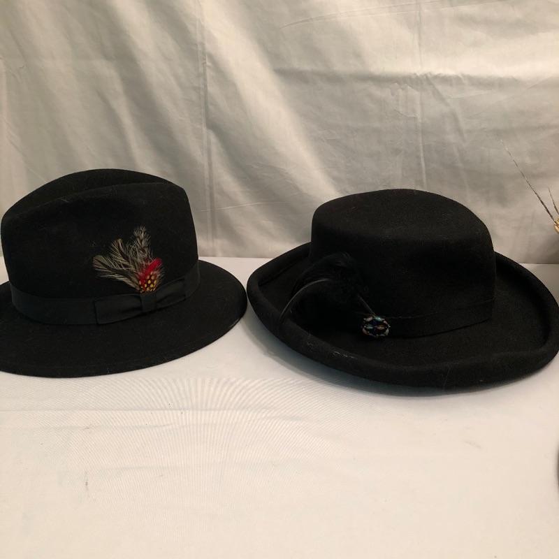 Nine hats in total in this assortment that also includes a hat box. The two black hats are both 100% wool. The brown felt hat is a Stetson. The white hat is very pretty with a white rose flower adorning it’s brim. The rest are all summer hats. Some hats are marked large and some medium, see images; many don’t have sizes so they appear to be one size fits all.