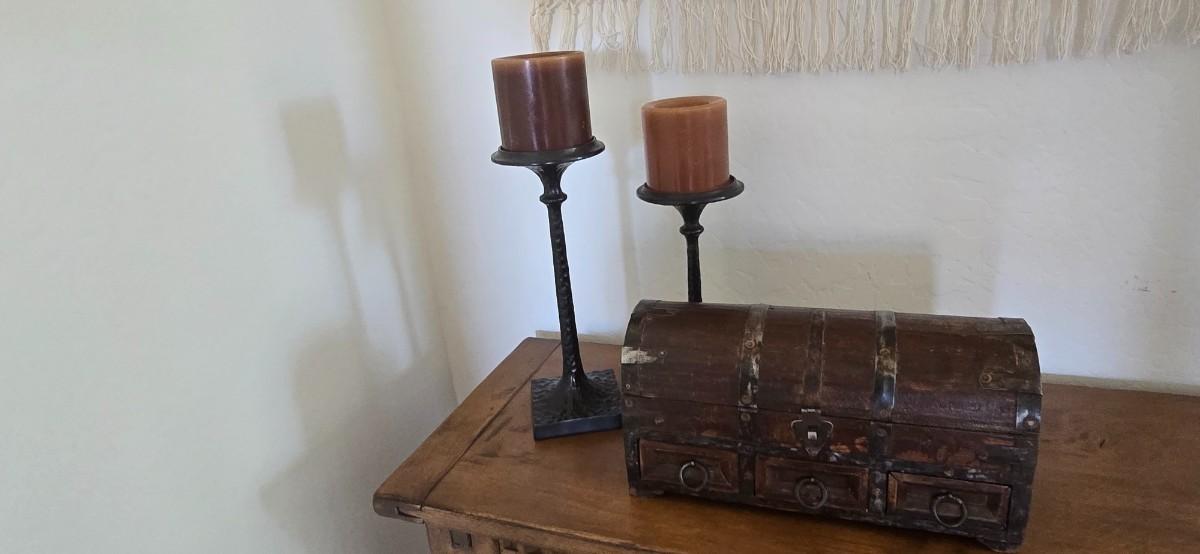 Lot 51: Tapestry / Metal Candle Holders / Treasure Chest