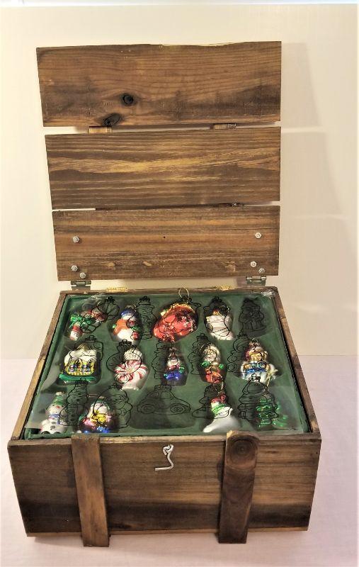 Set in original crate - Thomas Paccione (QVC) mercury glass Christmas ornaments. There are a total of 27 ornaments in the box - 3 of the set are missing. Those that remain are in good condition. The box has two layers.