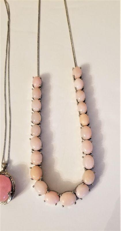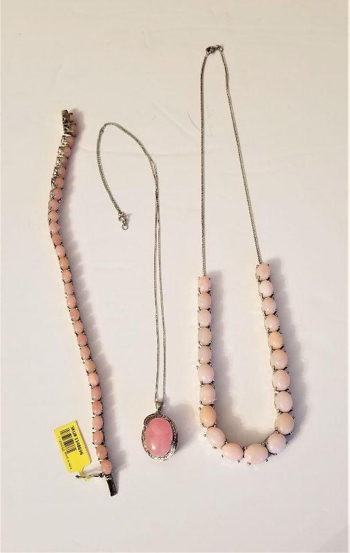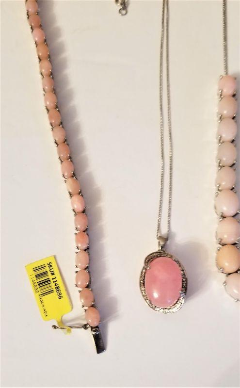 Three nice pieces of pale pink "stones" all set in sterling silver. Bracelet still has tag. Necklace with multi-stones is about 20 inches long, bracelet is about 8.25 inches and single stone necklace with crystal accents is about 22 inches long. All are in nice condition.