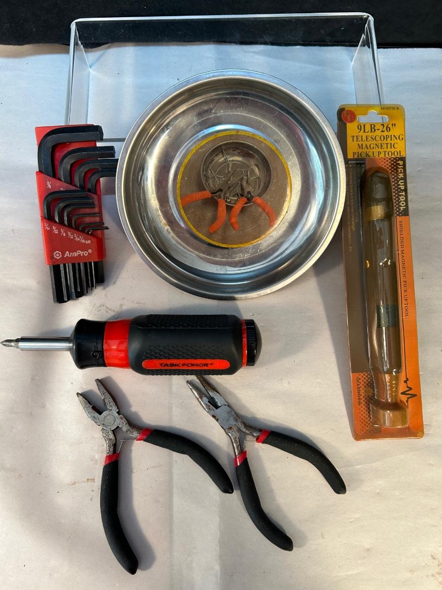 Allen wrench set, pair of pliers, screwdriver, telescoping magnetic wand and magnetic dish
