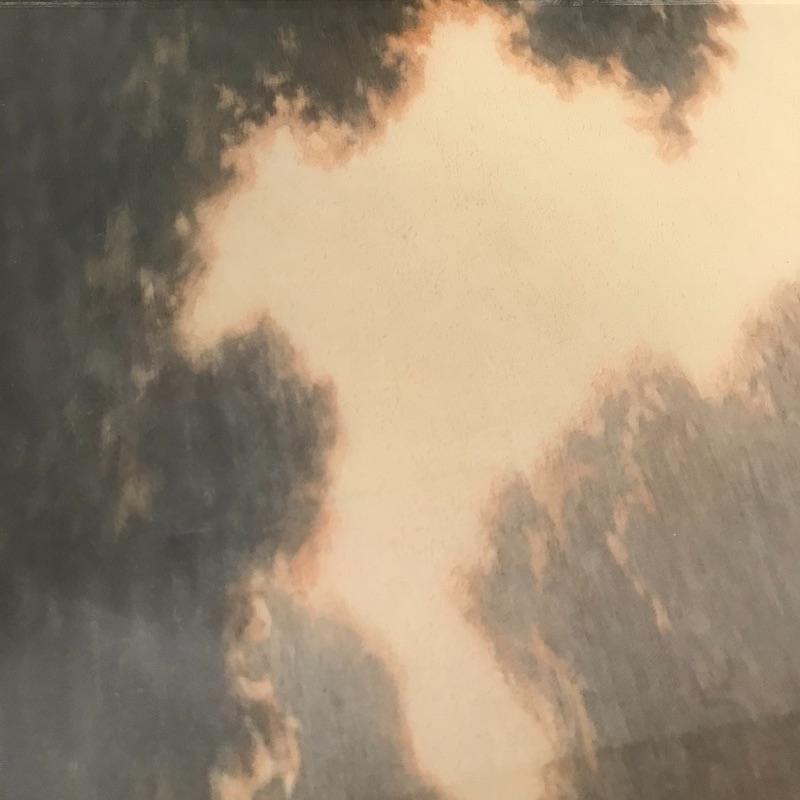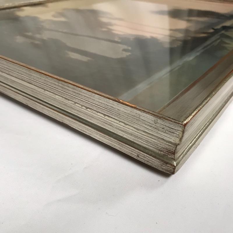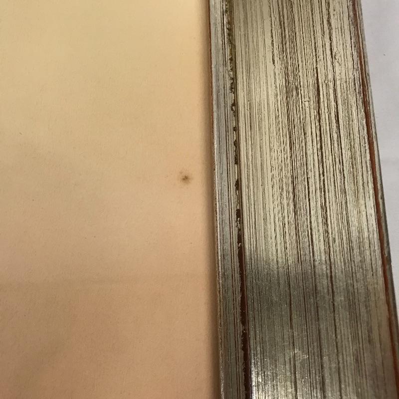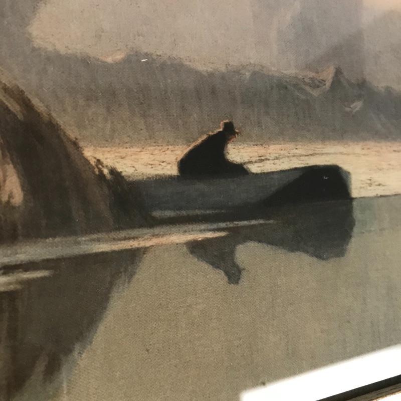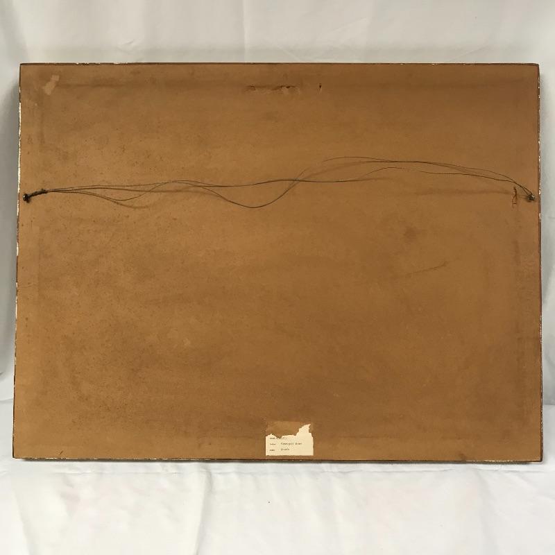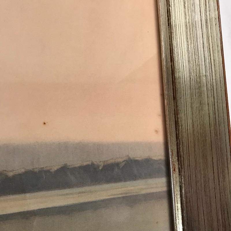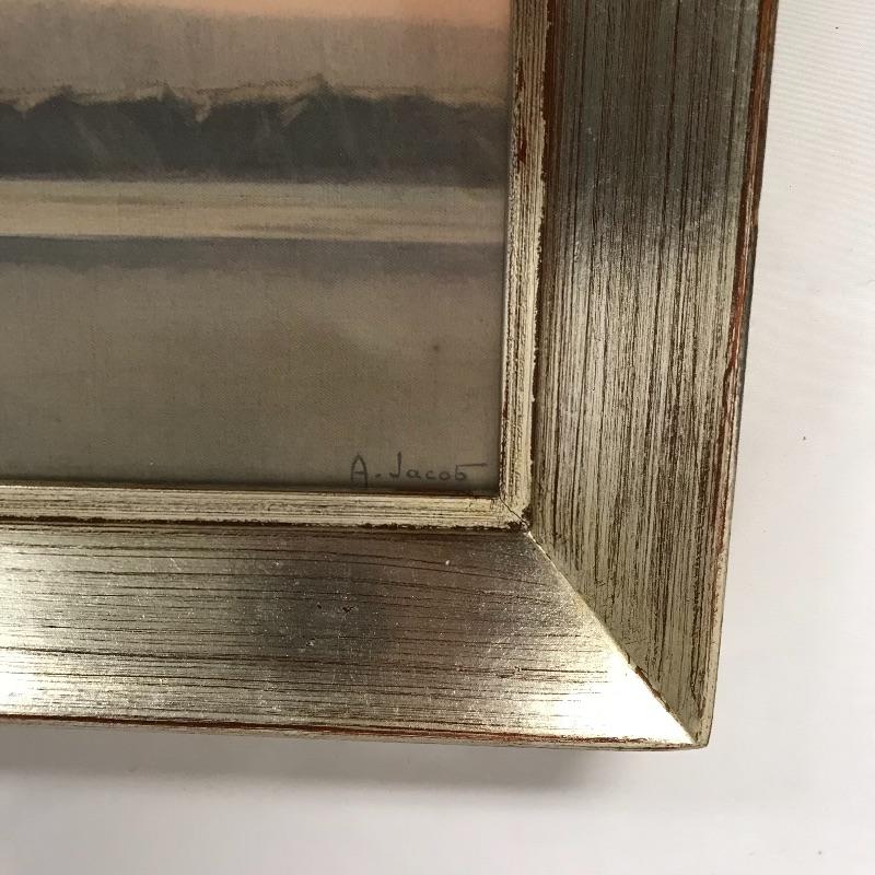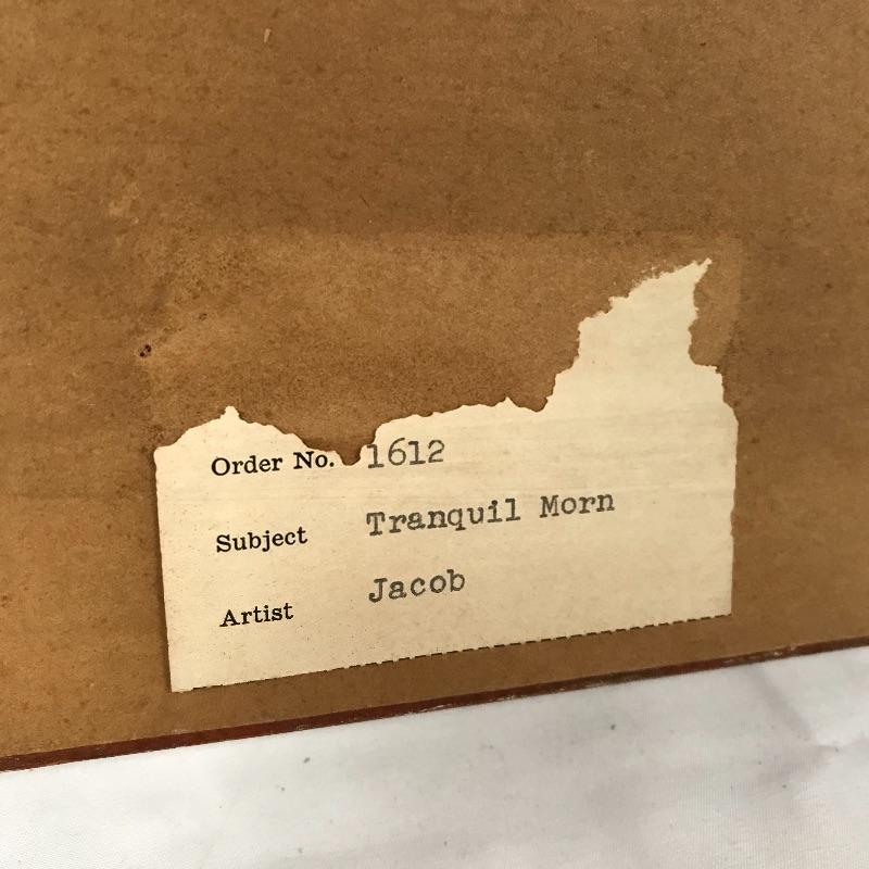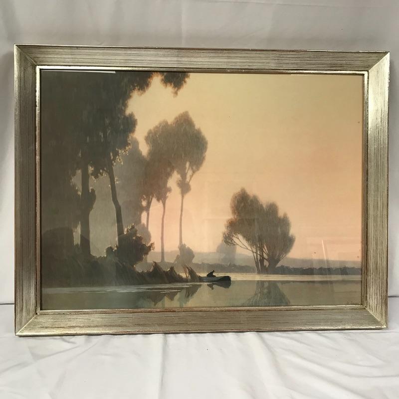 Lovely “Tranquil Morn” print with A. Jacob in the lower right corner. This piece sits in a large 33” x 25” wooden frame with a lovely metallic paint with red distress accents.
