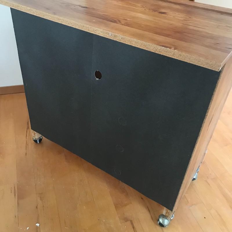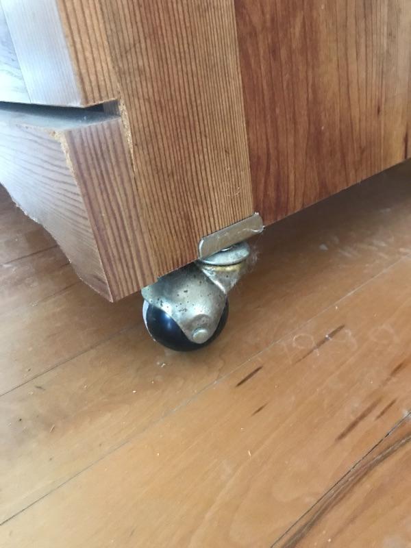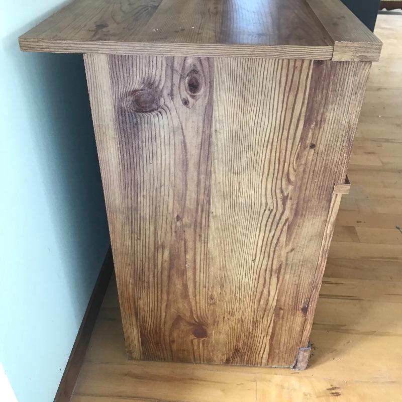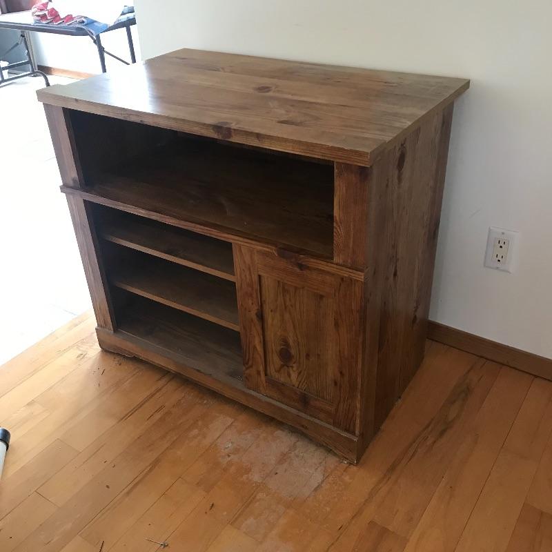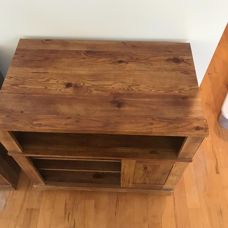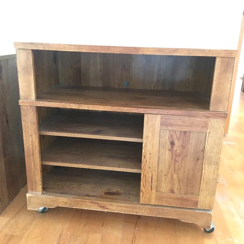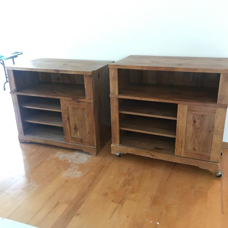Great for extra storage and very useful. These matching stands are manufactured wood and each have shelves and cabinet door. Perfect for entertainment components or as side table. One looks taller because it is on casters. Both Measure approx. 32.5”L x 20" W  x 29”h (one with casters is 32" H) Both show some signs of fading and water damage. Local pick-up only.