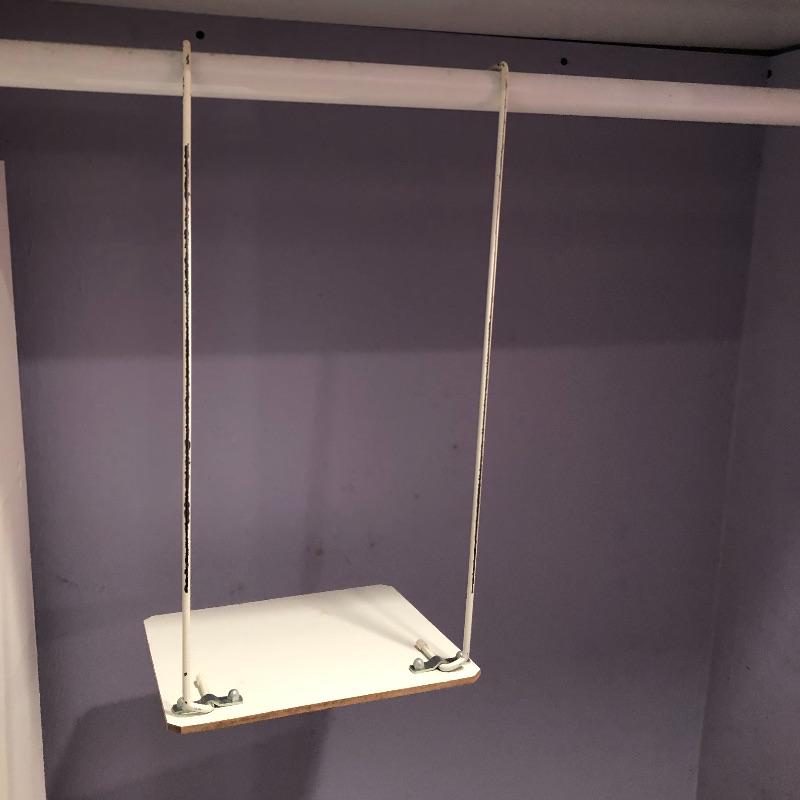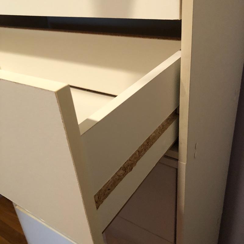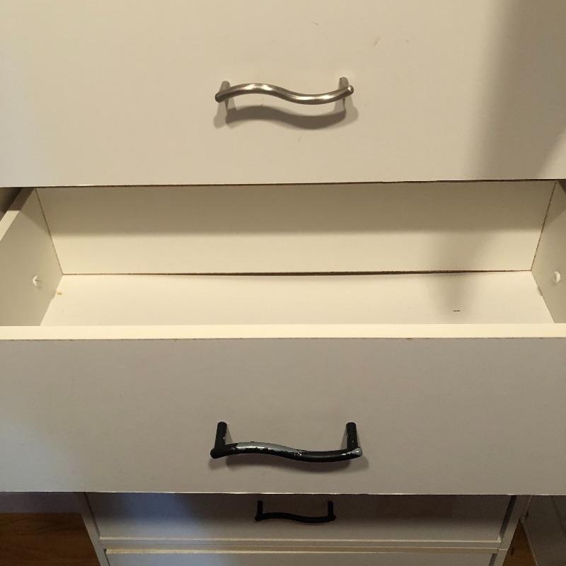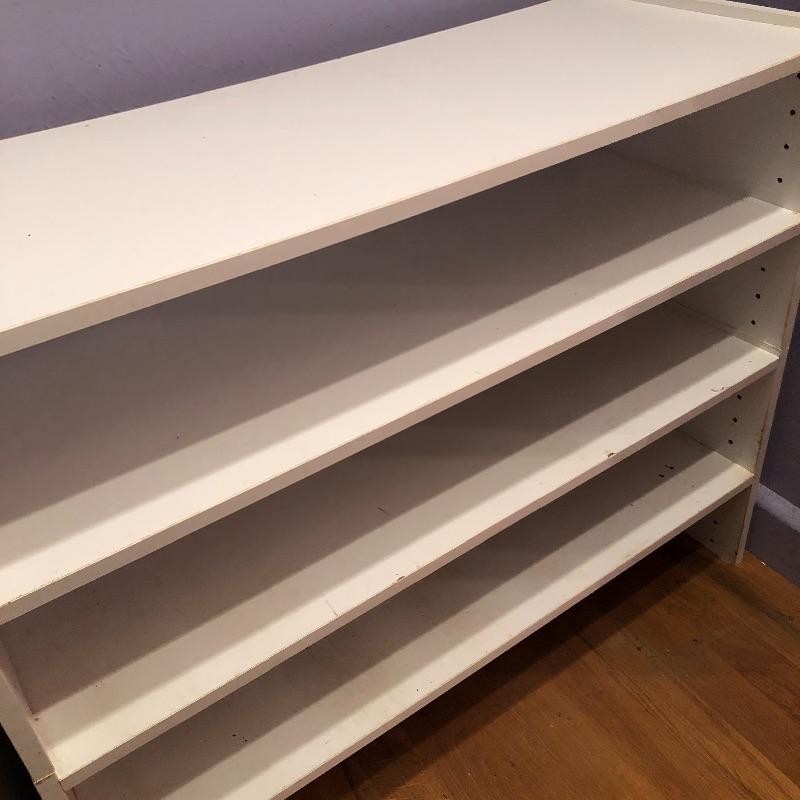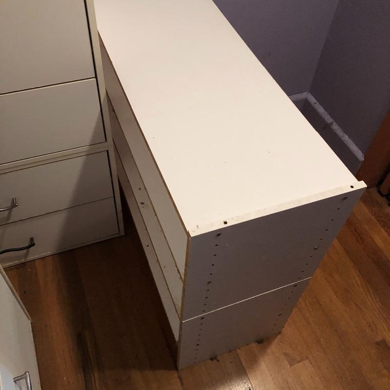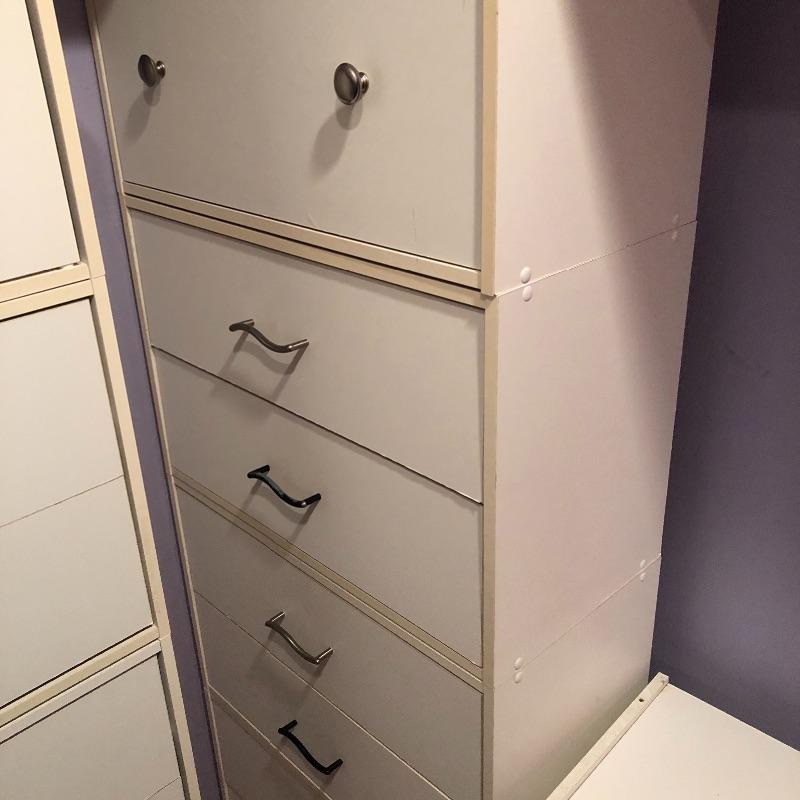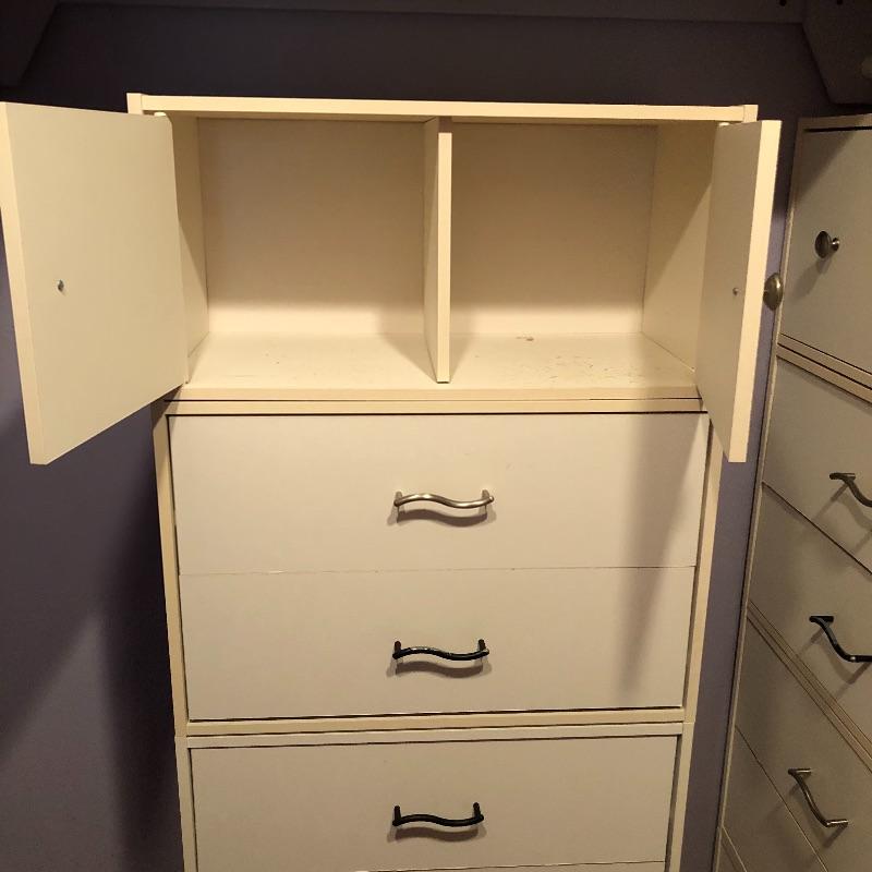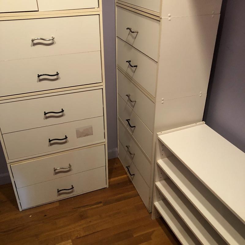 Lot includes eight pressed wood white stackable units and two stackable shoe shelves. The eight units each measures 24” x12” x12” with six two drawer units and two cabinet. The two shoe shelves each measure 31” x12” x12.5”. The small metal and pressed wood shelf can be hung for portable storage in the closet. Some drawer handles have been painted and are chipped. All pieces appear to be sturdy but used. Local pick up only.