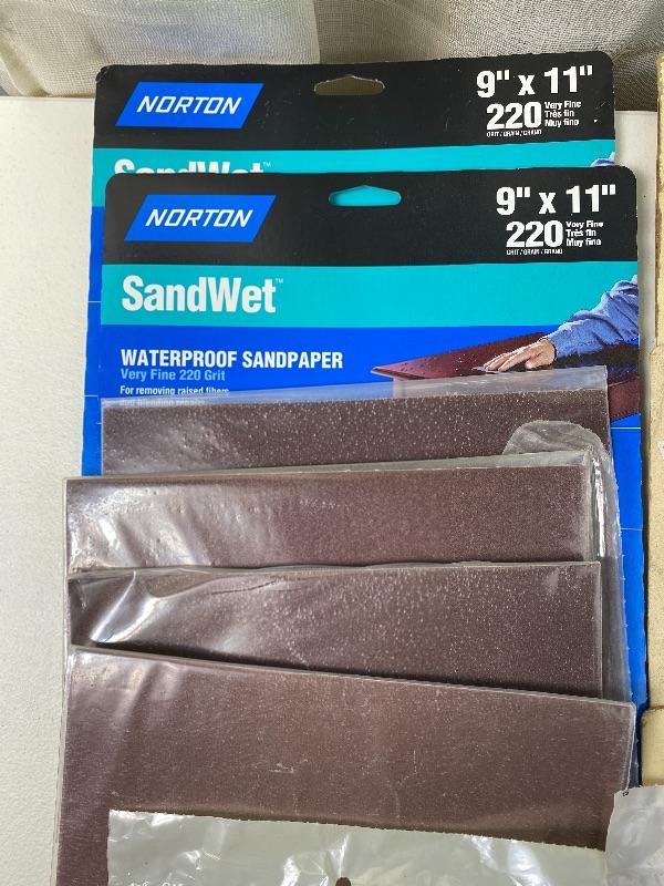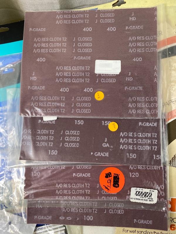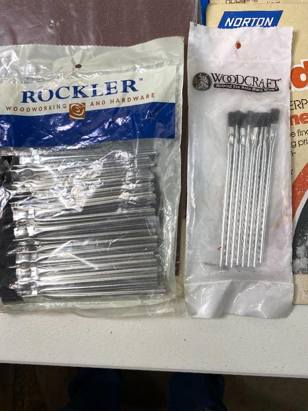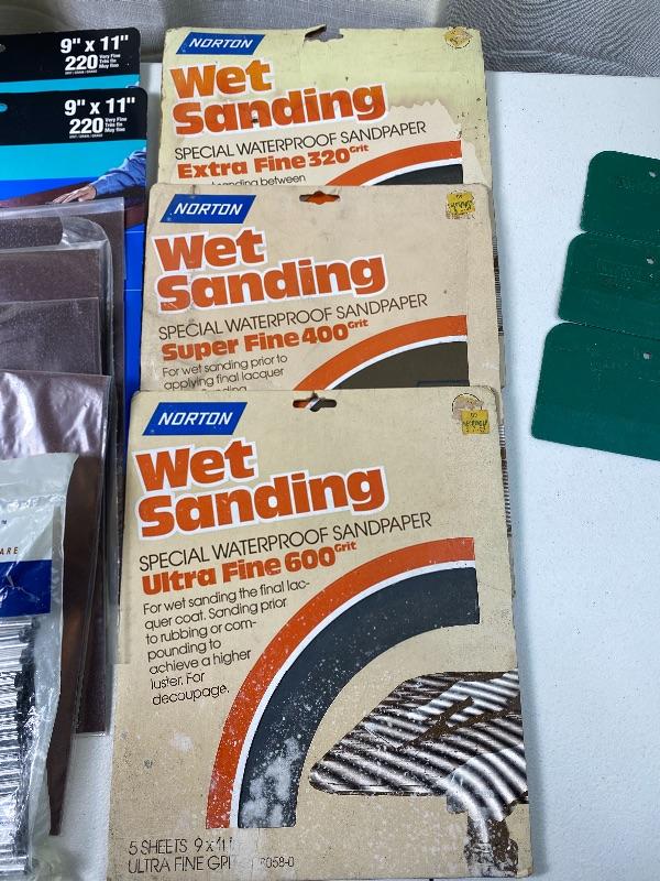 Lot# 51 Variety Wet Sandpaper 13+ sheets Small Brushes Marson Spreaders Woodworking Cabinet Making Tools