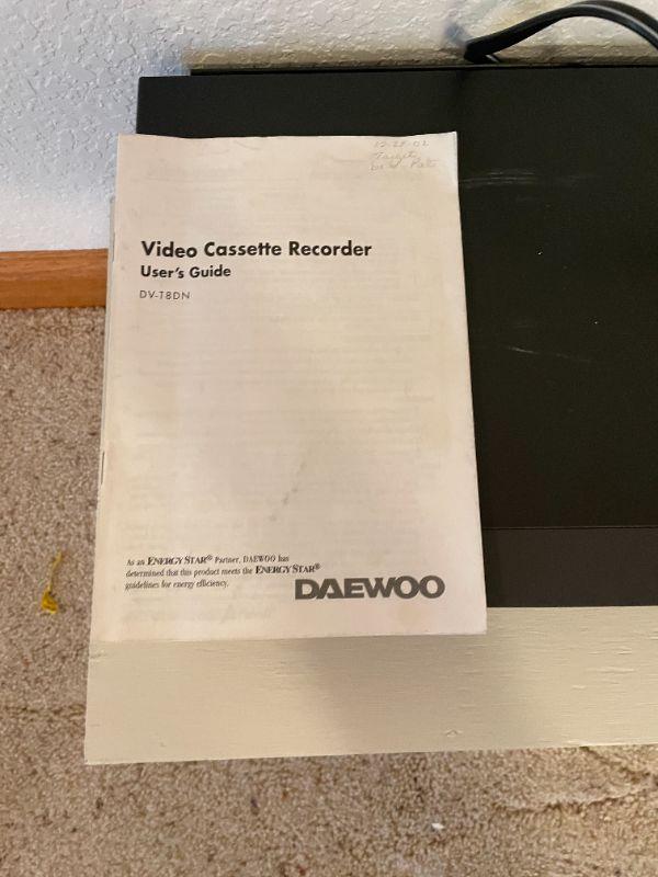 DAEWOO VIDEO CASSETTE RECORDER, WITH INSTRUCTIONS, SEVERAL GOOD VHS MOVIES, AND A VHS REWIND MACHINE.