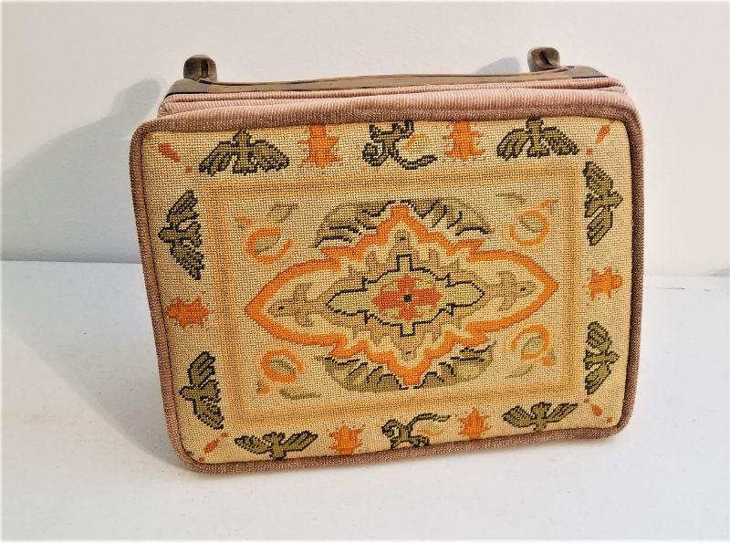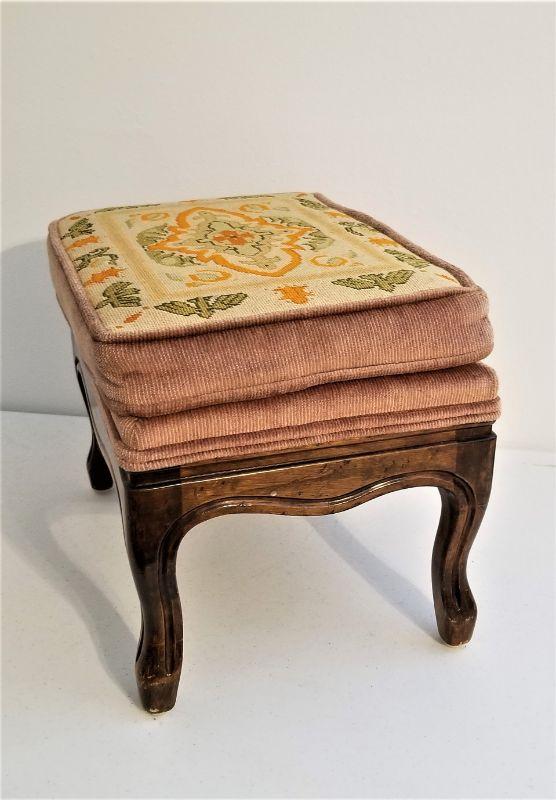 Nice vintage fruitwood needlepoint stool - well executed. Measures 12" tall, 15" x 11.5". Good used condition. One or two little spots on the side.