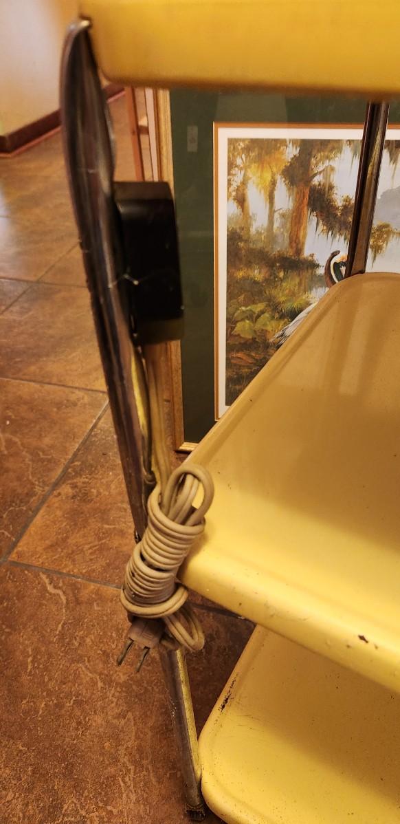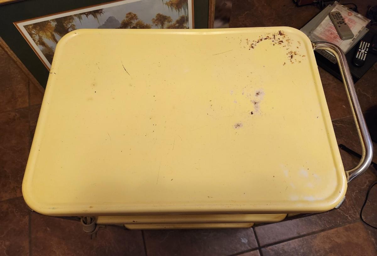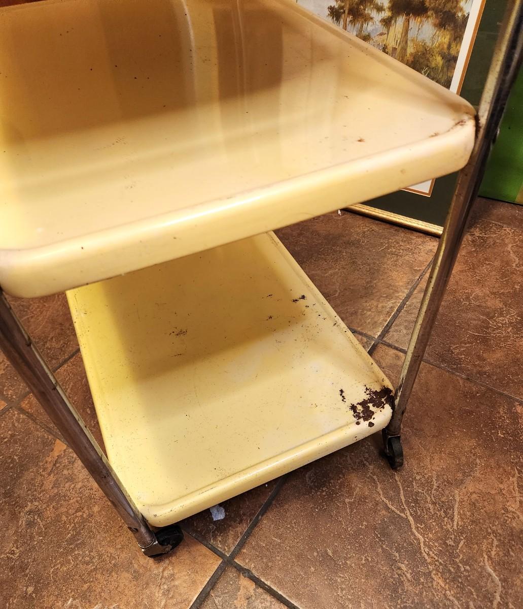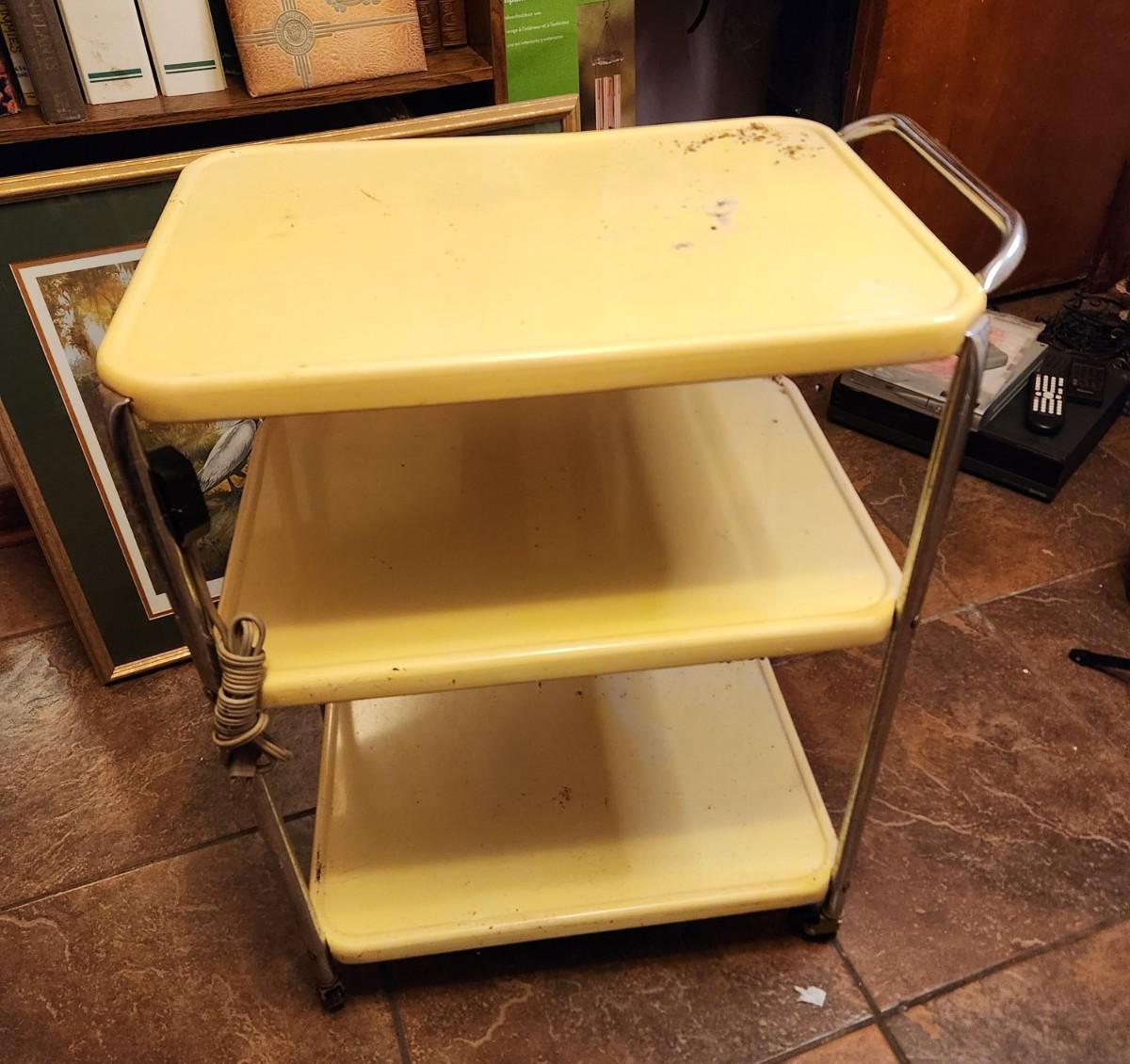 1960's kitchen cart with attached electrical cord - has a bit of rust (see photos) - wheels need a good clean (they are sort of gunked up) - attic find!!!! I haven't seen a yellow one in quite awhile! 30" tall at tallest point. Still has life left in it - just needs a good clean.