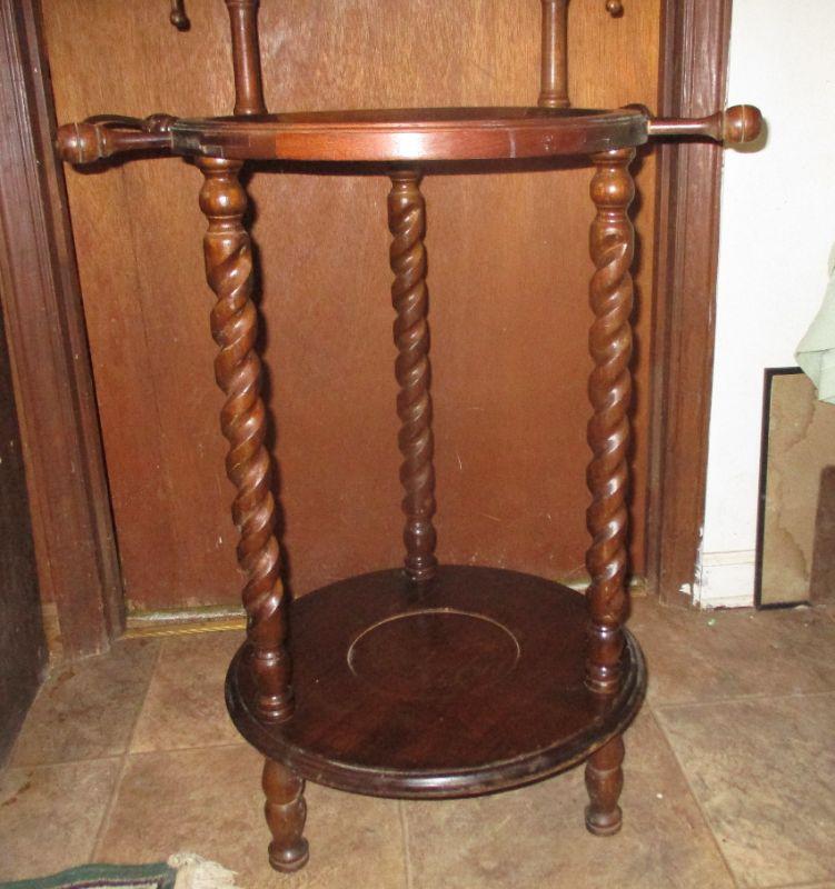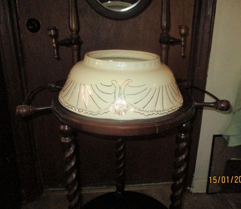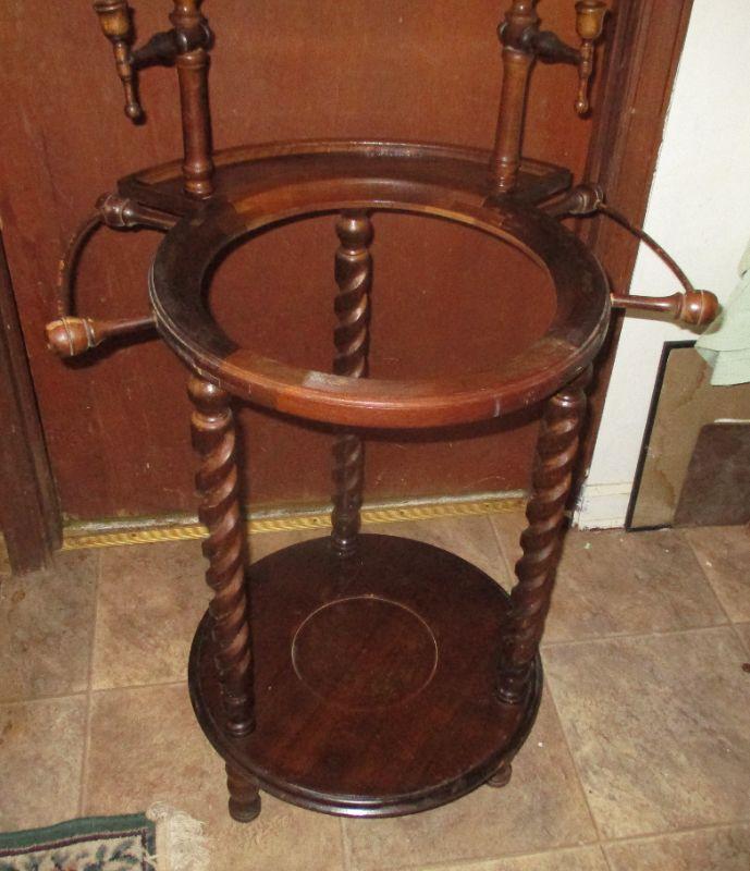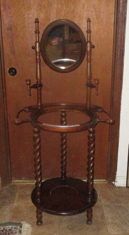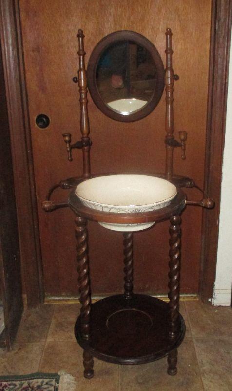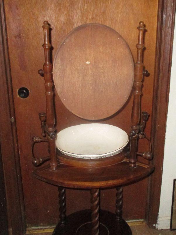 This piece is gorgeous!!! It needs a bit of oil to renew the wood, but otherwise, it is in excellent condition. The side bars that would hold a towel are wood and the base has a carved circle to hold the pitcher. It does include a bowl, but we did not find the water pitcher. It is 52.5" tall.