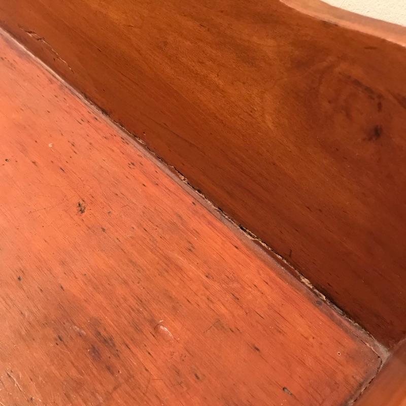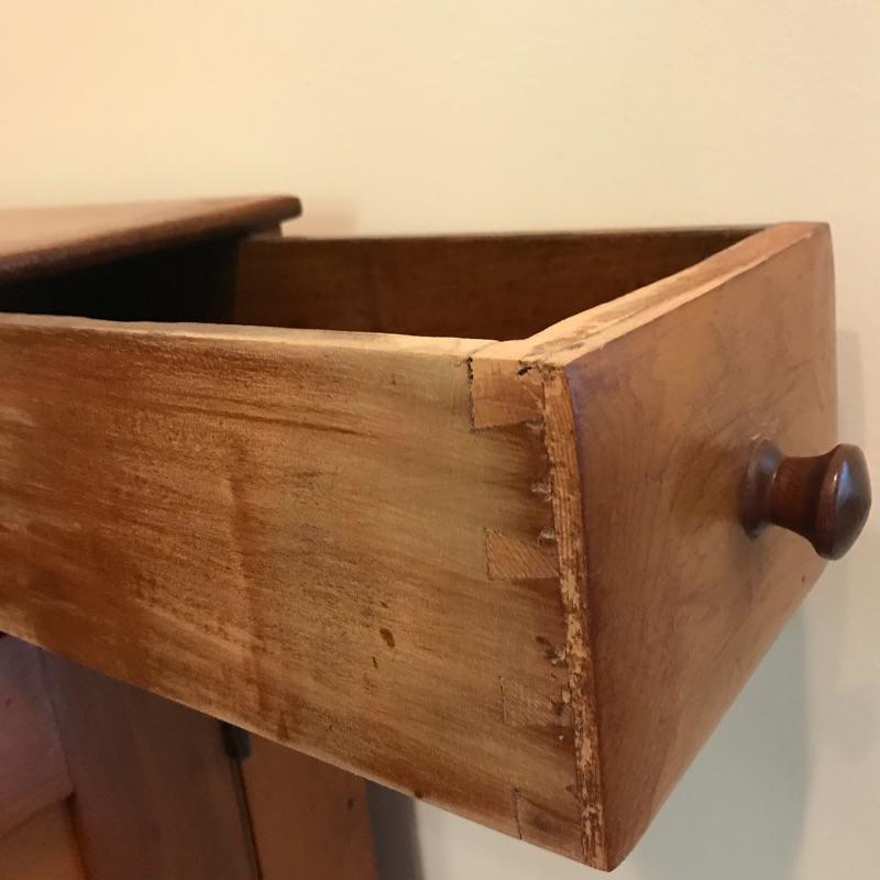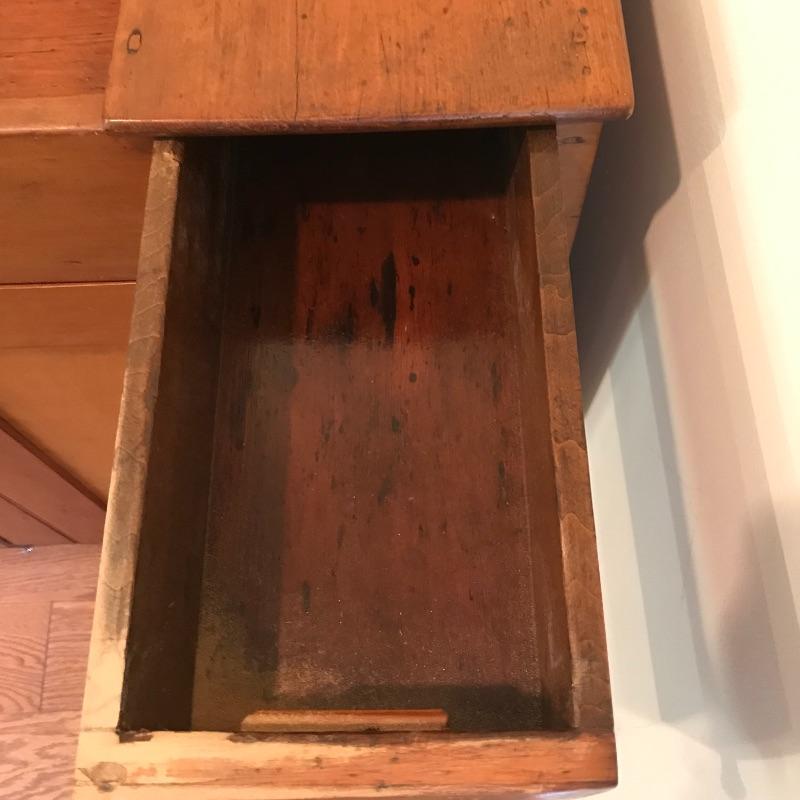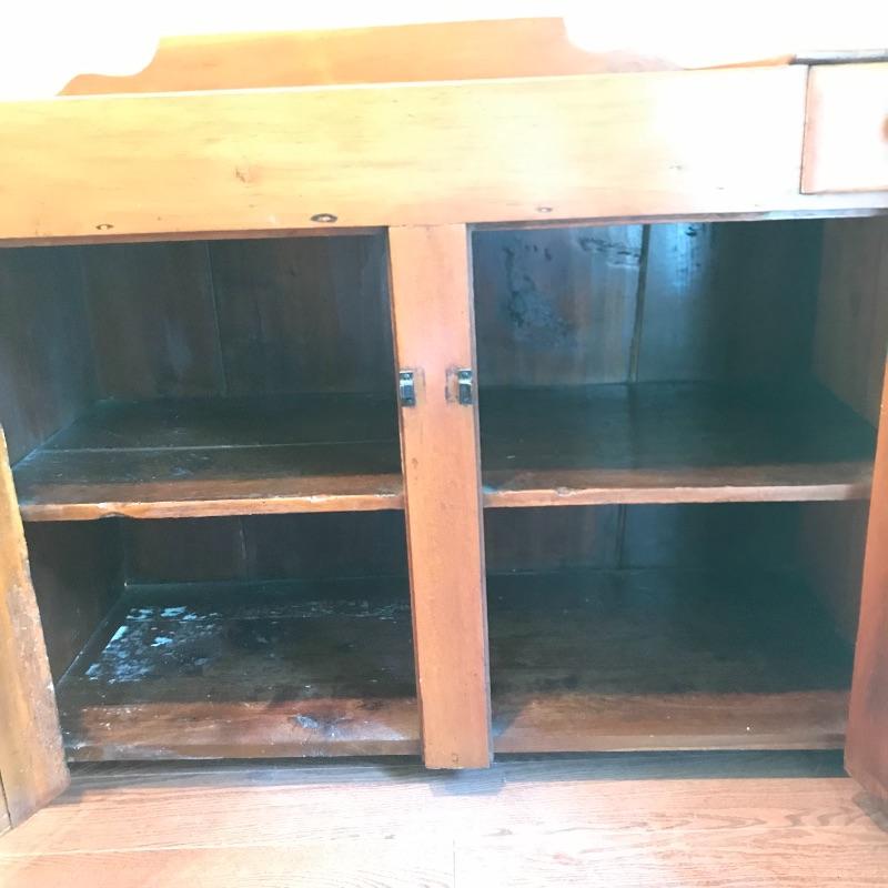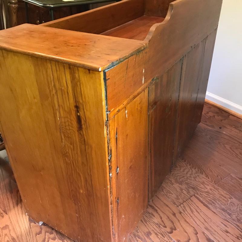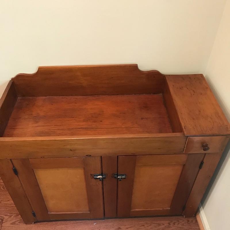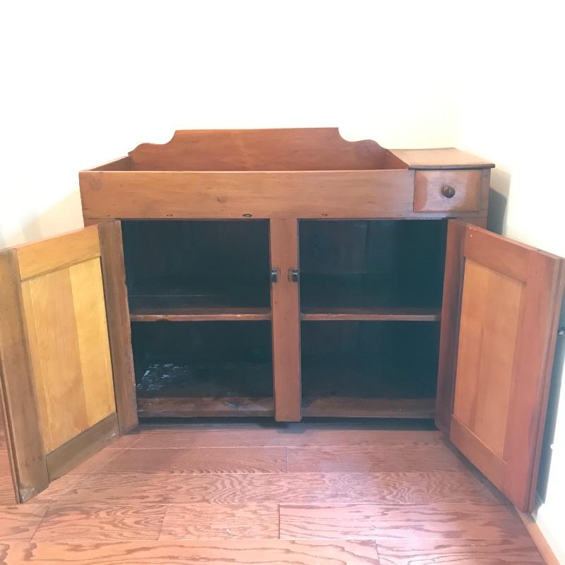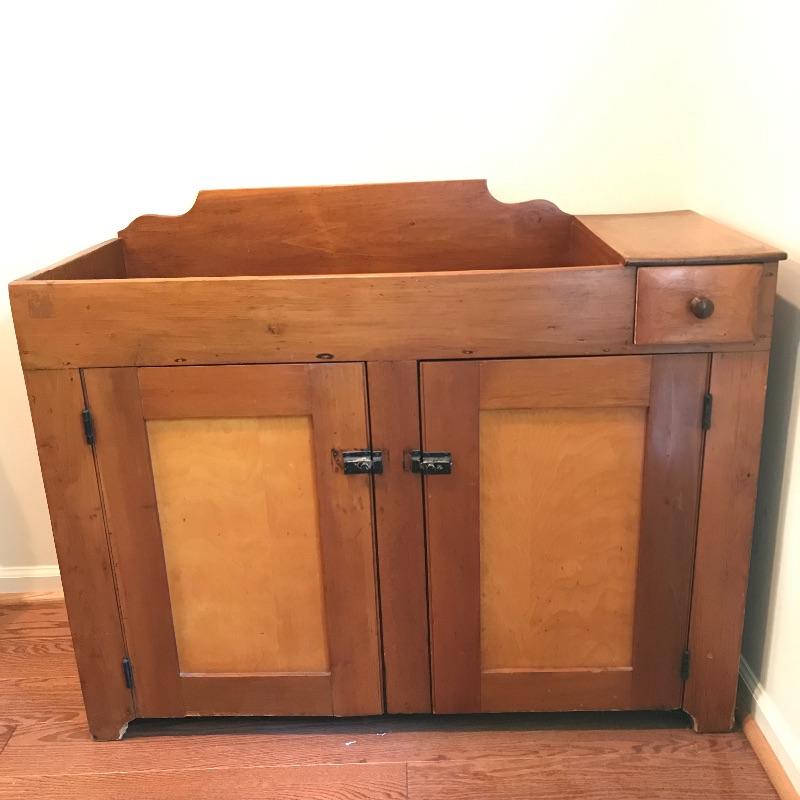 This charming vintage find has a ton of character and will add an old world feel to your space. Wooden dry sink has a wooden pull on its wide dovetail drawer and two metal latches for the doors and comes with 2 shelves. Piece is in wonderful shape given its age. There is a crack in the basin, but it doesn’t appear to affect integrity as piece is very sturdy. Dry sink measures 42.5” x 18.25” x 33.75” with a basin 5” deep. Local Pickup Only, please bring help to load.