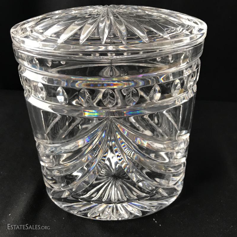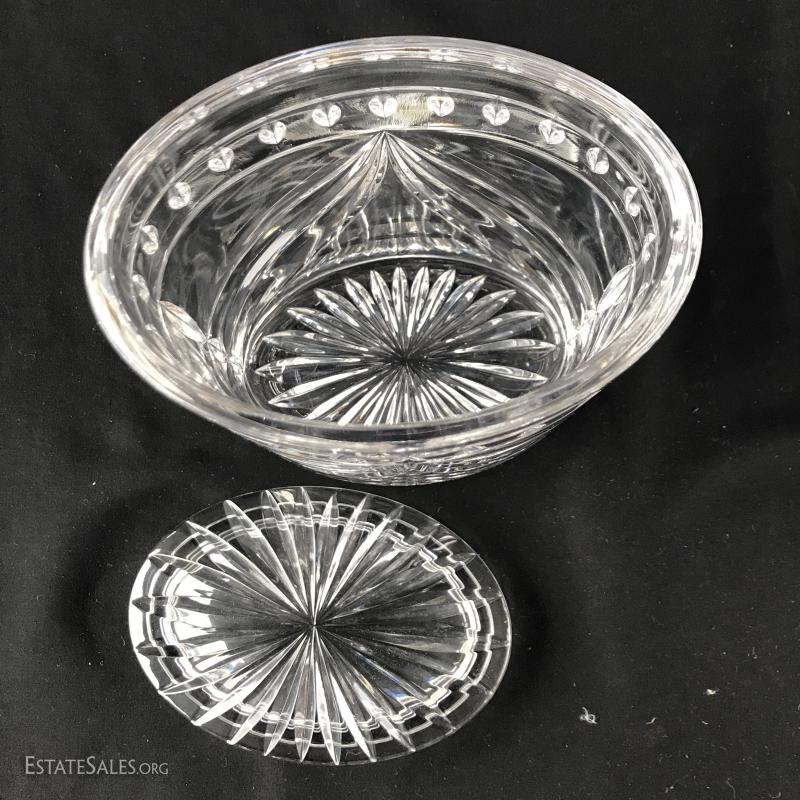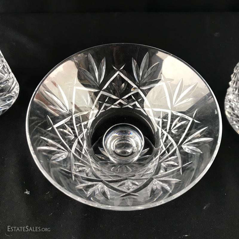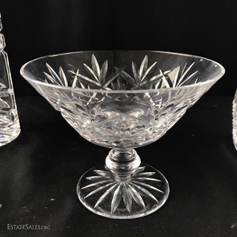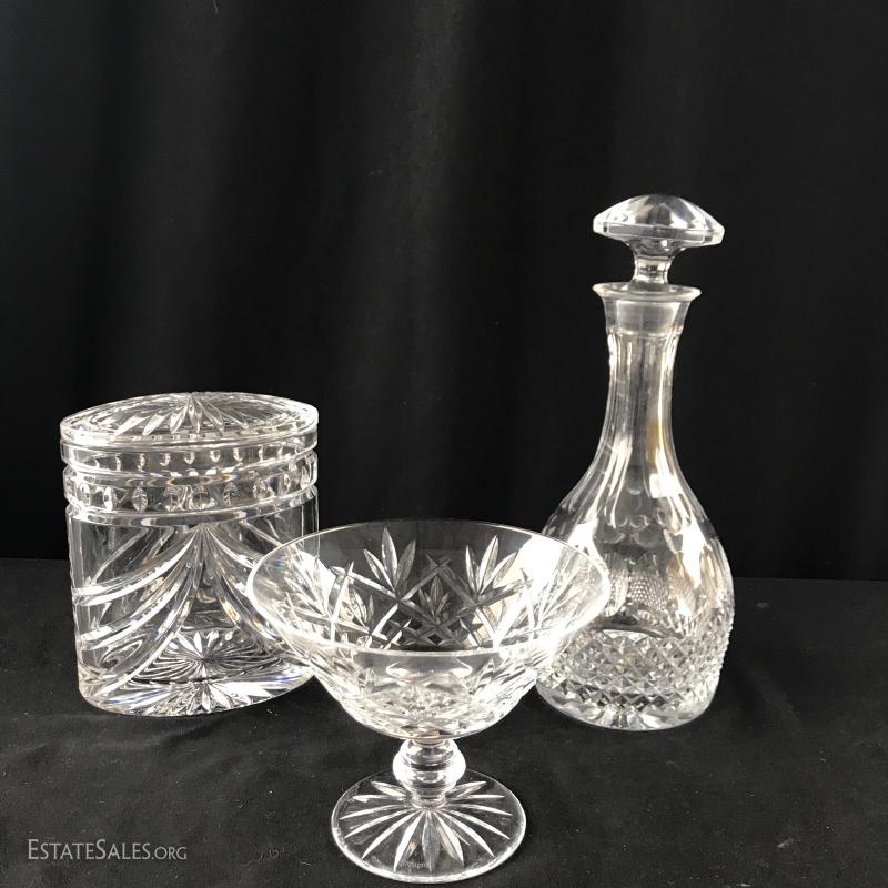 Two Waterford crystal pieces and crystal decanter. Small Waterford dish is 6” diameter and 5” tall. Waterford canister with lid is 6”l x 4”w x 6.5”tall. Decanter is 11”vtall. Shipping available or local pick up in Asheville, NC.