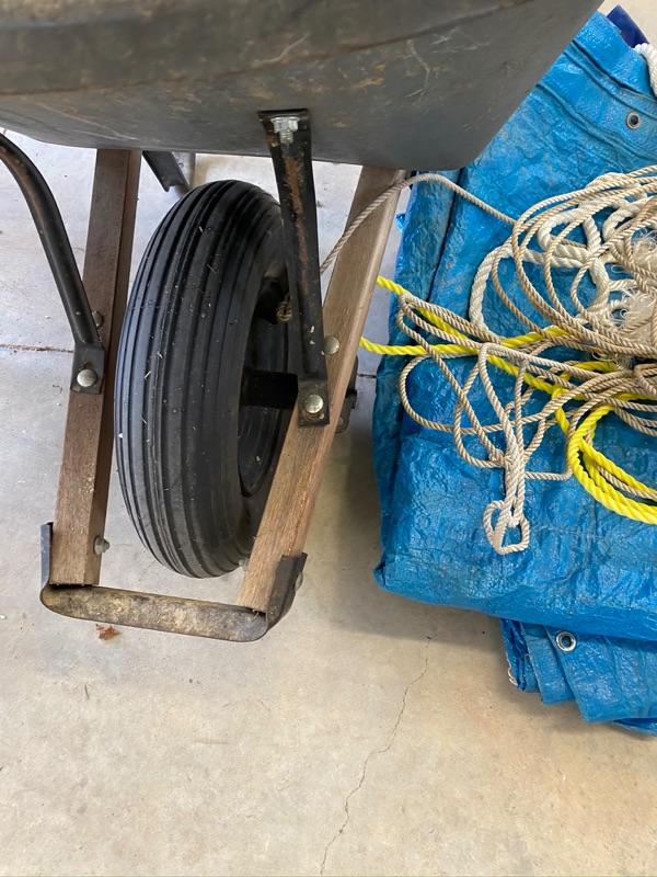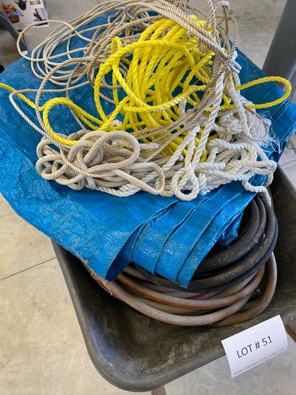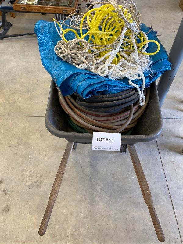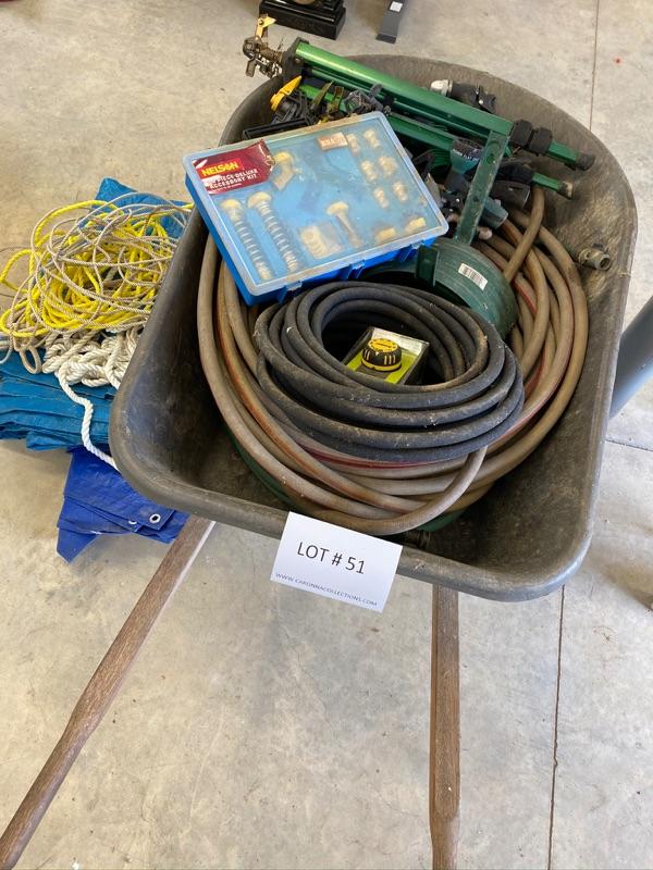 This lot includes True Temper Wheelbarrow, hoses, hose attachments, sprinkler, tarps, rope
