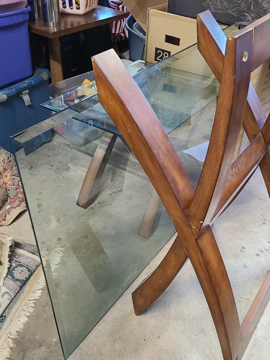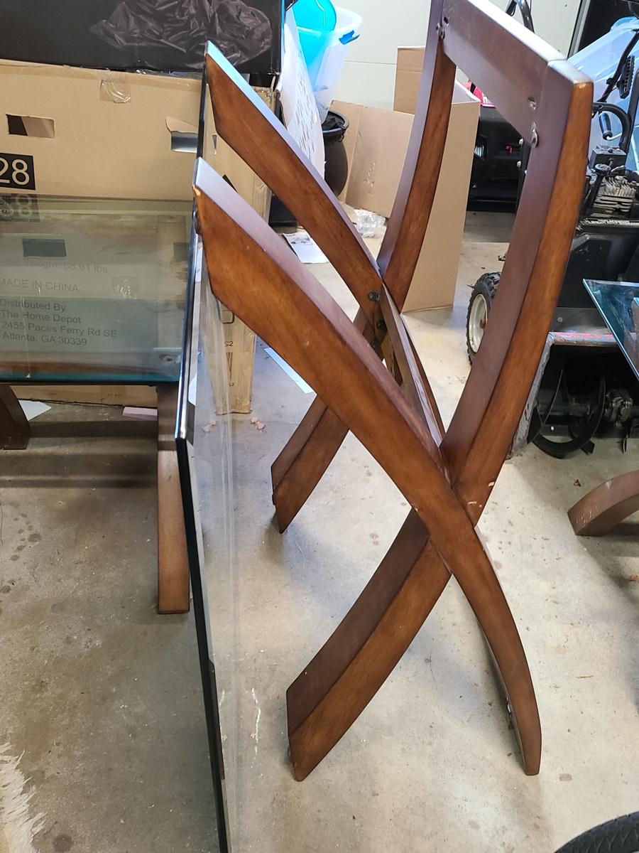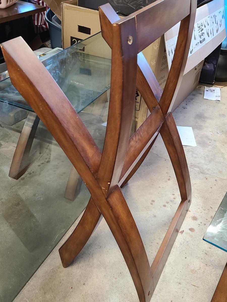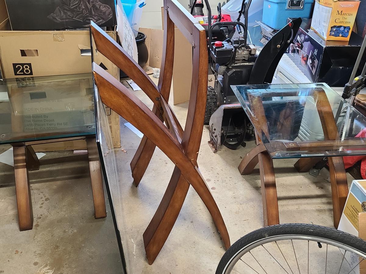 This lovely set is glass topped and comes with a dining table and two endtables. These have been stored in the garage and may need a light cleaning. Nice lines, and unique design! Please see all pictures. The pictures show condition, measurements if taken, and what is included in the lot. Due to the large amount that we photograph and the time frame, we are not always able to take measurements. All items unless noted, are pre-owned and have been used. If you purchased furniture, you must bring help. We do not allow one person to carry large furniture out on their own. Bring help, tools and a truck for the safety of our client’s homes, and your personal safety. Company policy. Thank you