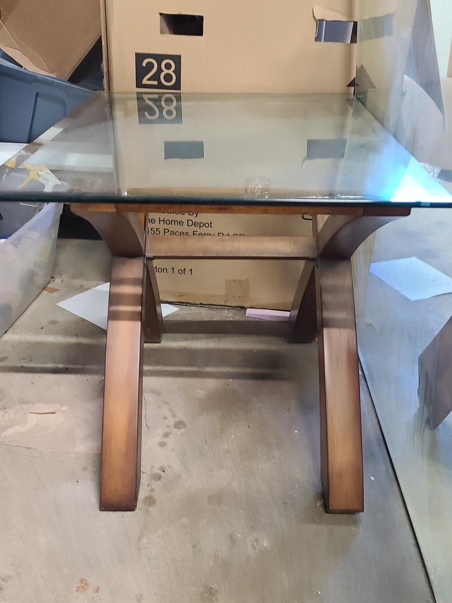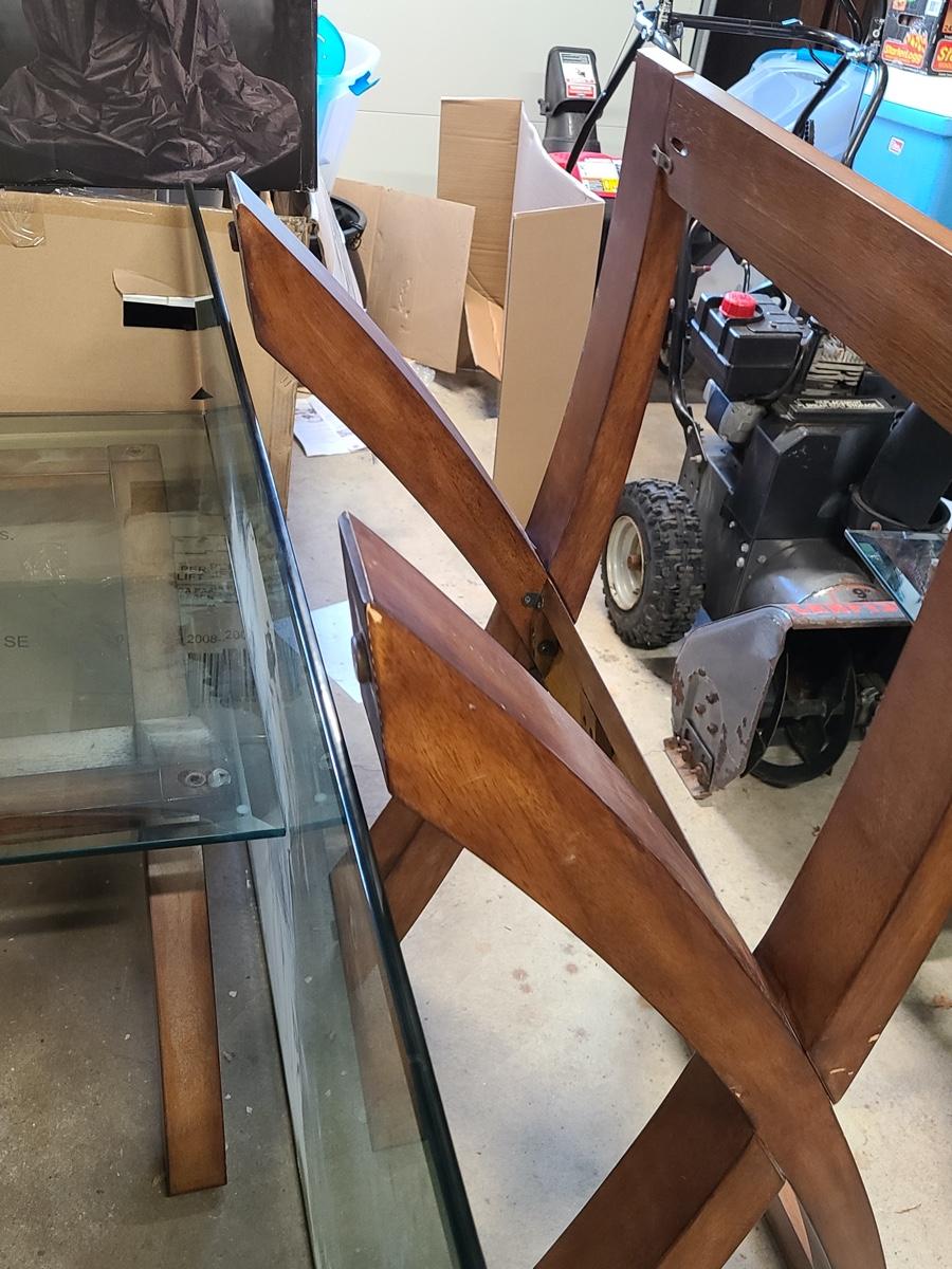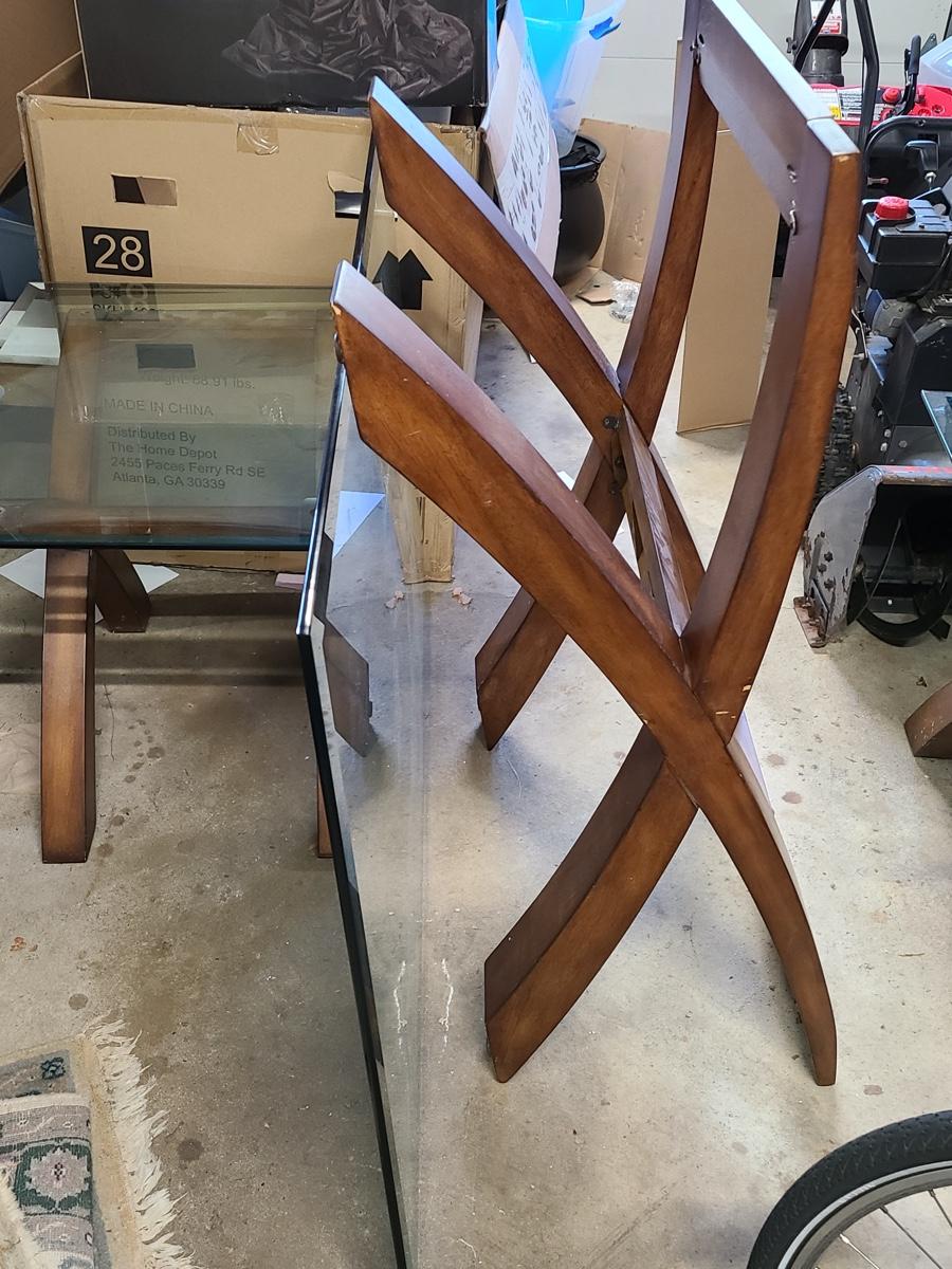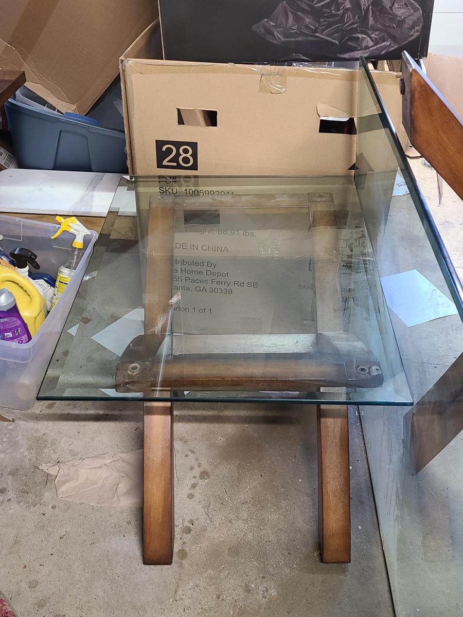 This lovely set is glass topped and comes with a dining table and two endtables. These have been stored in the garage and may need a light cleaning. Nice lines, and unique design! Please see all pictures. The pictures show condition, measurements if taken, and what is included in the lot. Due to the large amount that we photograph and the time frame, we are not always able to take measurements. All items unless noted, are pre-owned and have been used. If you purchased furniture, you must bring help. We do not allow one person to carry large furniture out on their own. Bring help, tools and a truck for the safety of our client’s homes, and your personal safety. Company policy. Thank you