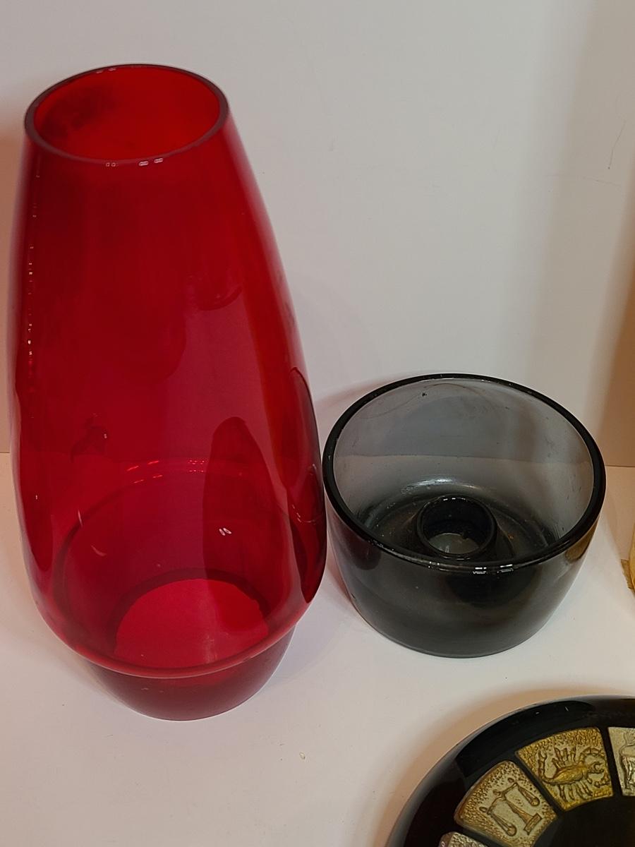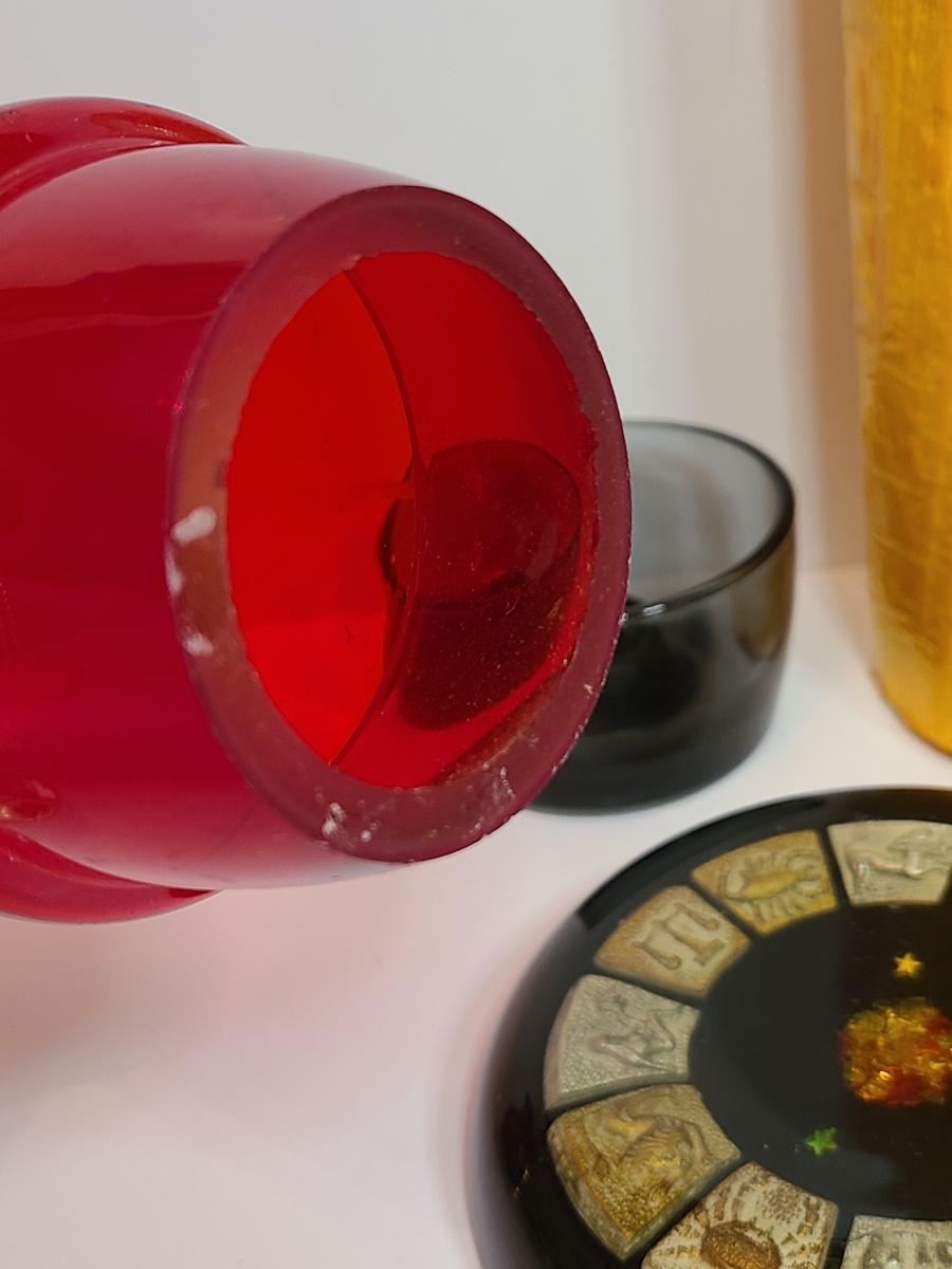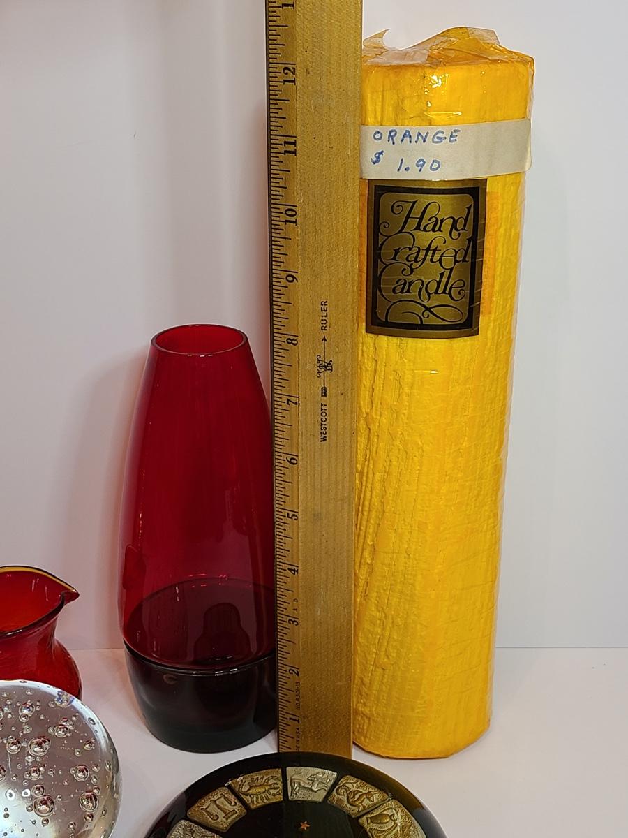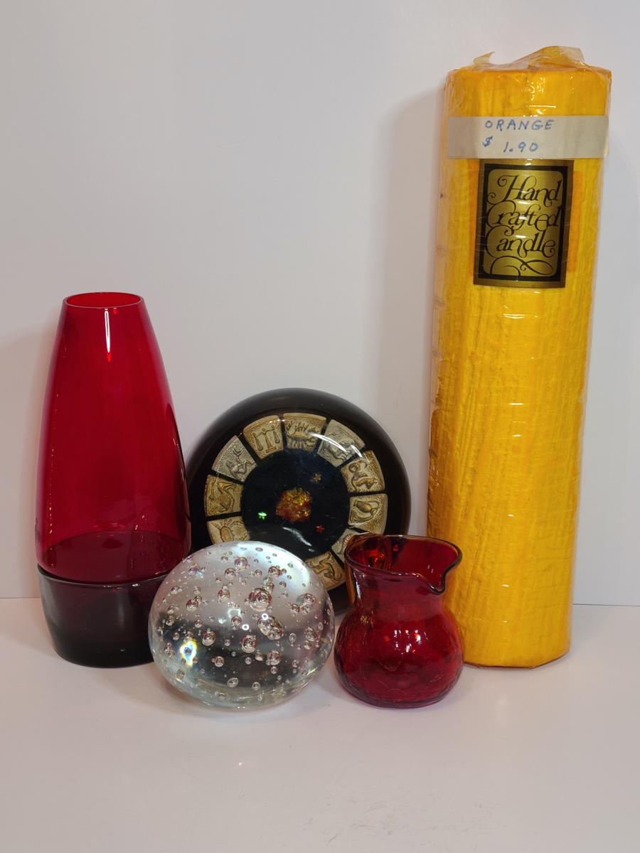 Vintage MCM home decor including a red glass candle globe with black base, a bubble clear paperweight, a zodiac resin keepsake, and large orange funky pillar candle! Please see all pictures as they are the best representation of the items. The pictures show condition, measurements if taken, and what is included in the lot. Due to the large amount that we photograph and the time frame, we are not always able to take measurements. All items unless noted, are pre-owned and have been used. If you purchased furniture, you must bring help. We do not allow one person to carry large furniture out on their own. Bring help, tools and a truck for the safety of our client’s homes, and your personal safety. Company policy. Thank you.