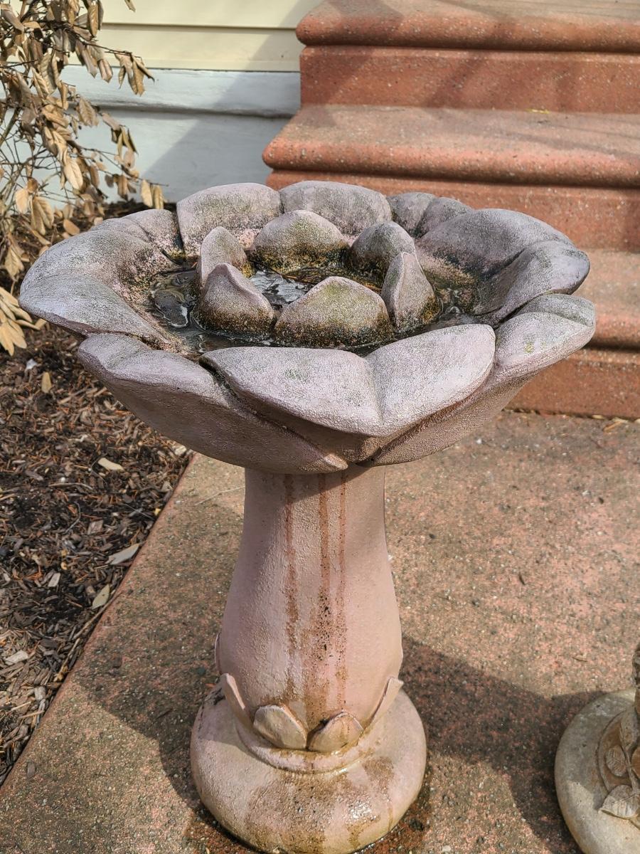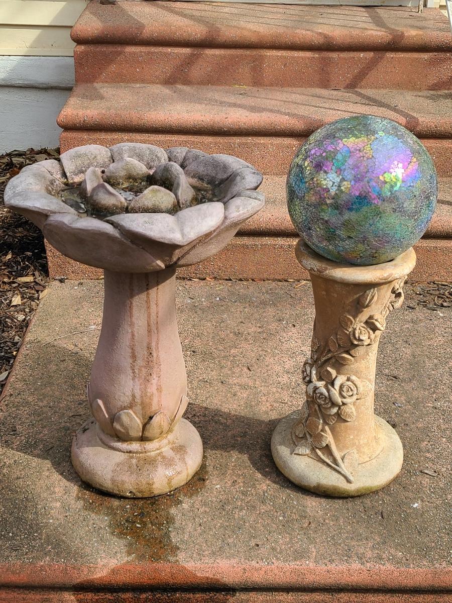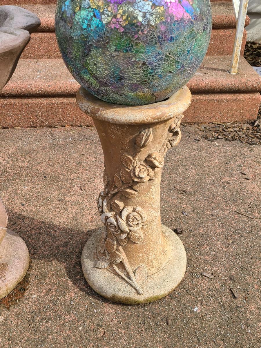 Resin Flower Bird Bath, and cement flower column stand with orb. Orb has damaged. Please see all pictures as they are the best representation of the items. The pictures show condition, measurements if taken, and what is included in the lot. Due to the large amount that we photograph and the time frame, we are not always able to take measurements. All items unless noted, are pre-owned and have been used. If you purchased furniture, you must bring help. We do not allow one person to carry large furniture out on their own. Bring help, tools and a truck for the safety of our client’s homes, and your personal safety. Any damages that result to the property including walls, and floors due to moving of the furniture will be charged to the buyer. Company policy. Thank you.