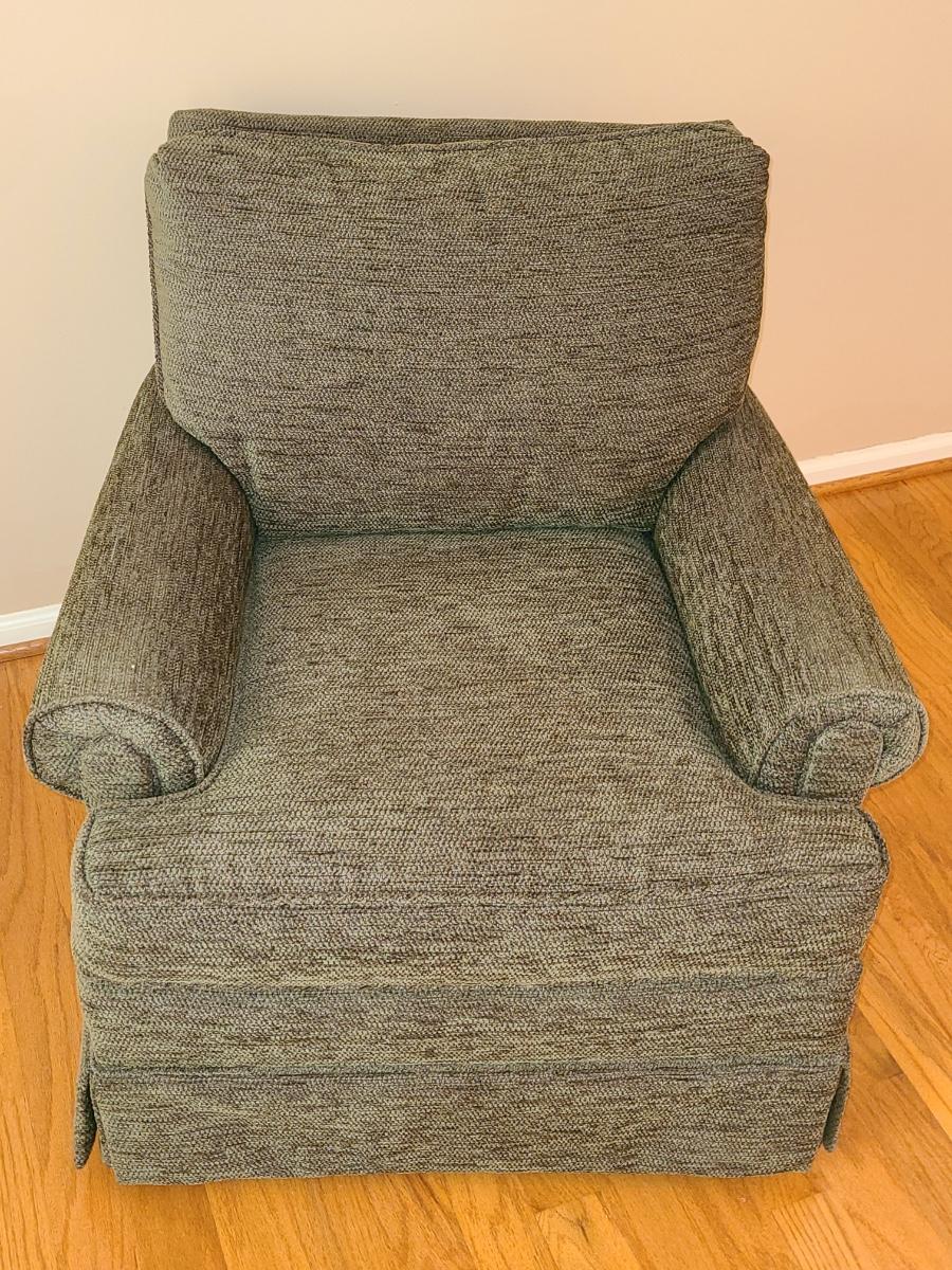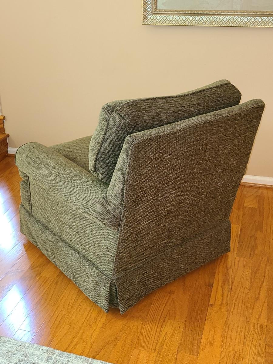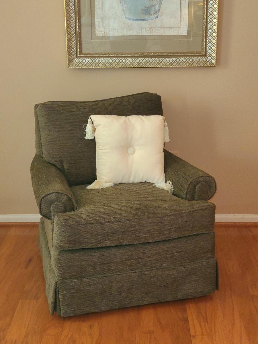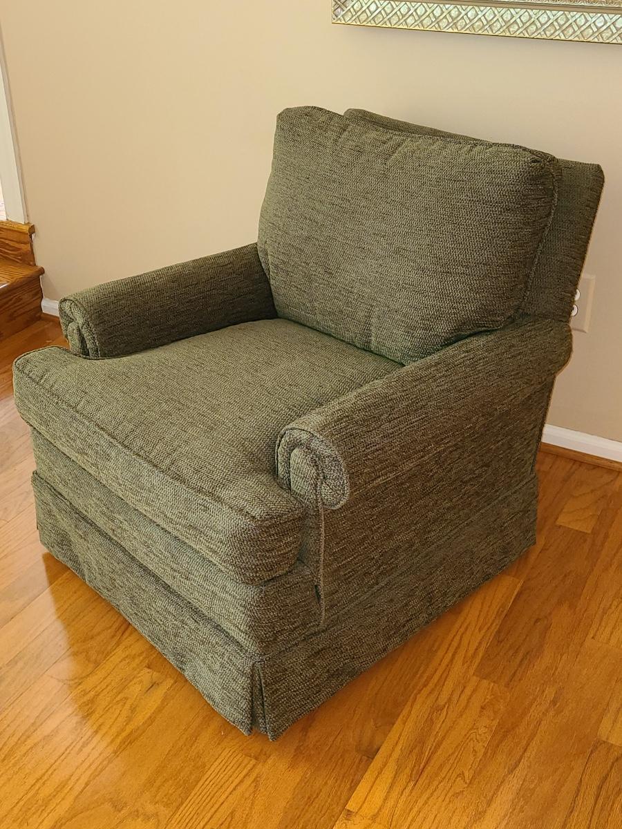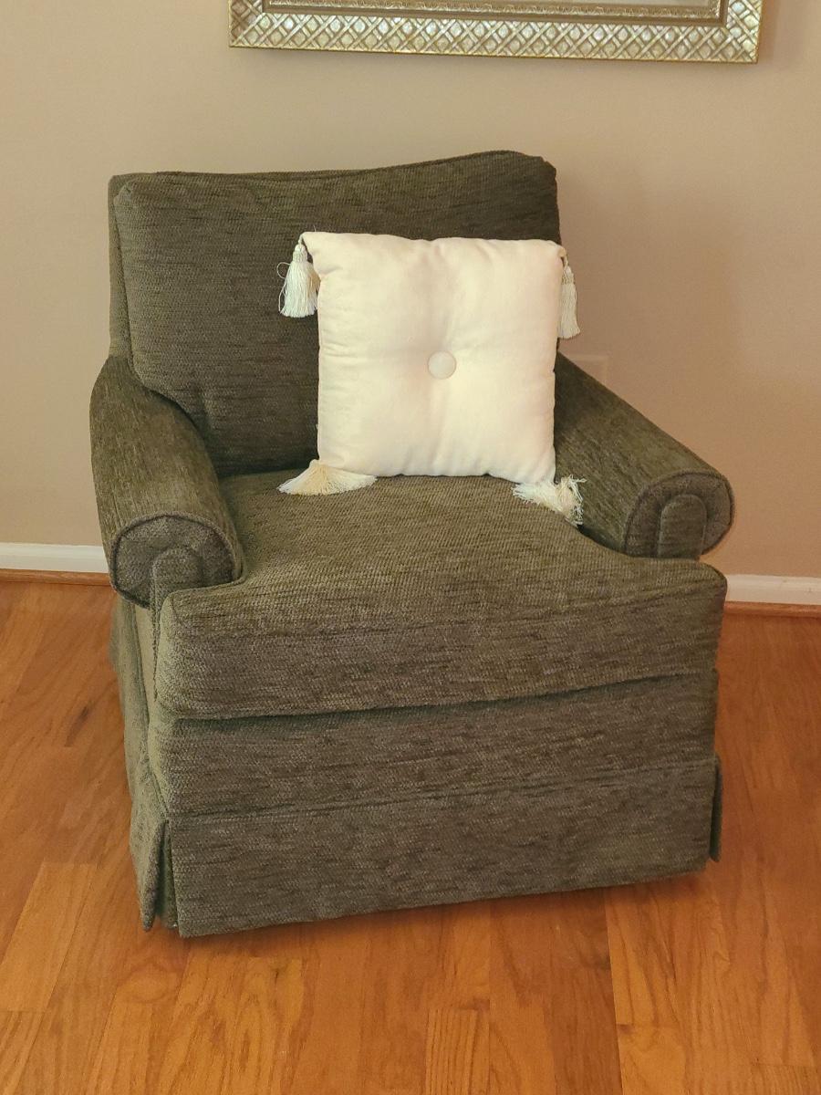 This piece of furniture is so comfortable! It still looks new, and is clean. It was used in a front sitting room. It is a soft velour like fabric, and would be perfect in any room of the home. Please see all pictures as they are the best representation of the items. The pictures show condition, measurements if taken, and what is included in the lot. Due to the large amount that we photograph and the time frame, we are not always able to take measurements. All items unless noted, are pre-owned and have been used. If you purchased furniture, you must bring help. We do not allow one person to carry large furniture out on their own. Bring help, tools and a truck for the safety of our client’s homes, and your personal safety. Any damages that result to the property including walls, and floors due to moving of the furniture will be charged to the buyer. Company policy. Thank you.