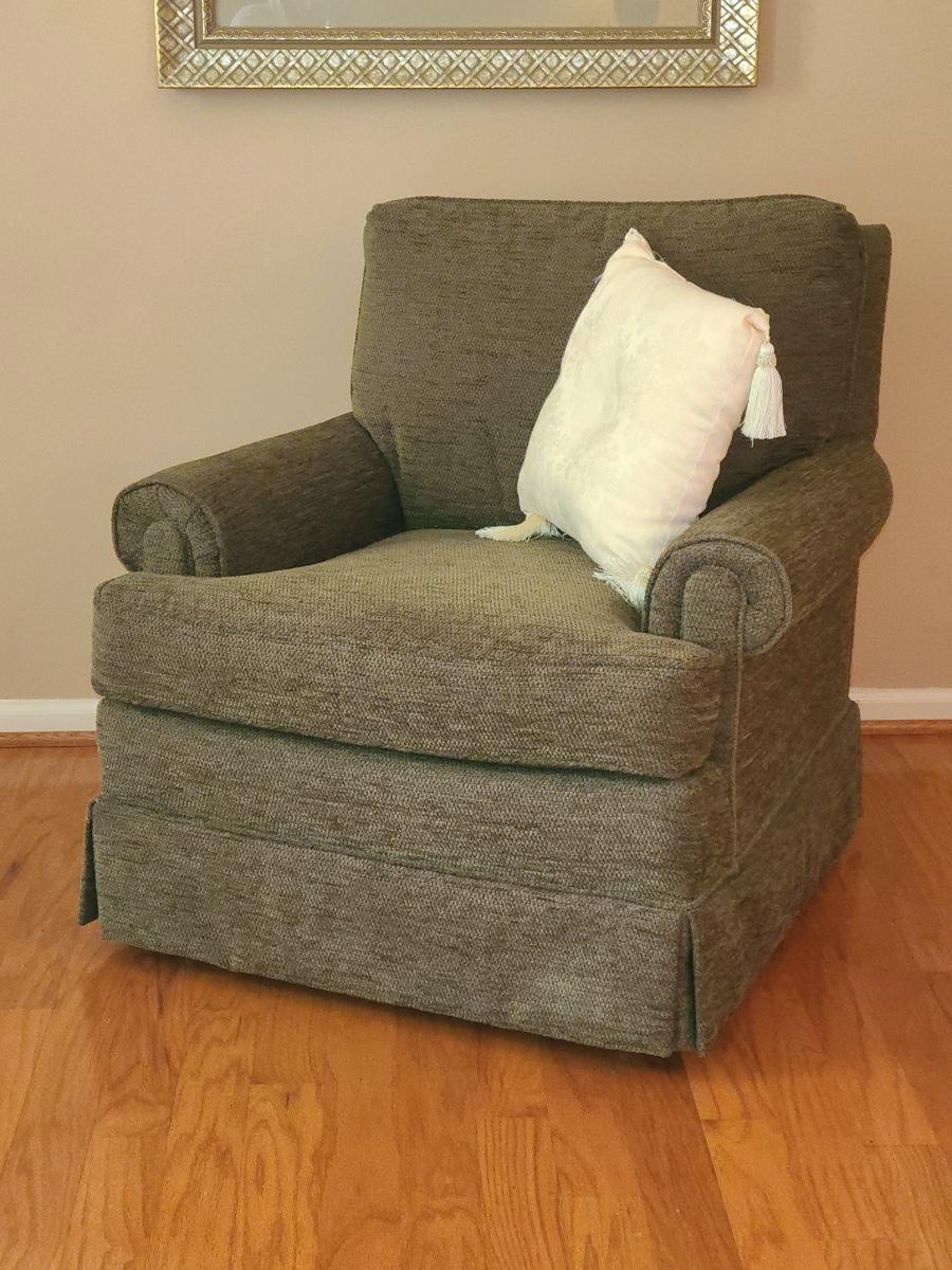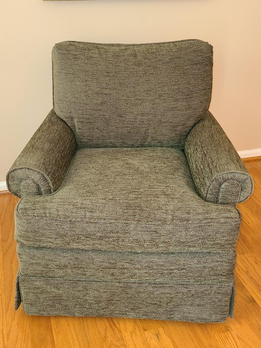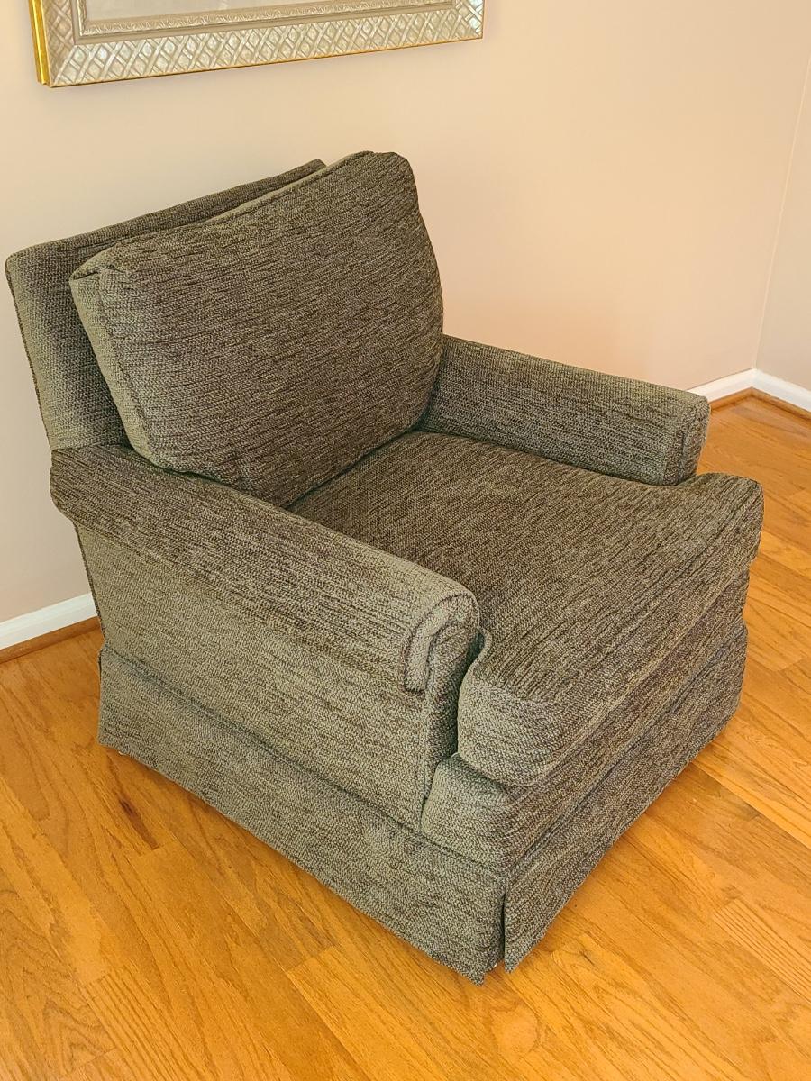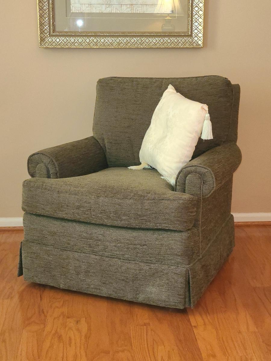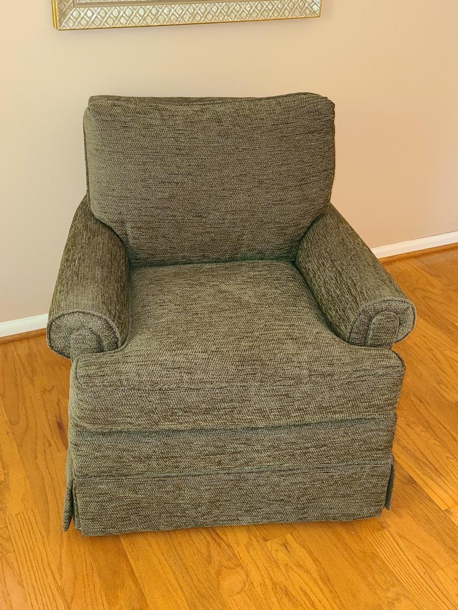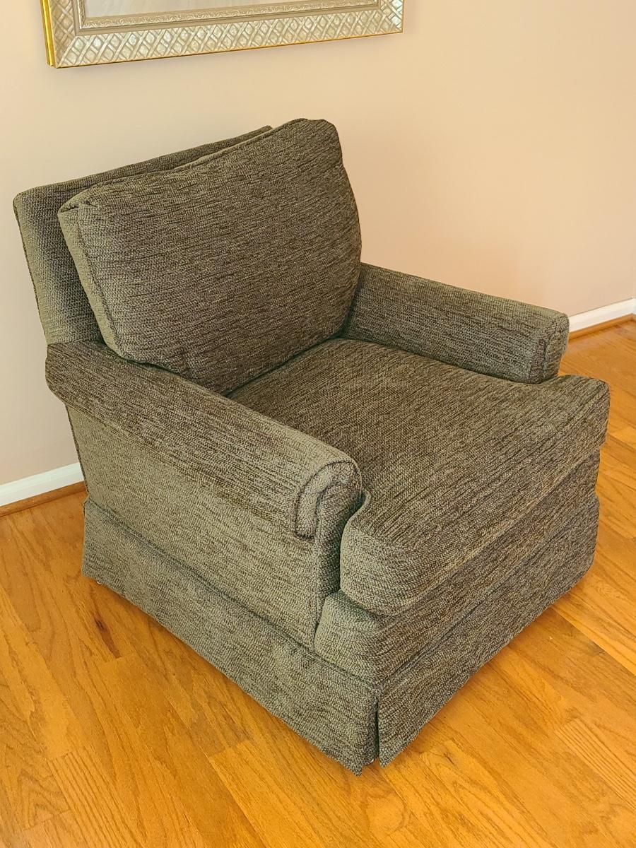 This piece of furniture is so comfortable! It still looks new, and is clean. It was used in a front sitting room. It is a soft velour like fabric, and would be perfect in any room of the home. Please see all pictures as they are the best representation of the items. The pictures show condition, measurements if taken, and what is included in the lot. Due to the large amount that we photograph and the time frame, we are not always able to take measurements. All items unless noted, are pre-owned and have been used. If you purchased furniture, you must bring help. We do not allow one person to carry large furniture out on their own. Bring help, tools and a truck for the safety of our client’s homes, and your personal safety. Any damages that result to the property including walls, and floors due to moving of the furniture will be charged to the buyer. Company policy. Thank you.