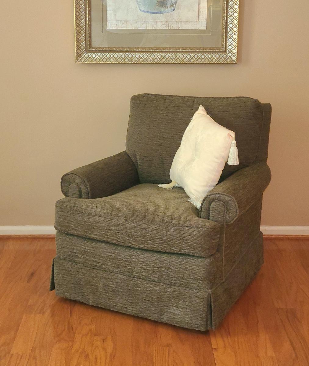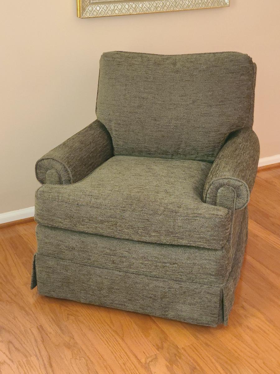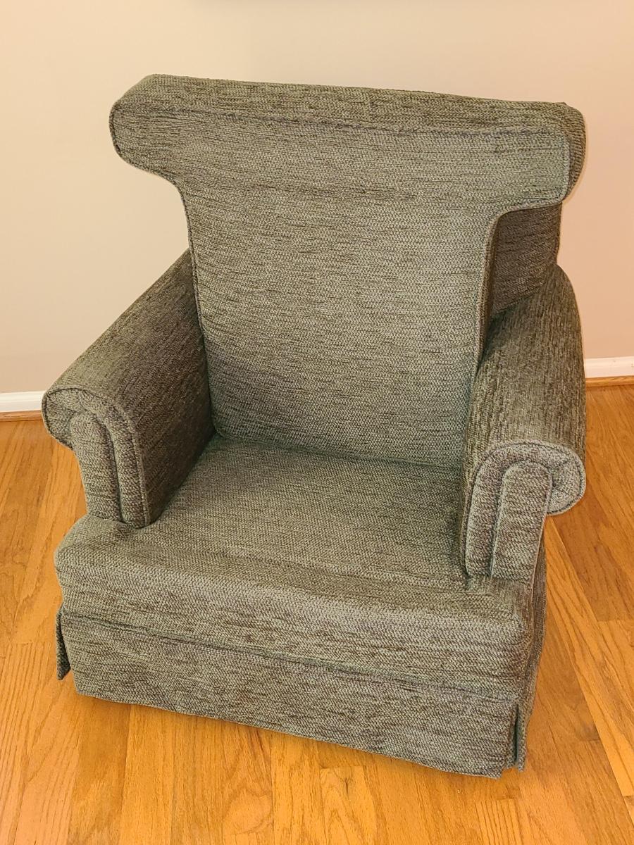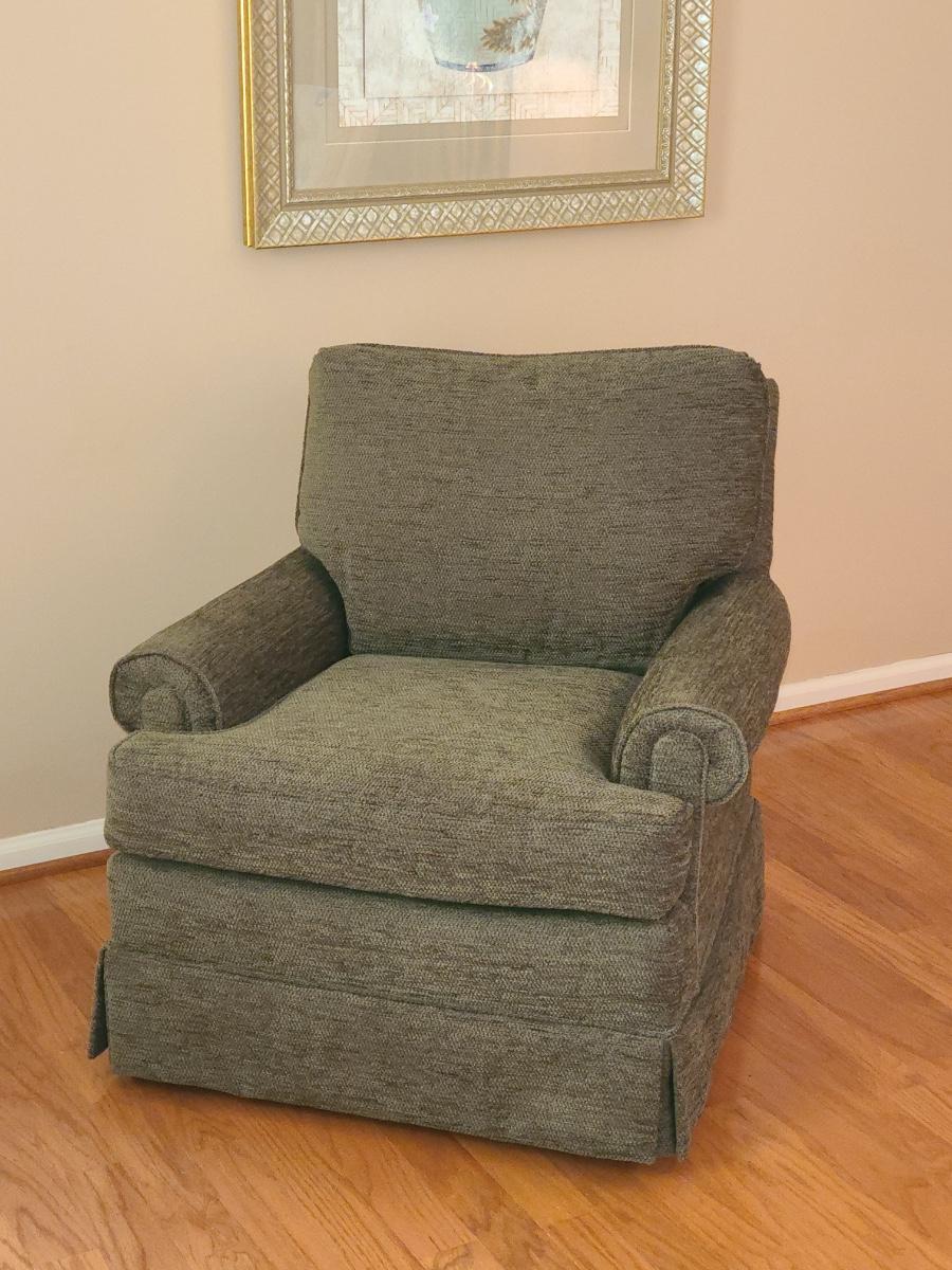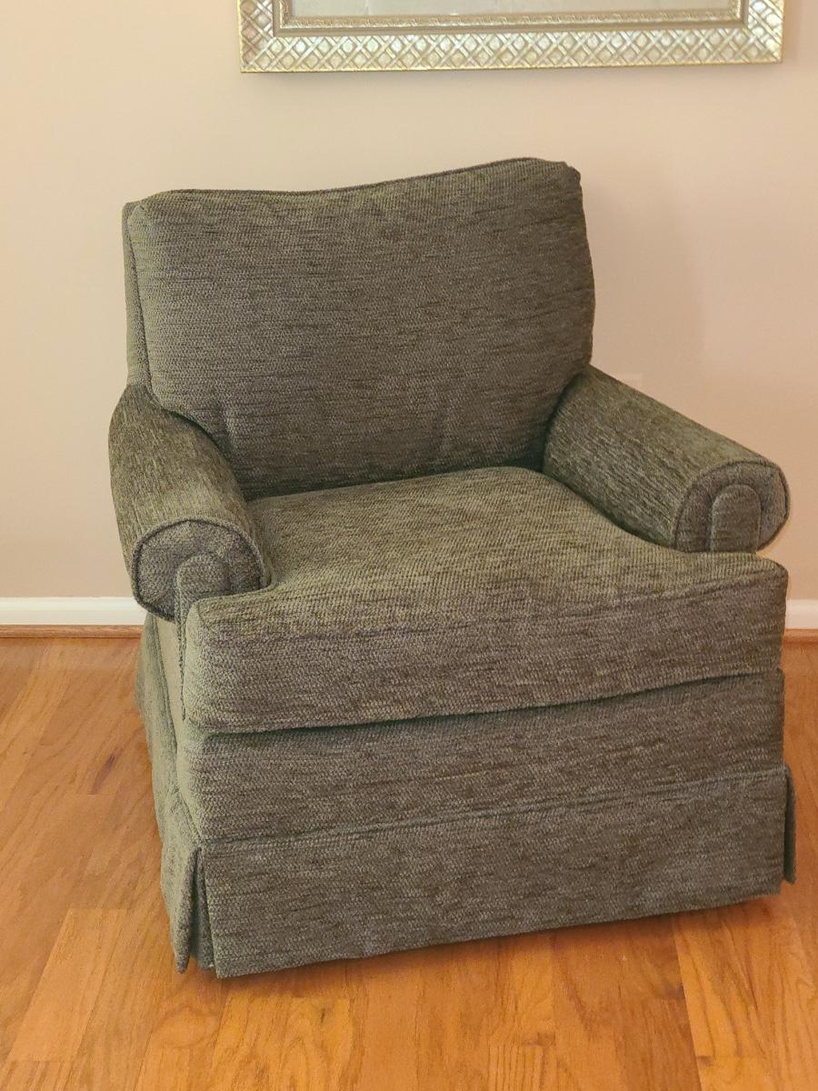 This piece of furniture is so comfortable! It still looks new, and is clean. It was used in a front sitting room. It is a soft velour like fabric, and would be perfect in any room of the home. Please see all pictures as they are the best representation of the items. The pictures show condition, measurements if taken, and what is included in the lot. Due to the large amount that we photograph and the time frame, we are not always able to take measurements. All items unless noted, are pre-owned and have been used. If you purchased furniture, you must bring help. We do not allow one person to carry large furniture out on their own. Bring help, tools and a truck for the safety of our client’s homes, and your personal safety. Any damages that result to the property including walls, and floors due to moving of the furniture will be charged to the buyer. Company policy. Thank you.