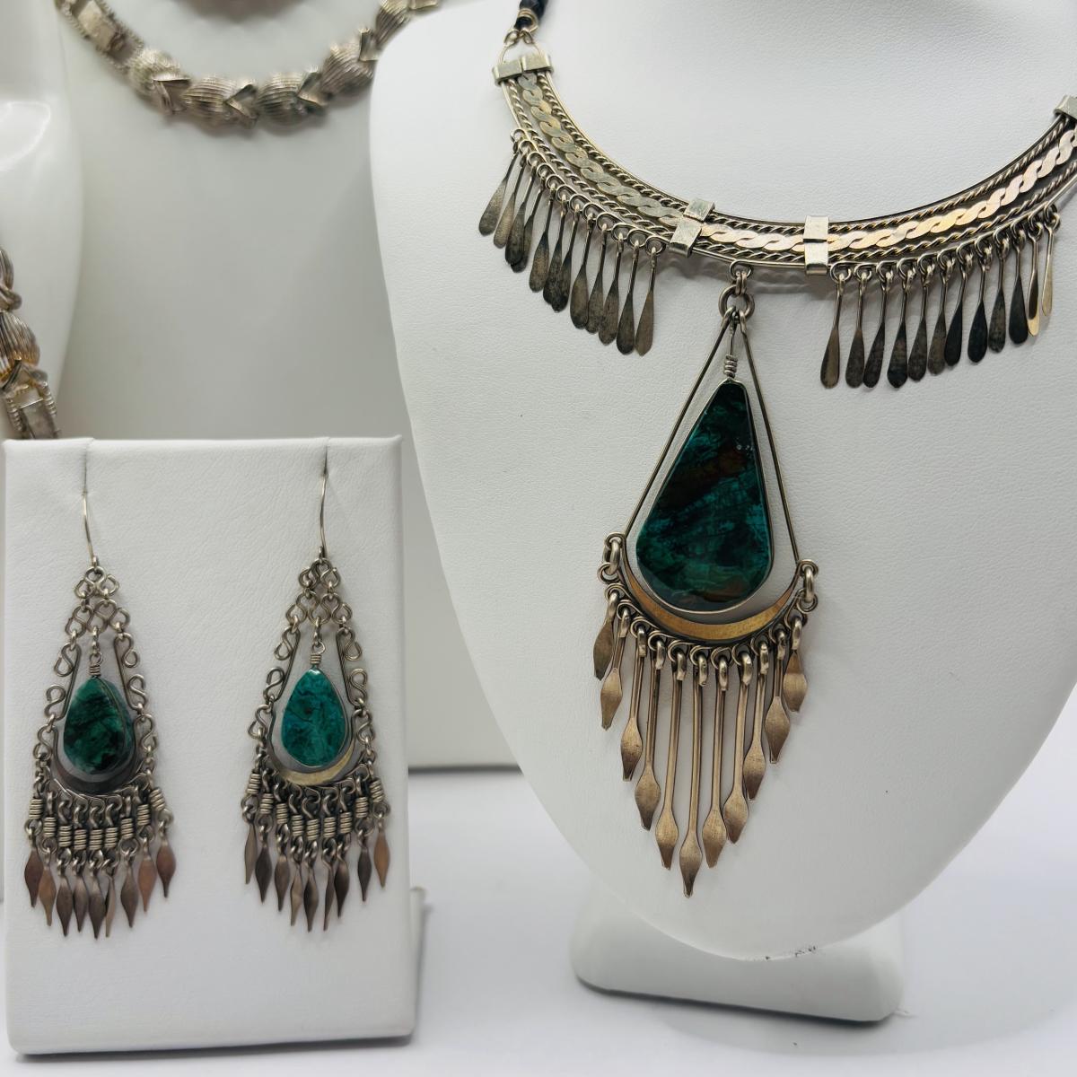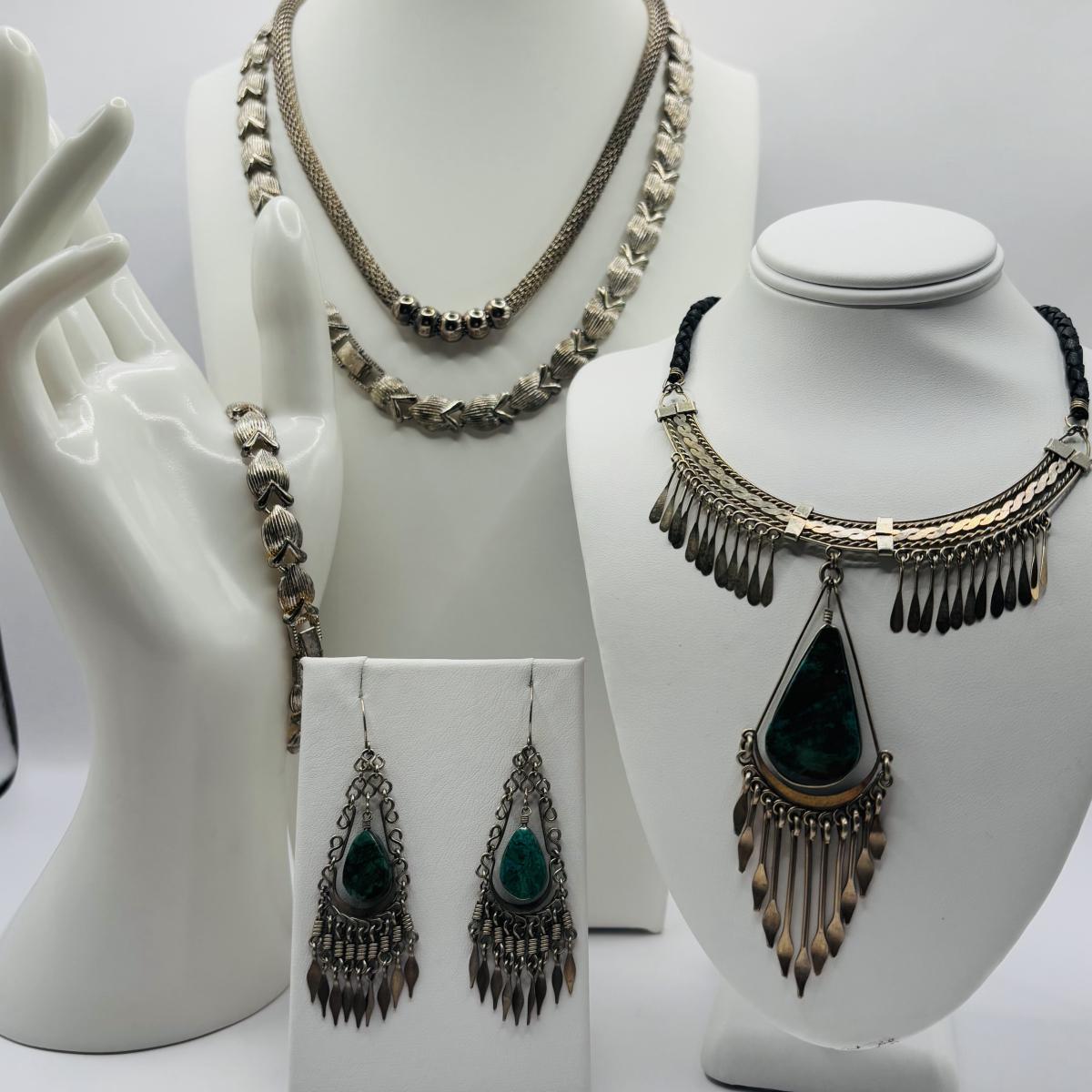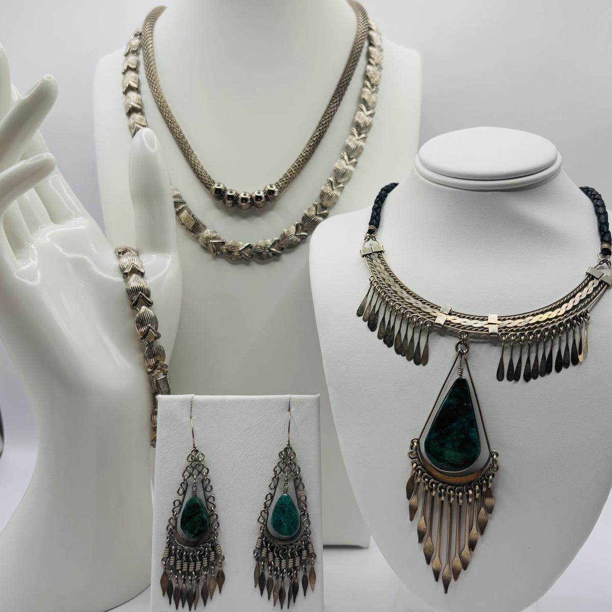 Lot 510J: Silvertone Teardrop Polished Stone Necklace w/Earrings, & Silvertone Necklace w/Bracelet & More