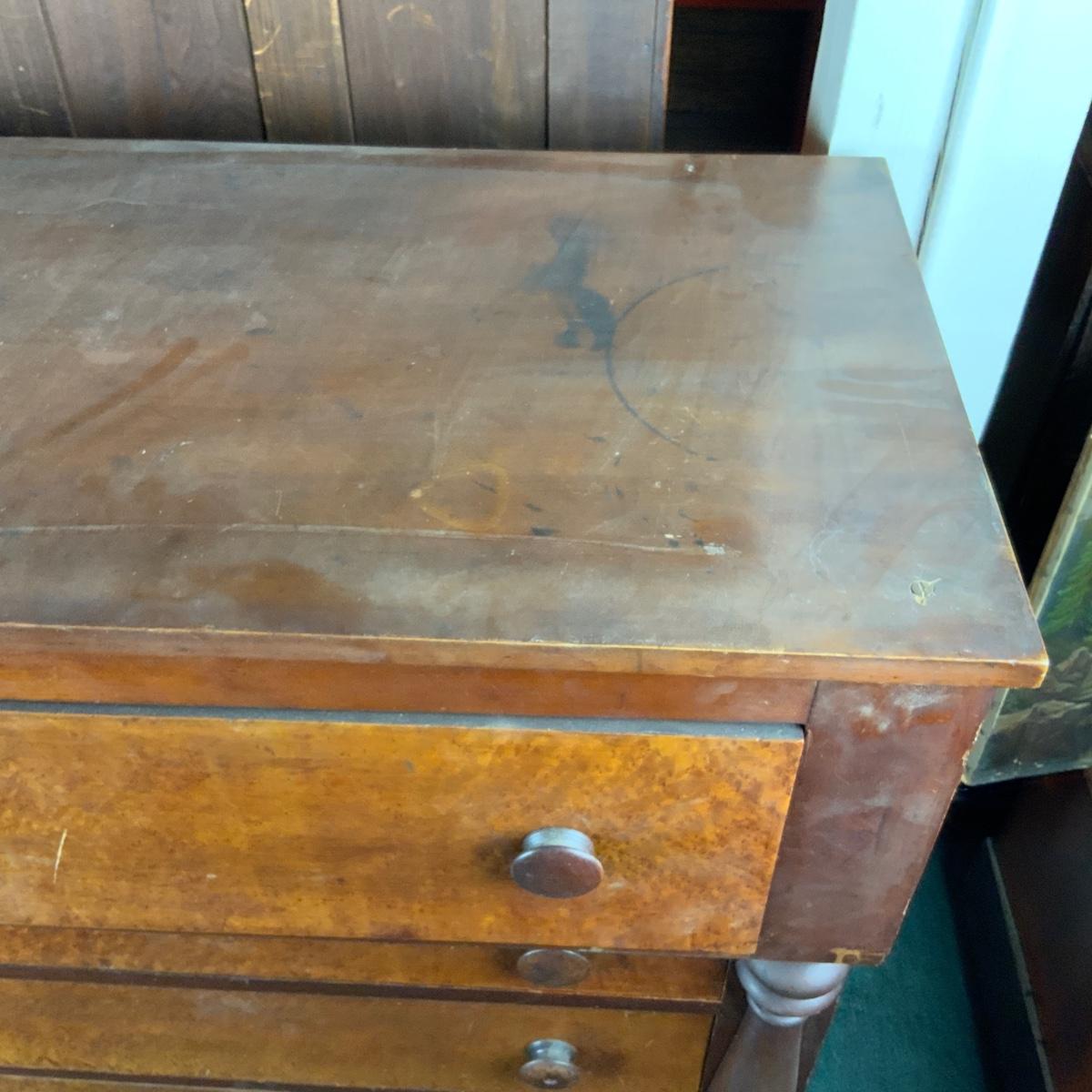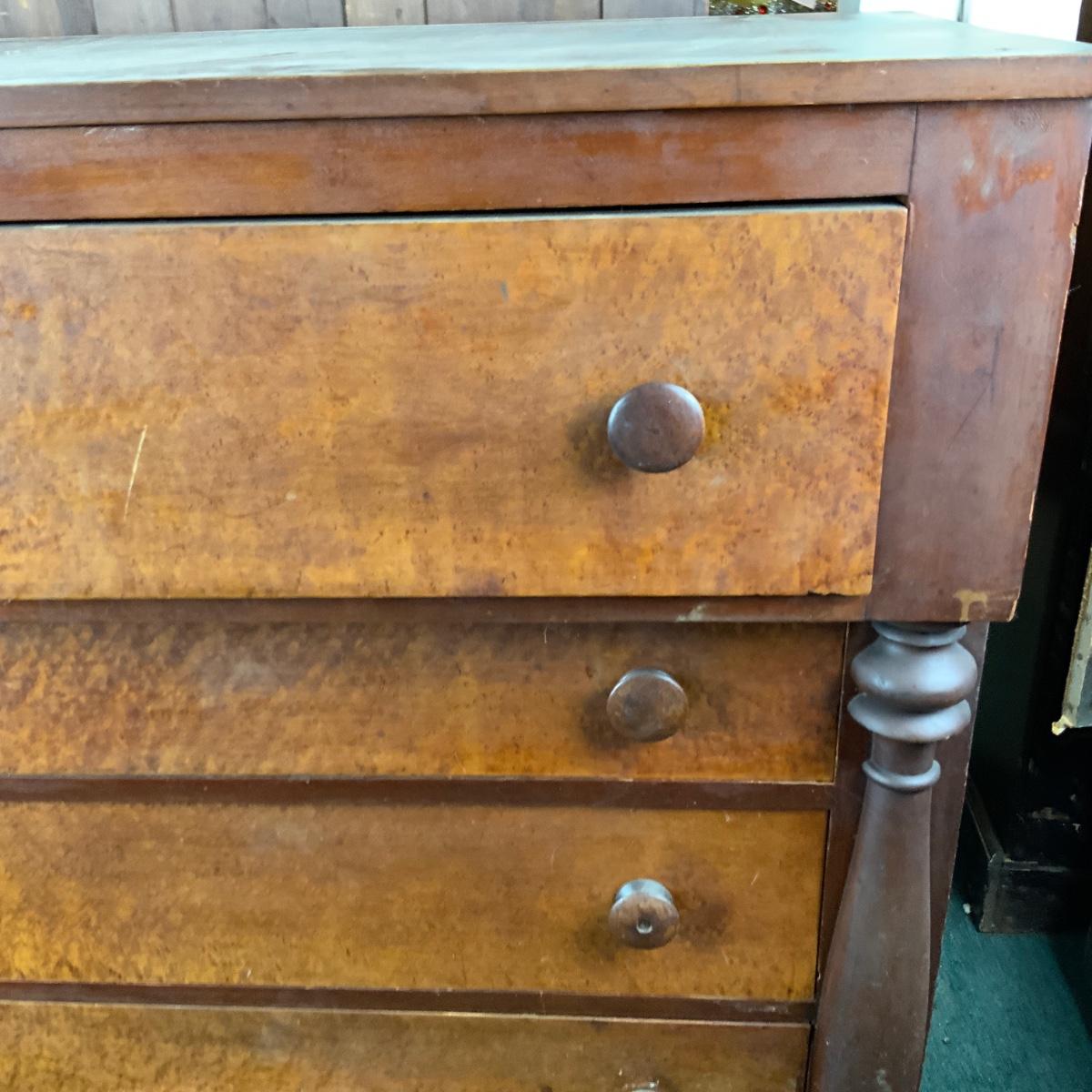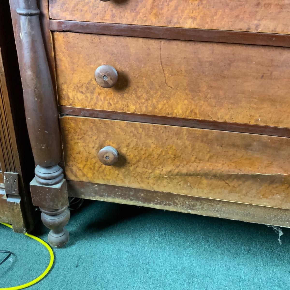 Cherry and Birdseye Maple Empire Chest. An attractive piece. Needs some restoration. //::\\ Please see photos for details and condition. No attempt has been made to hide any imperfections. All items listed in this auction are warehouse items, and need to be cleaned. A majority of the items need restoration as well. All items are sold AS IS and WITHOUT GUARANTEE. If you are uncertain about an item, DO NOT BID. Due to the nature of this online auction in-person inspection is HIGHLY recommended. All Sales are FINAL. Pick Up Times are FIRM. Please confirm with your own schedule that you can pick up in the scheduled times listed in the Terms and Conditions. Any questions please message the auctioneer. DO NOT Contact The Harp Gallery.