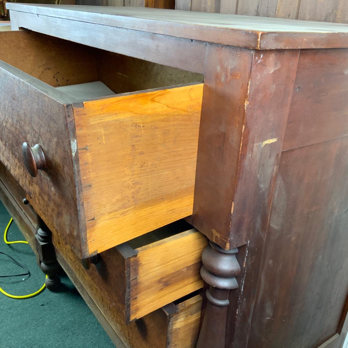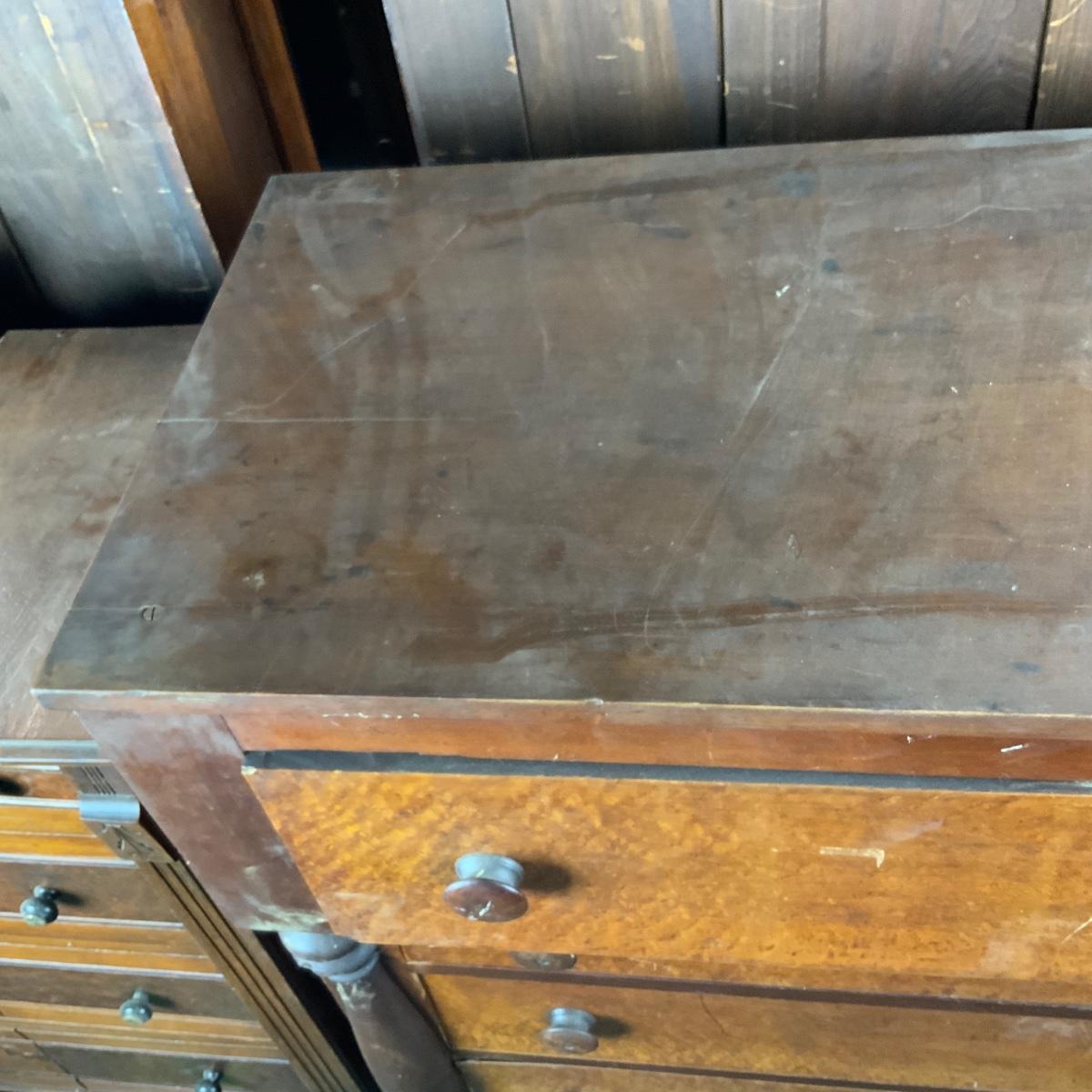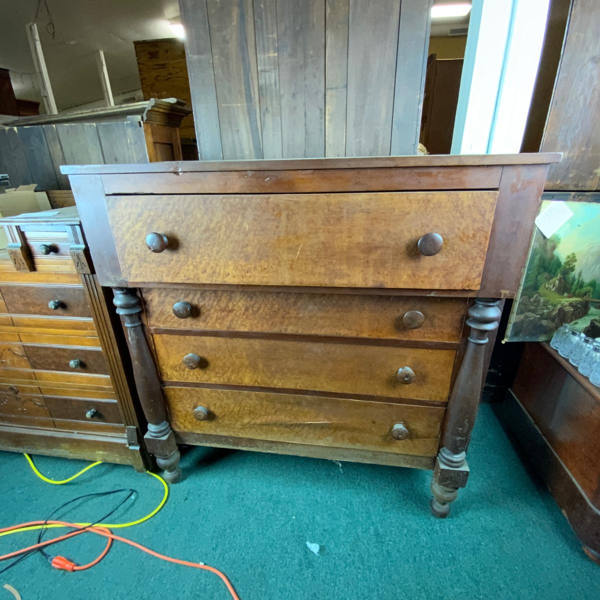Cherry and Birdseye Maple Empire Chest. An attractive piece. Needs some restoration. //::\\ Please see photos for details and condition. No attempt has been made to hide any imperfections. All items listed in this auction are warehouse items, and need to be cleaned. A majority of the items need restoration as well. All items are sold AS IS and WITHOUT GUARANTEE. If you are uncertain about an item, DO NOT BID. Due to the nature of this online auction in-person inspection is HIGHLY recommended. All Sales are FINAL. Pick Up Times are FIRM. Please confirm with your own schedule that you can pick up in the scheduled times listed in the Terms and Conditions. Any questions please message the auctioneer. DO NOT Contact The Harp Gallery.
