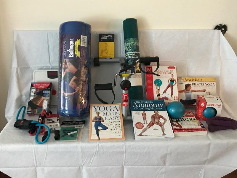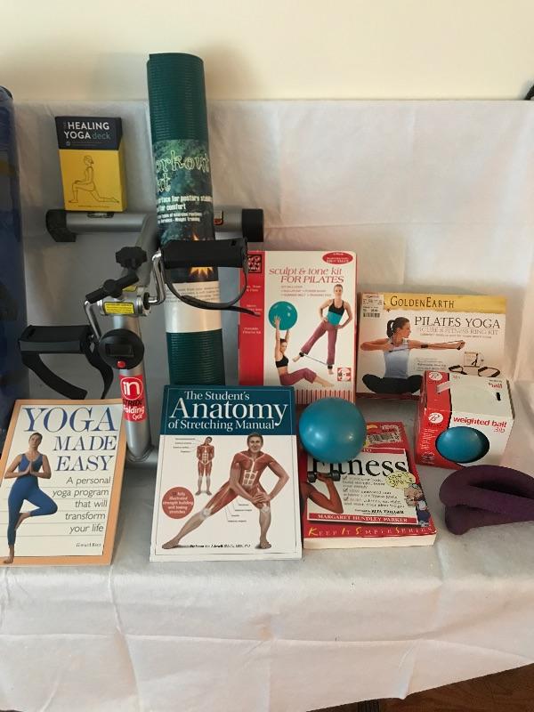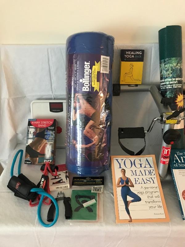 This lot includes a cloth exercise mat, yoga mat, digital scale, In Stride Folding Cycle, Pilates sculpt & tone kit, pair of 3 lb. weighted balls, yoga positions cards, yoga & Pilates ring kit, Yoga Made Easy book and The Students Anatomy of Stretching Manual