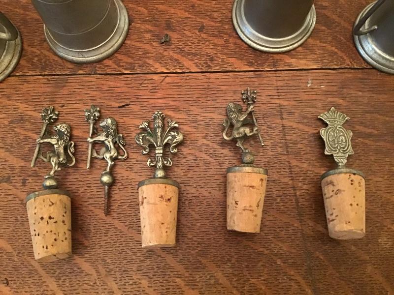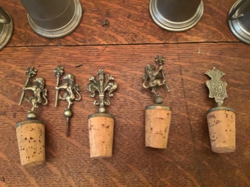 5 VINTAGE DECORATIVE PEWTER WINE CORKS