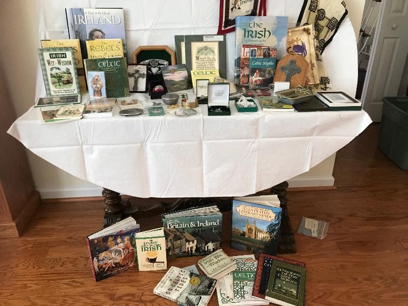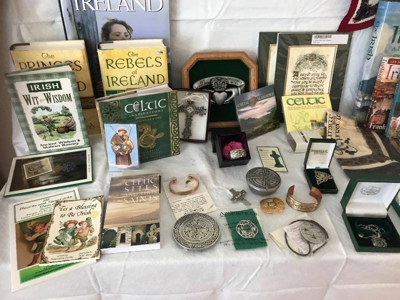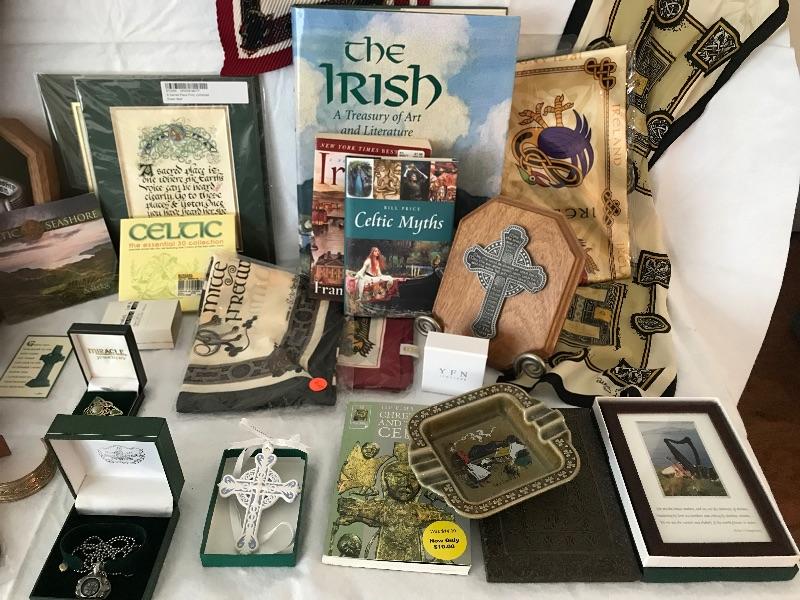 Books, Scarves-2 Silk Patrick Francis “Book of Kells”, 2 synthetic inspired by “ Book of Kells “, Celtic Cd’s, Decorative items,Wedgwood Ornament, Ashtray, Celtic Jewelry (Pewter necklace, Sterling Silver necklace) Napkin rings and more.