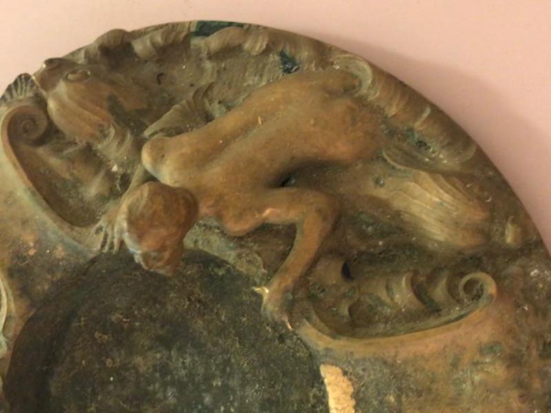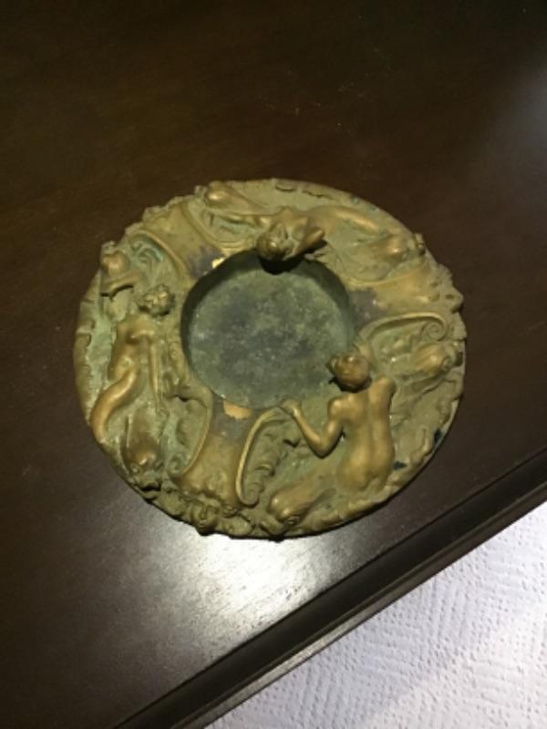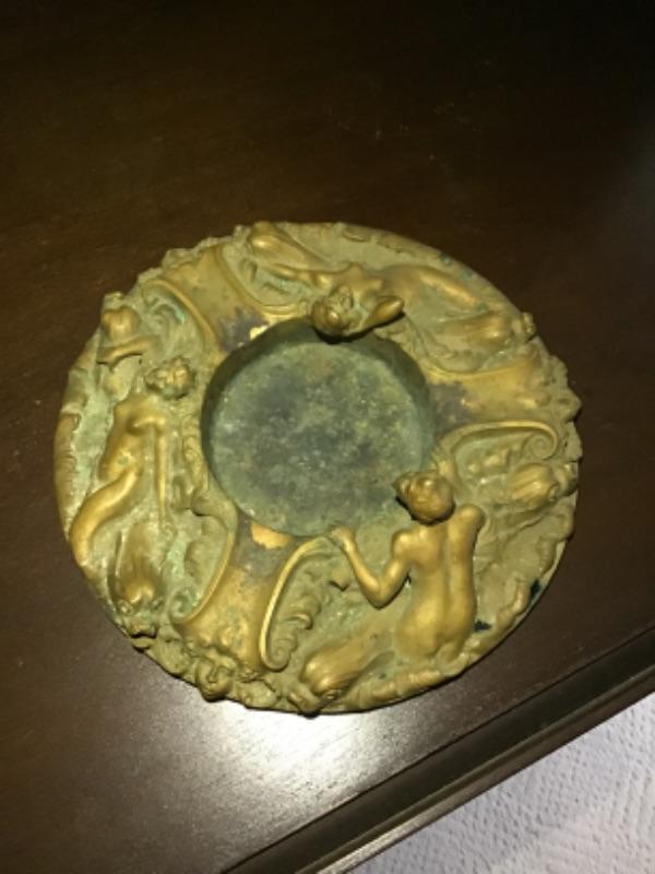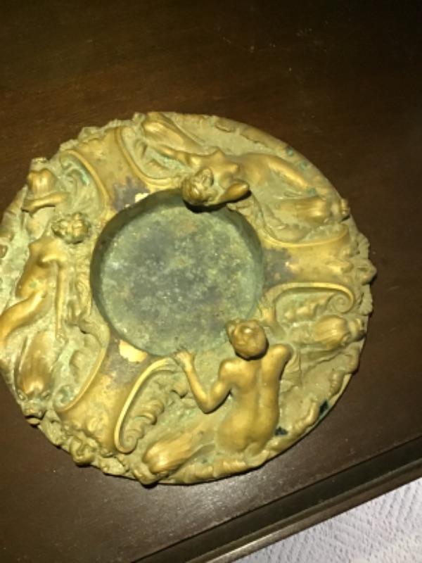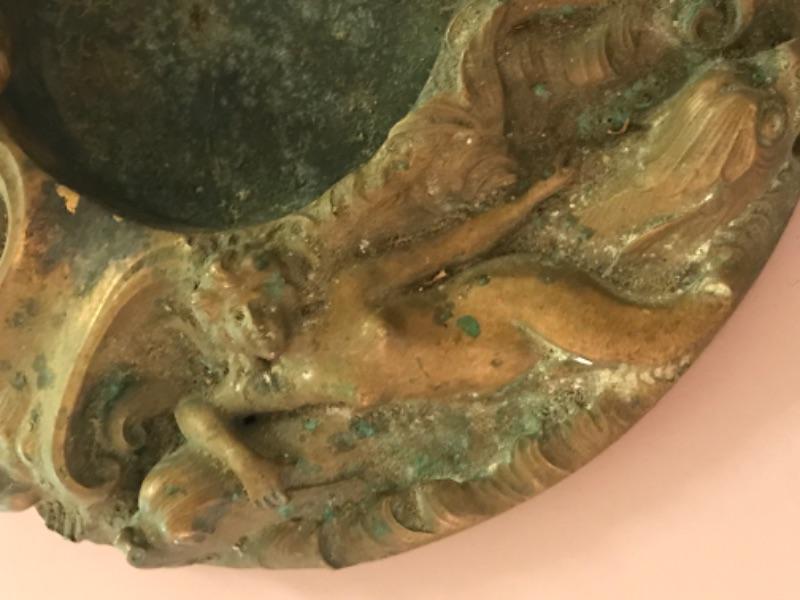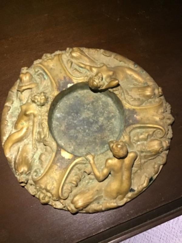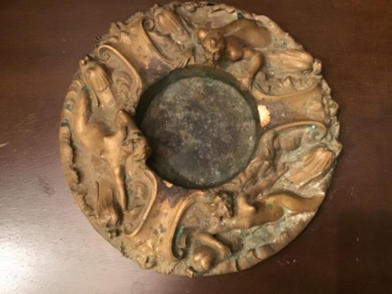 ANTIQUE BRONZE ASH TRAY - Nudes, Dolphins, Lucifer 8” IN DIAMETER
