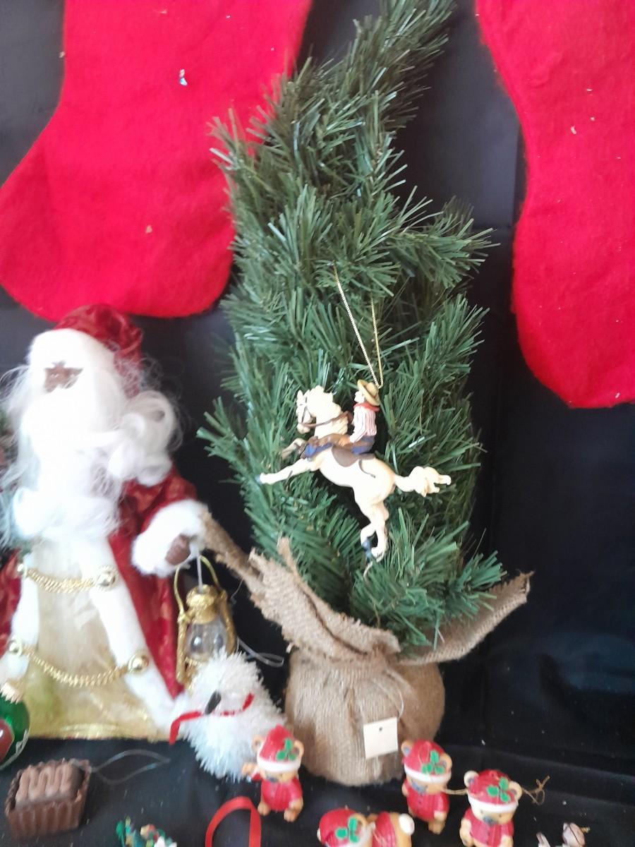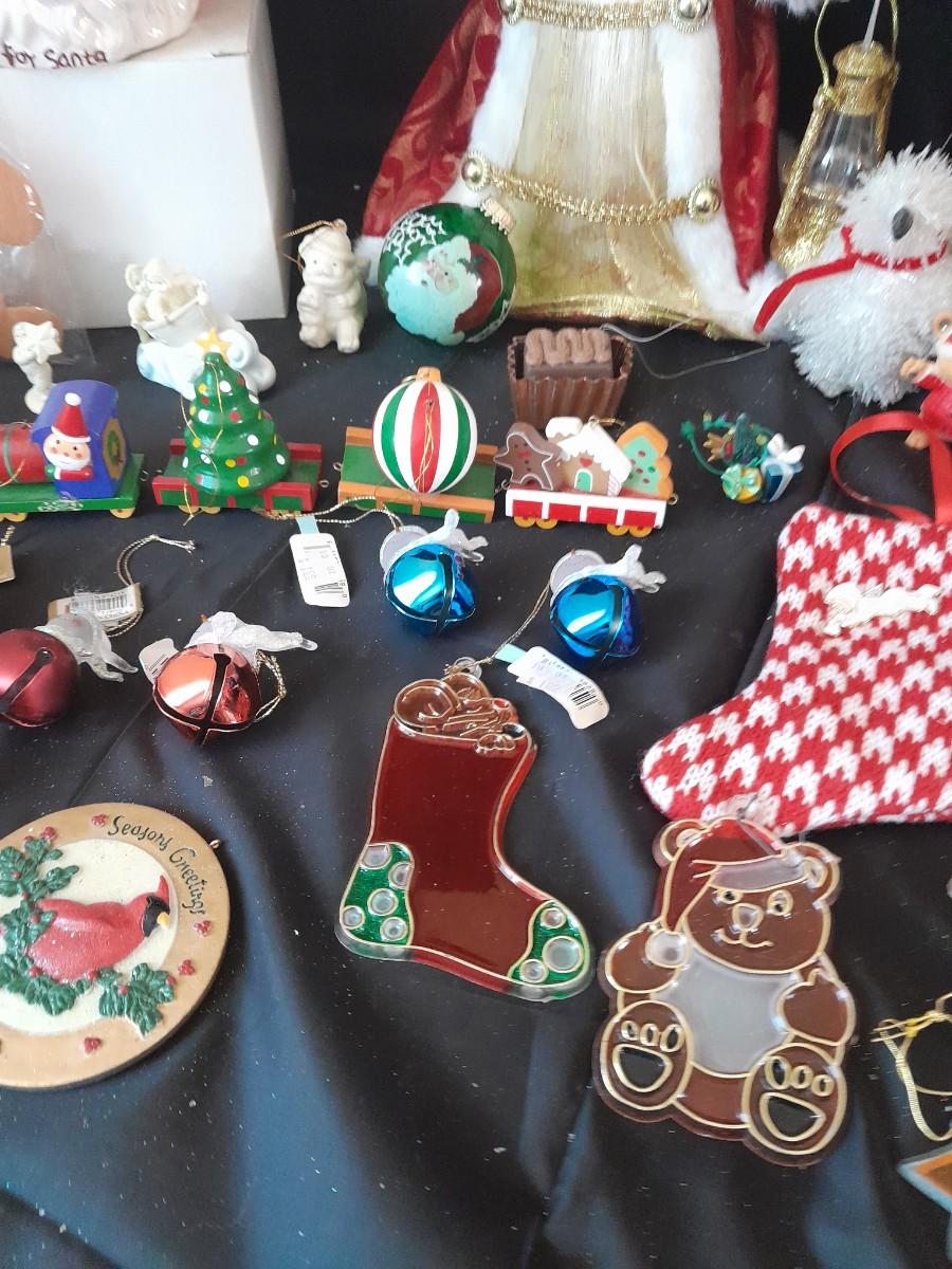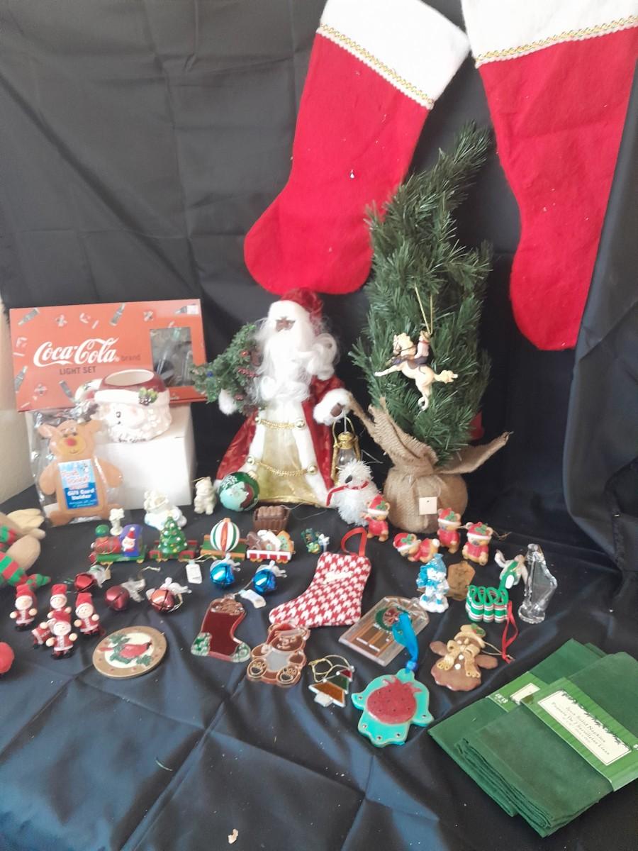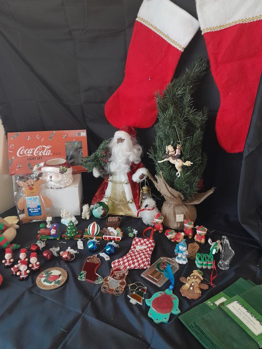CHRISTMAS DECORATIONS AND ORNAMENTS, SANTA, TREE, STOCKINGS, AND A VARIETY OF ORNAMENTS.