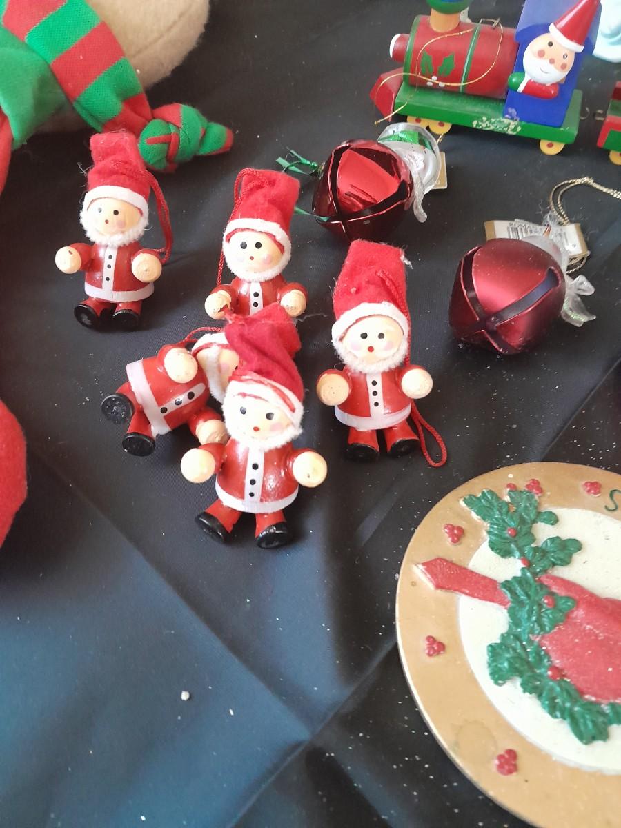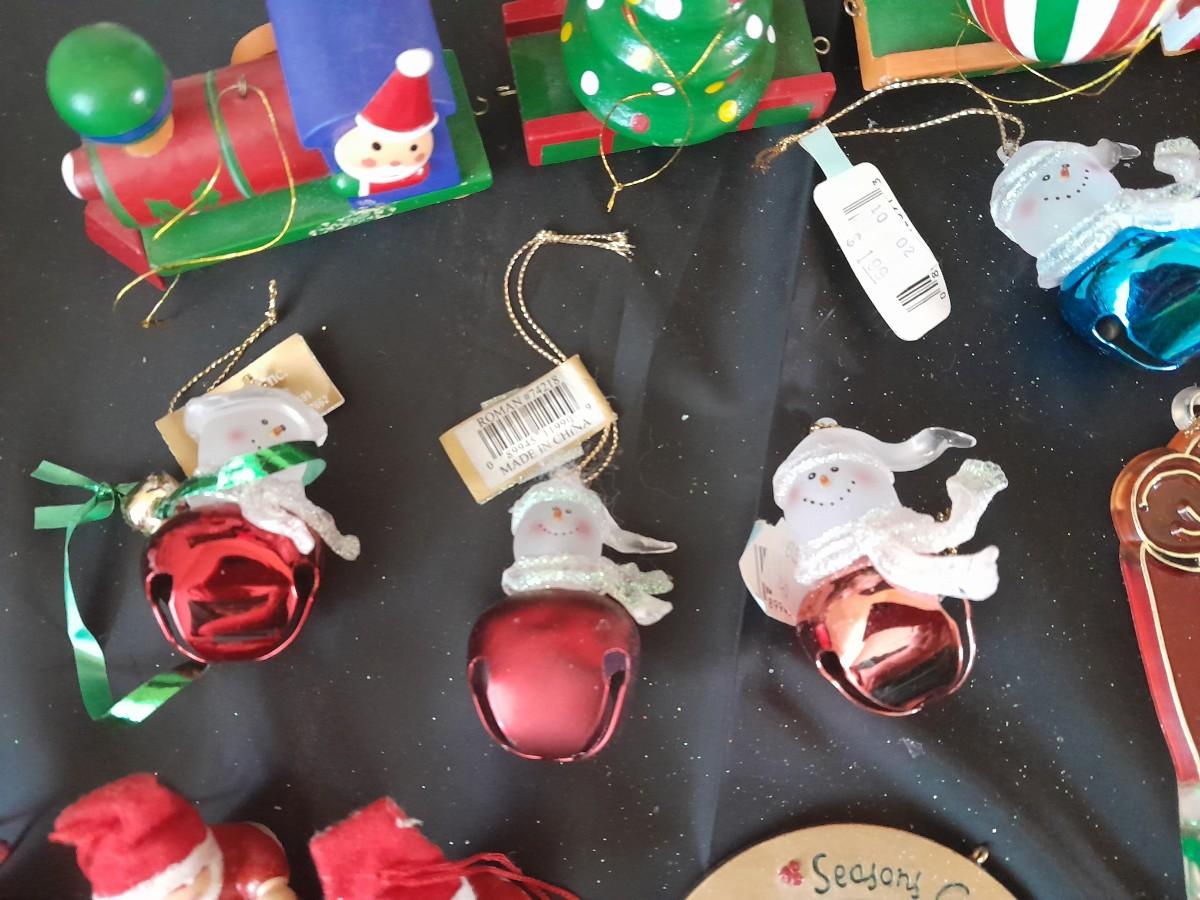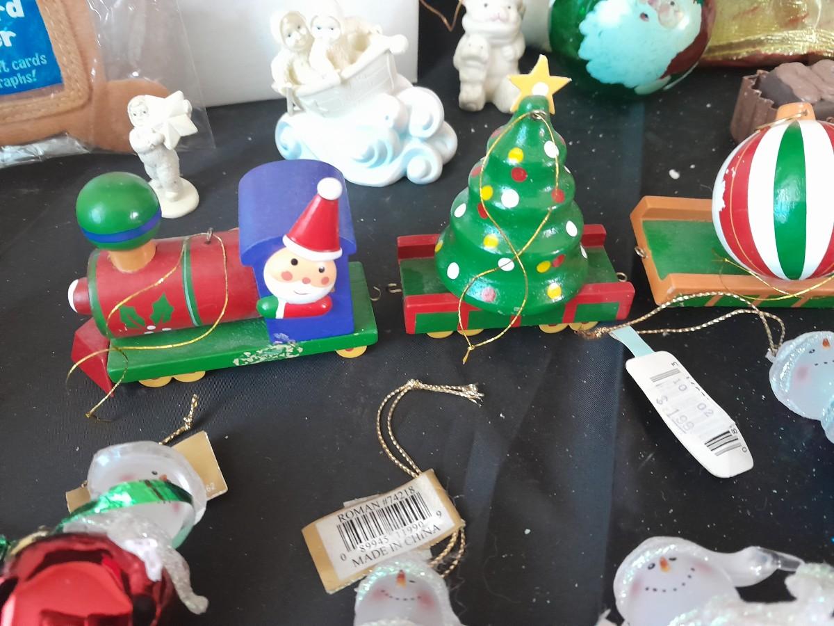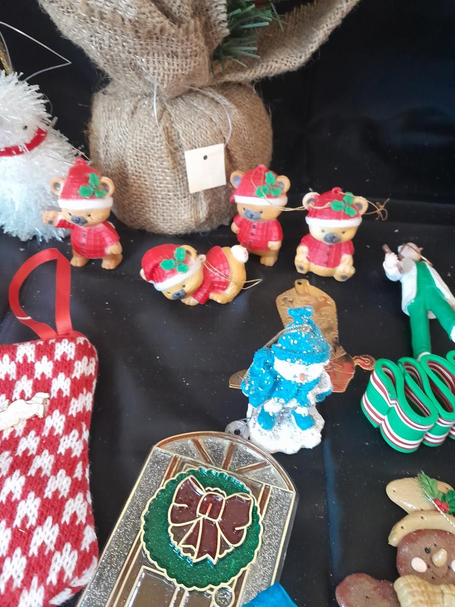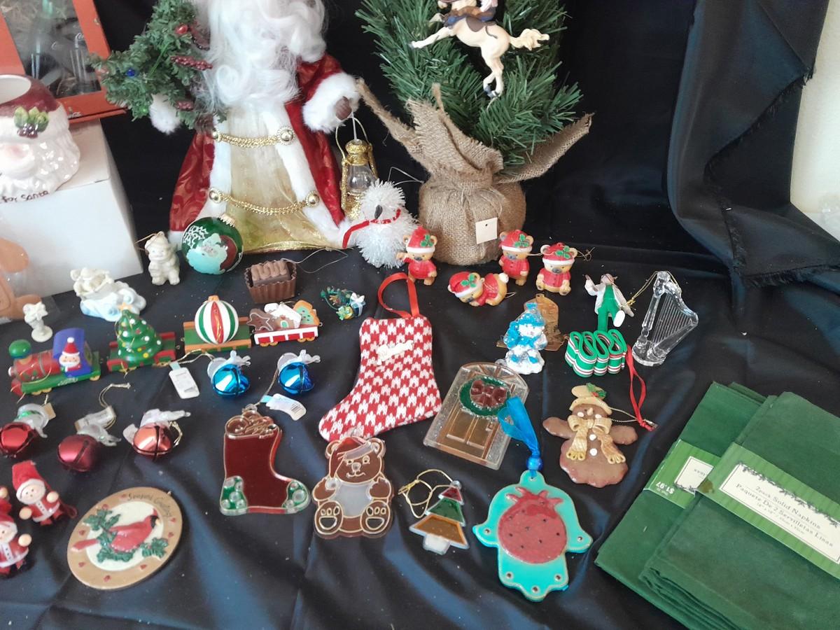 CHRISTMAS DECORATIONS AND ORNAMENTS, SANTA, TREE, STOCKINGS, AND A VARIETY OF ORNAMENTS.