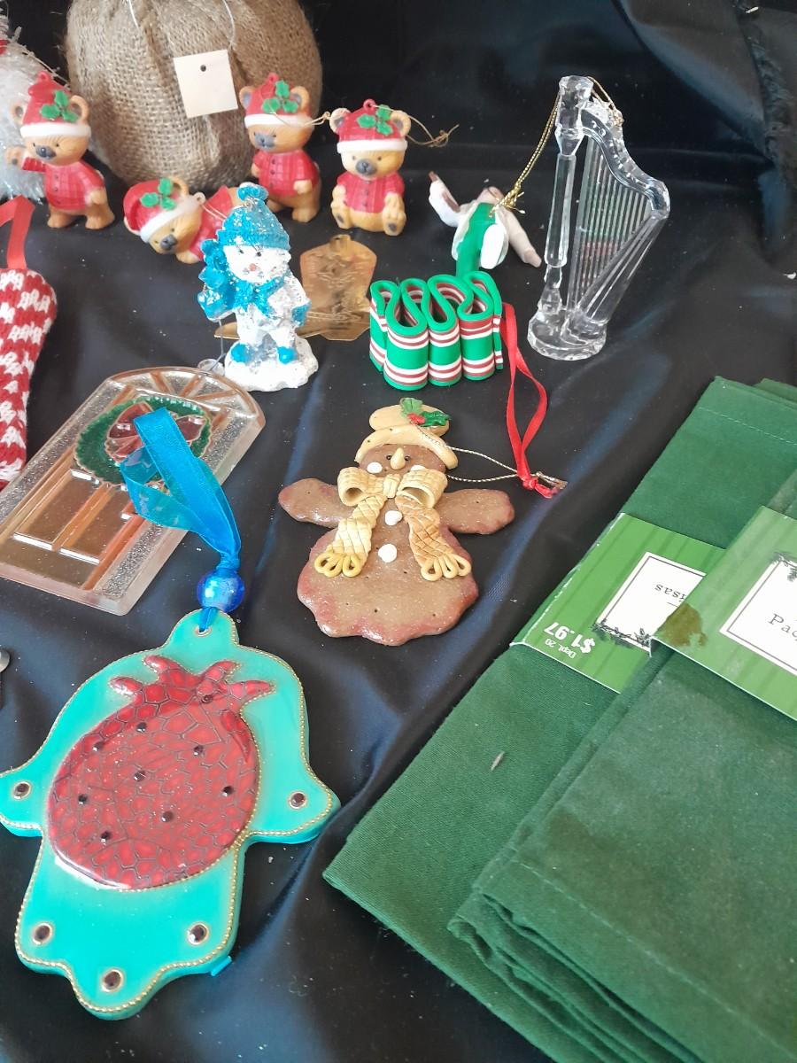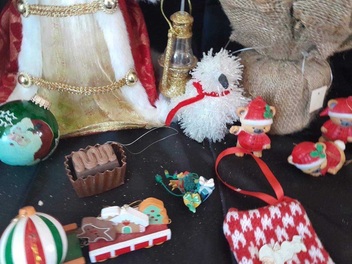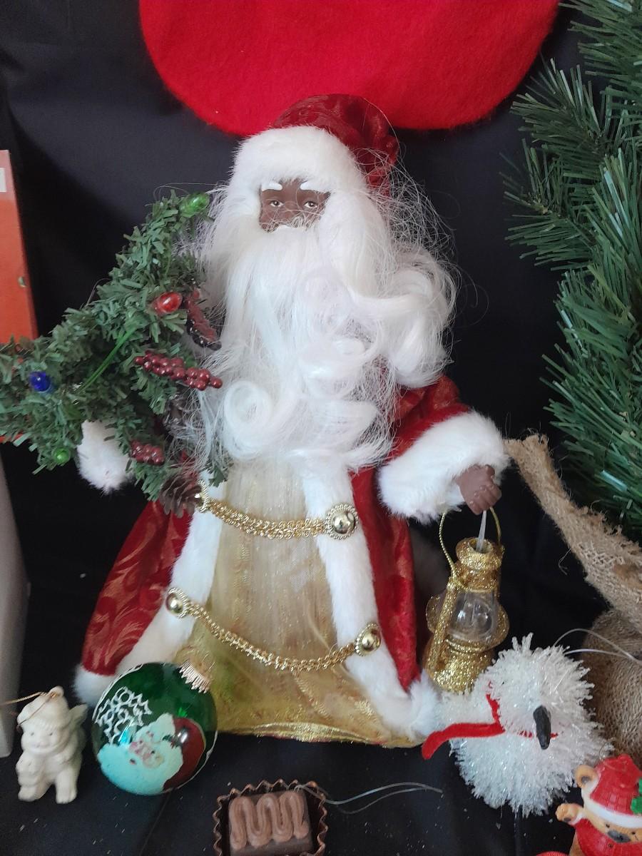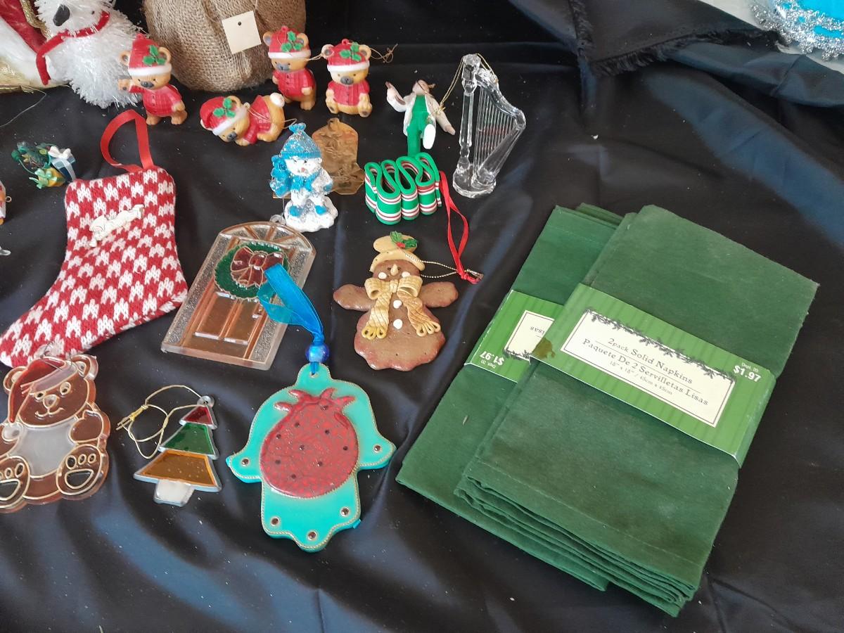 CHRISTMAS DECORATIONS AND ORNAMENTS, SANTA, TREE, STOCKINGS, AND A VARIETY OF ORNAMENTS.