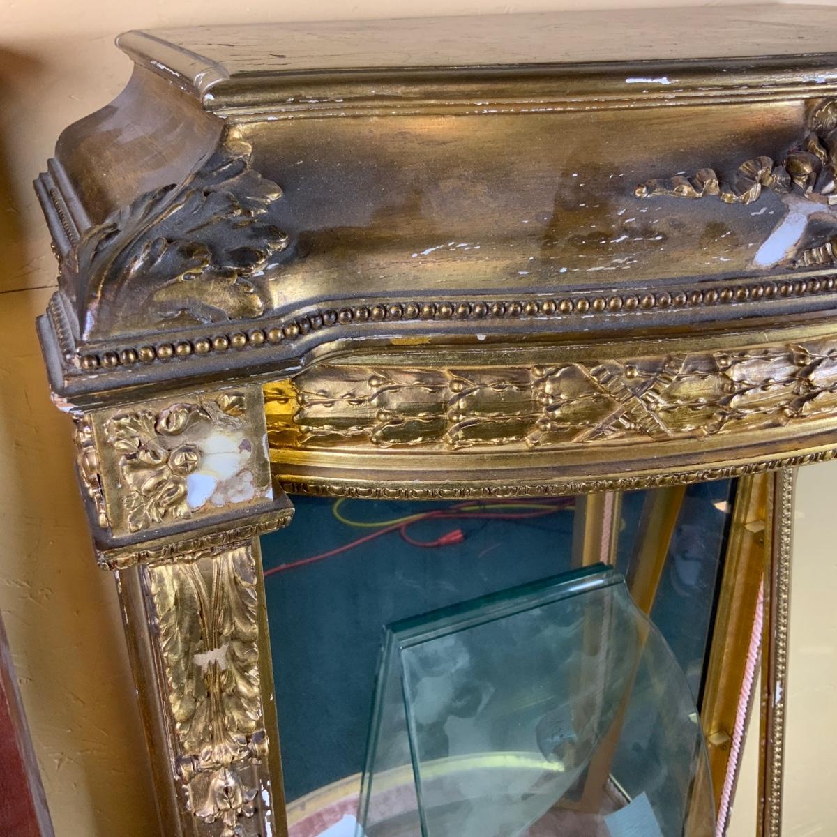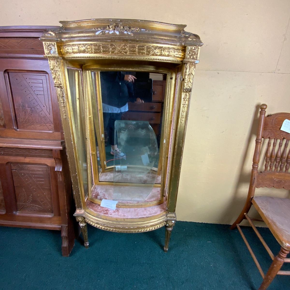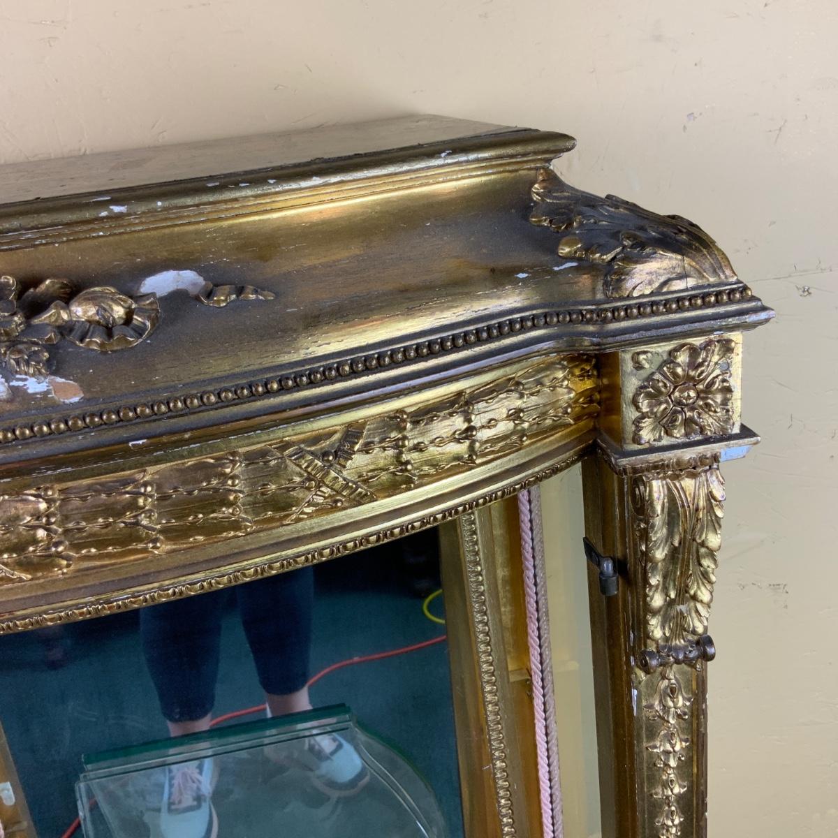 Gold Curved Front Vitrine with 2 shelves. Front glass needs to be replaced. Mirrored back. //::\\ Please see photos for details and condition. No attempt has been made to hide any imperfections. All items listed in this auction are warehouse items, and need to be cleaned. A majority of the items need restoration as well. All items are sold AS IS and WITHOUT GUARANTEE. If you are uncertain about an item, DO NOT BID. Due to the nature of this online auction in-person inspection is HIGHLY recommended. All Sales are FINAL. Pick Up Times are FIRM. Please confirm with your own schedule that you can pick up in the scheduled times listed in the Terms and Conditions. Any questions please message the auctioneer. DO NOT Contact The Harp Gallery.